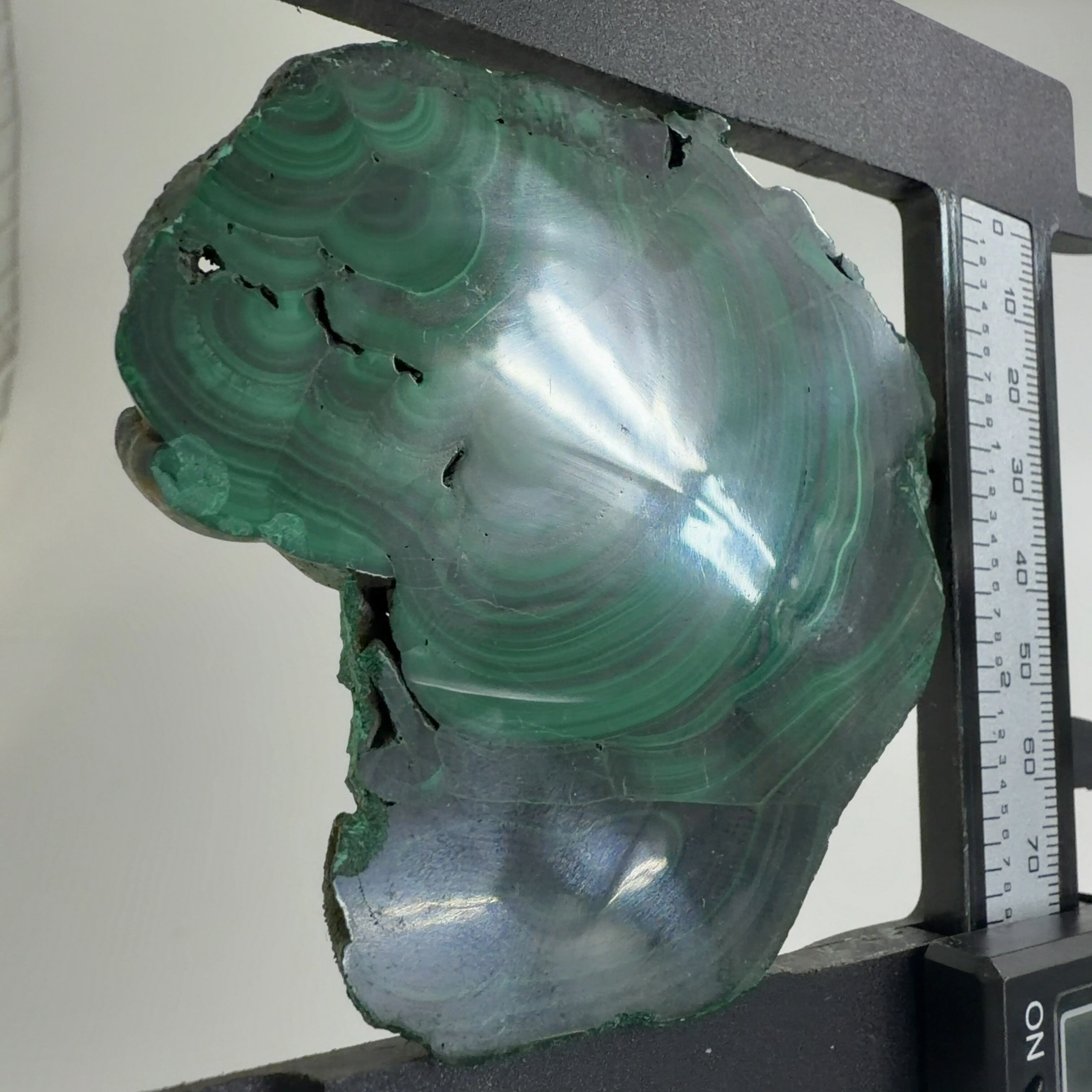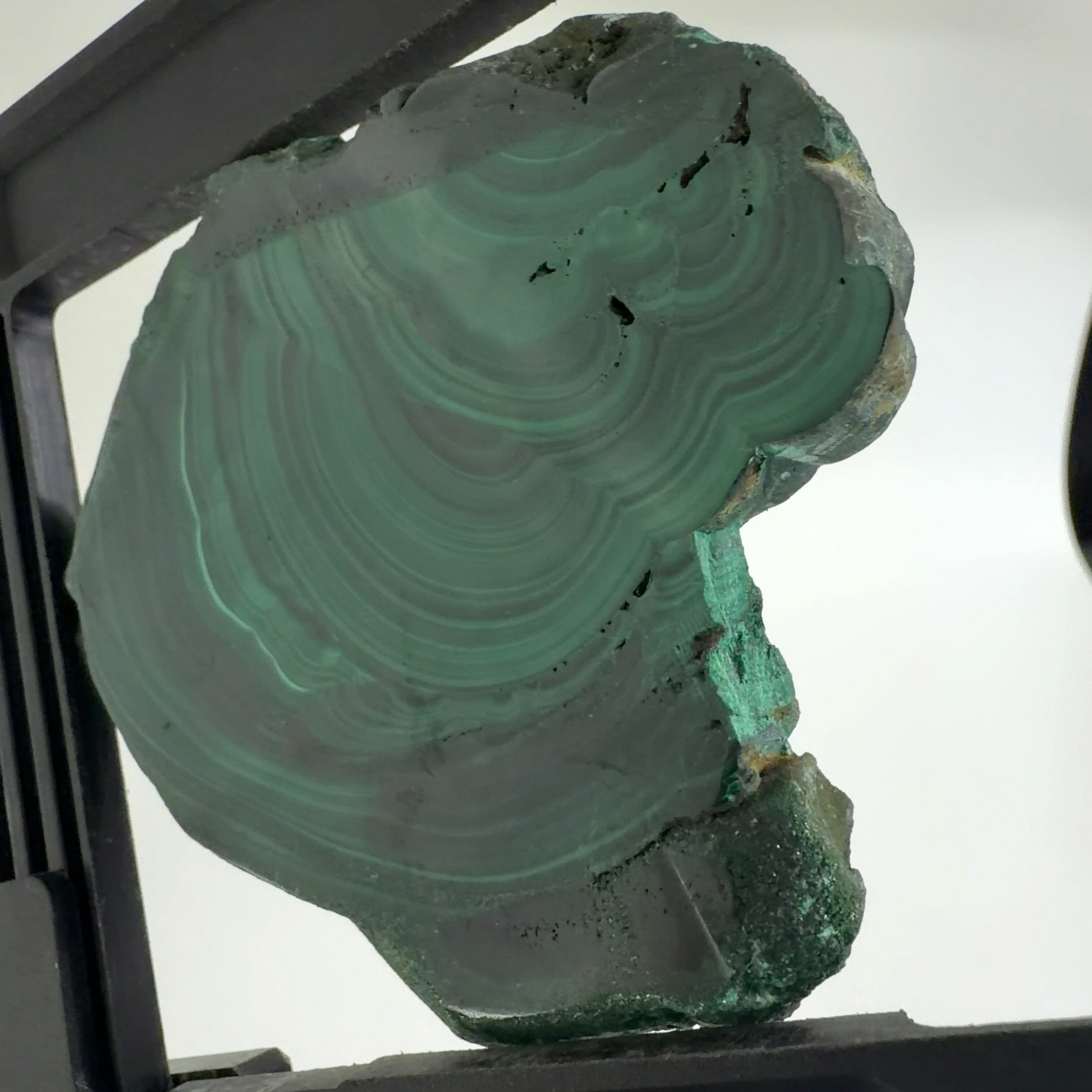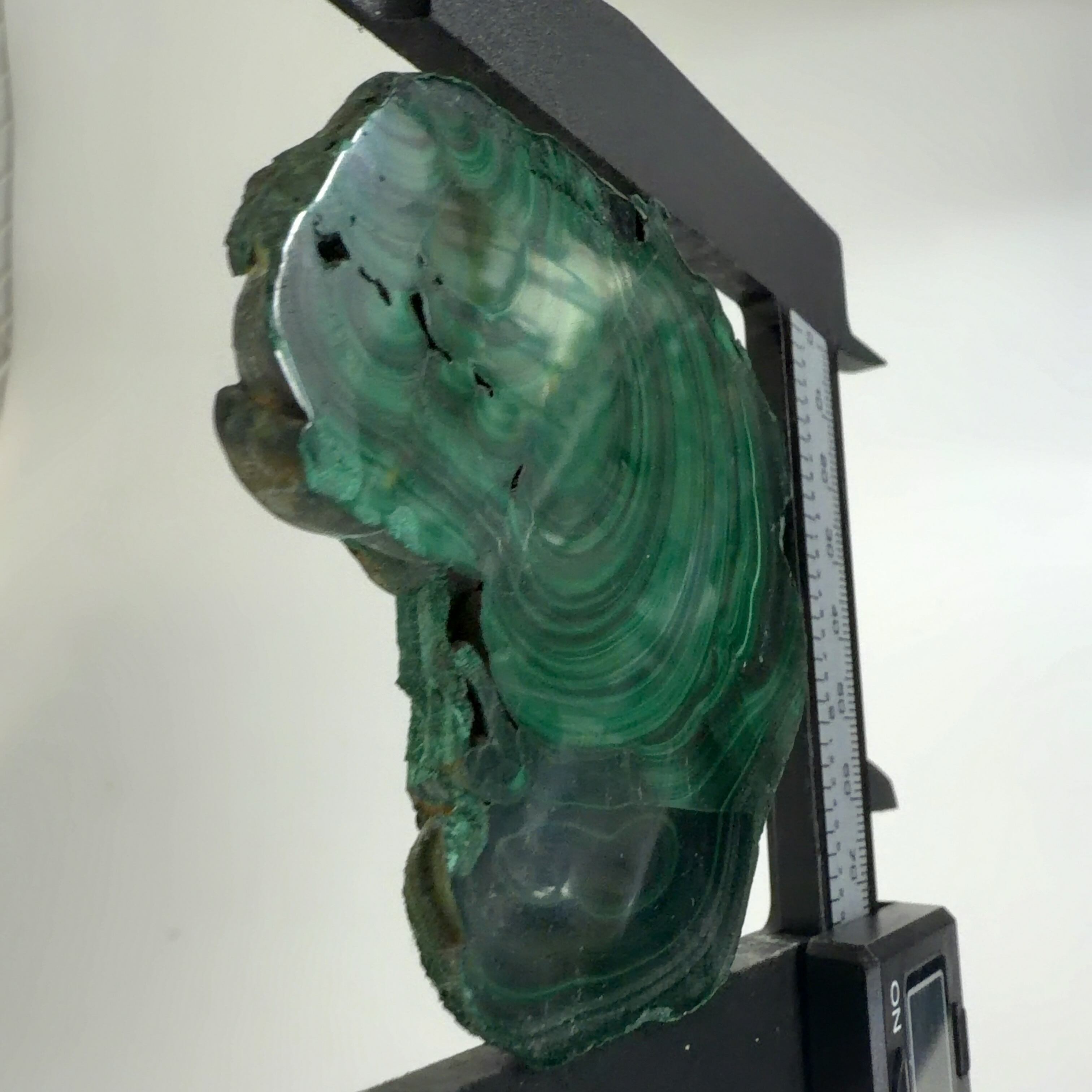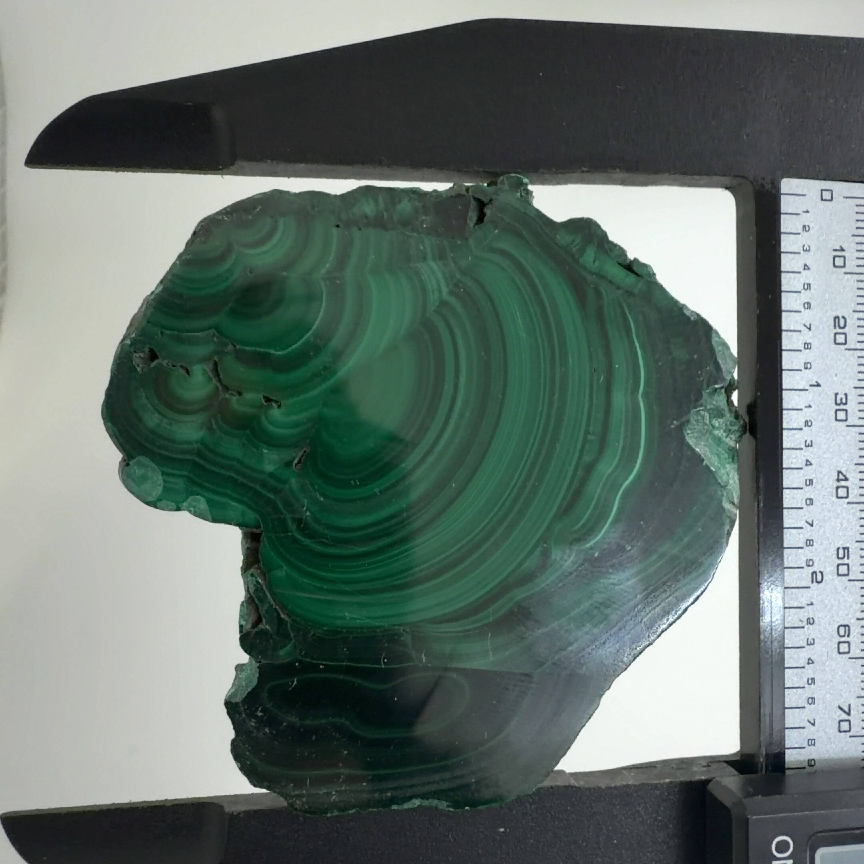 水に溶けた黄銅鉱と水に溶けた二酸化炭素が反応してできる鉱物で、斜めから光を反射させると孔雀の羽のように見えるので和名は孔雀石と名付けられています。