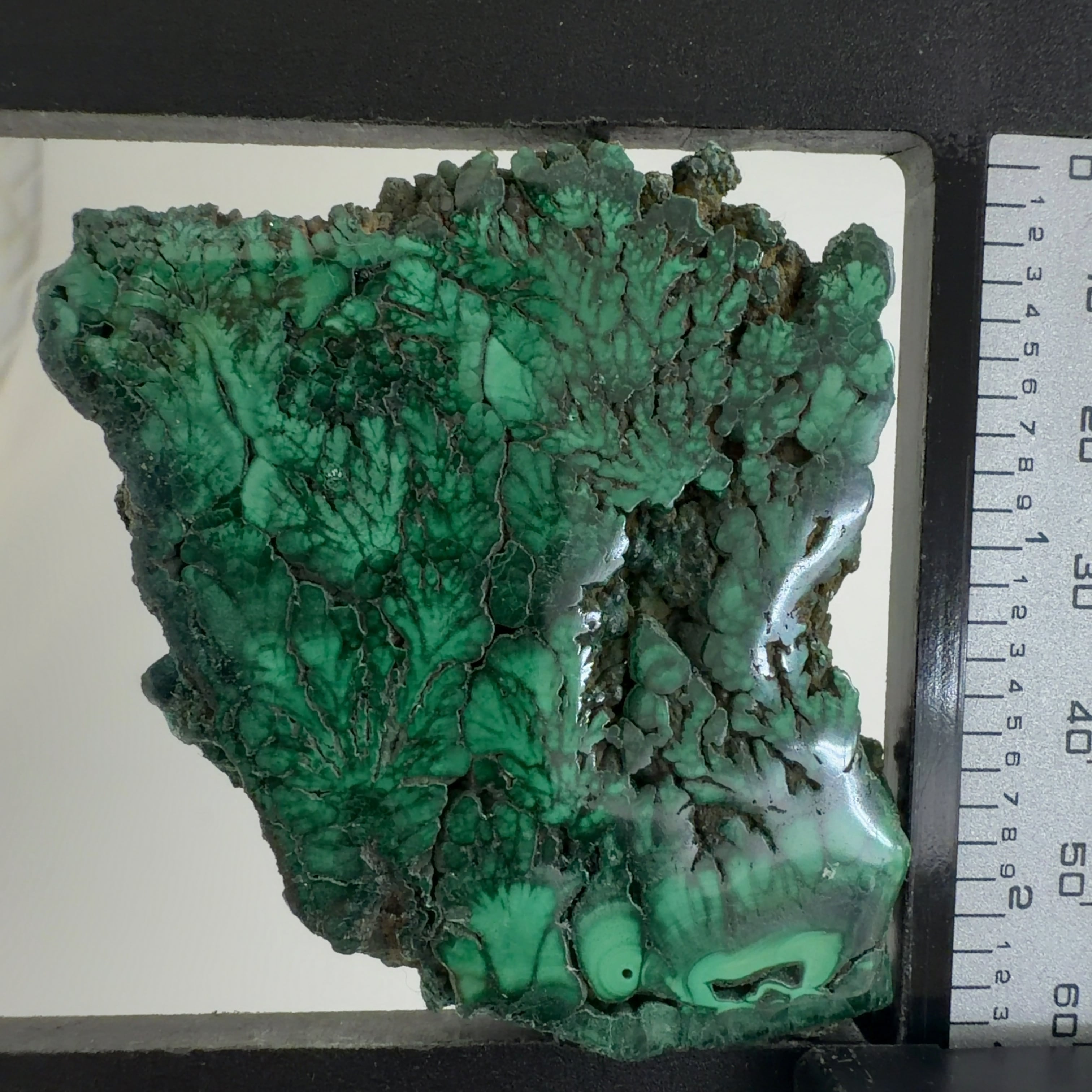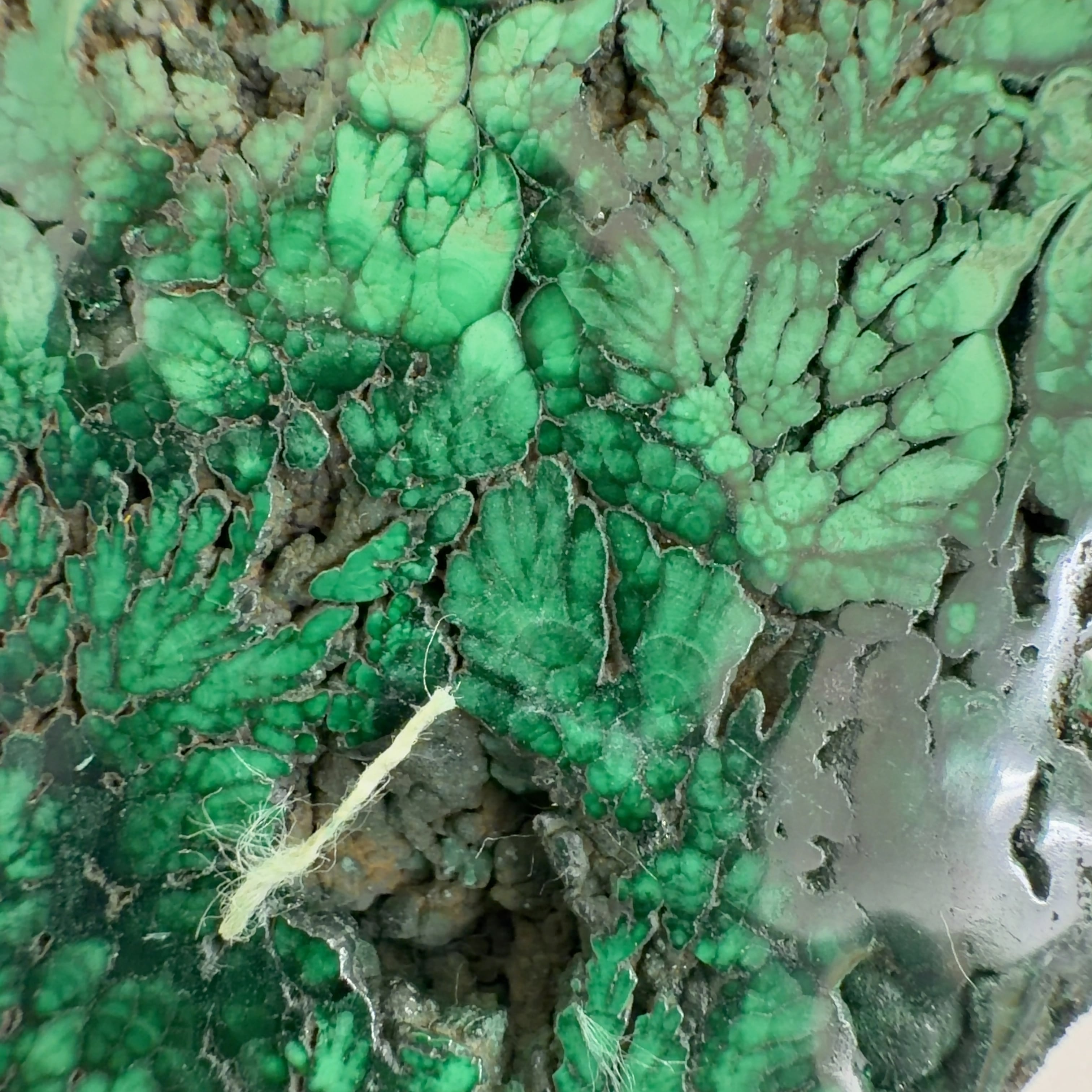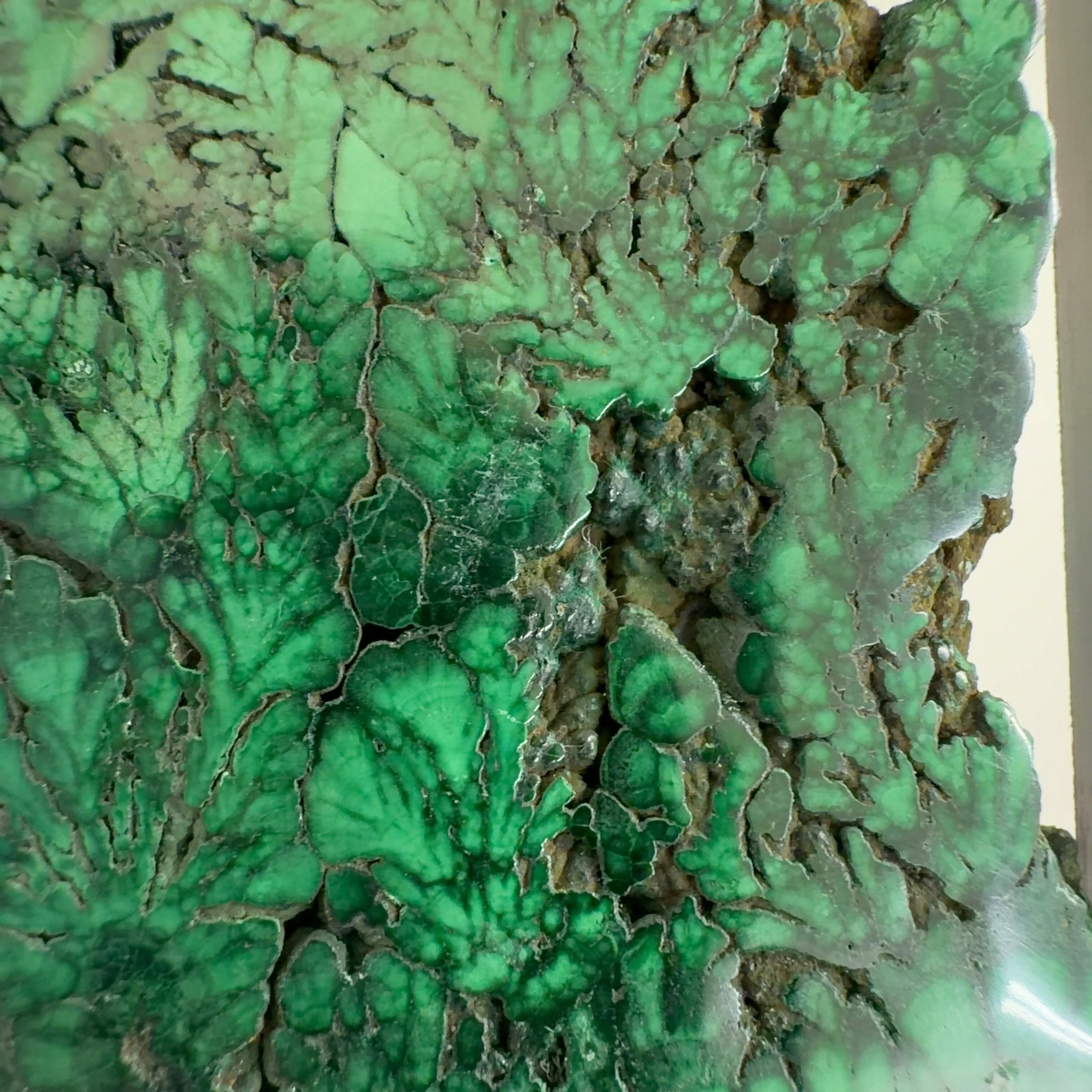 水に溶けた黄銅鉱と水に溶けた二酸化炭素が反応してできる鉱物で、斜めから光を反射させると孔雀の羽のように見えるので和名は孔雀石と名付けられています。