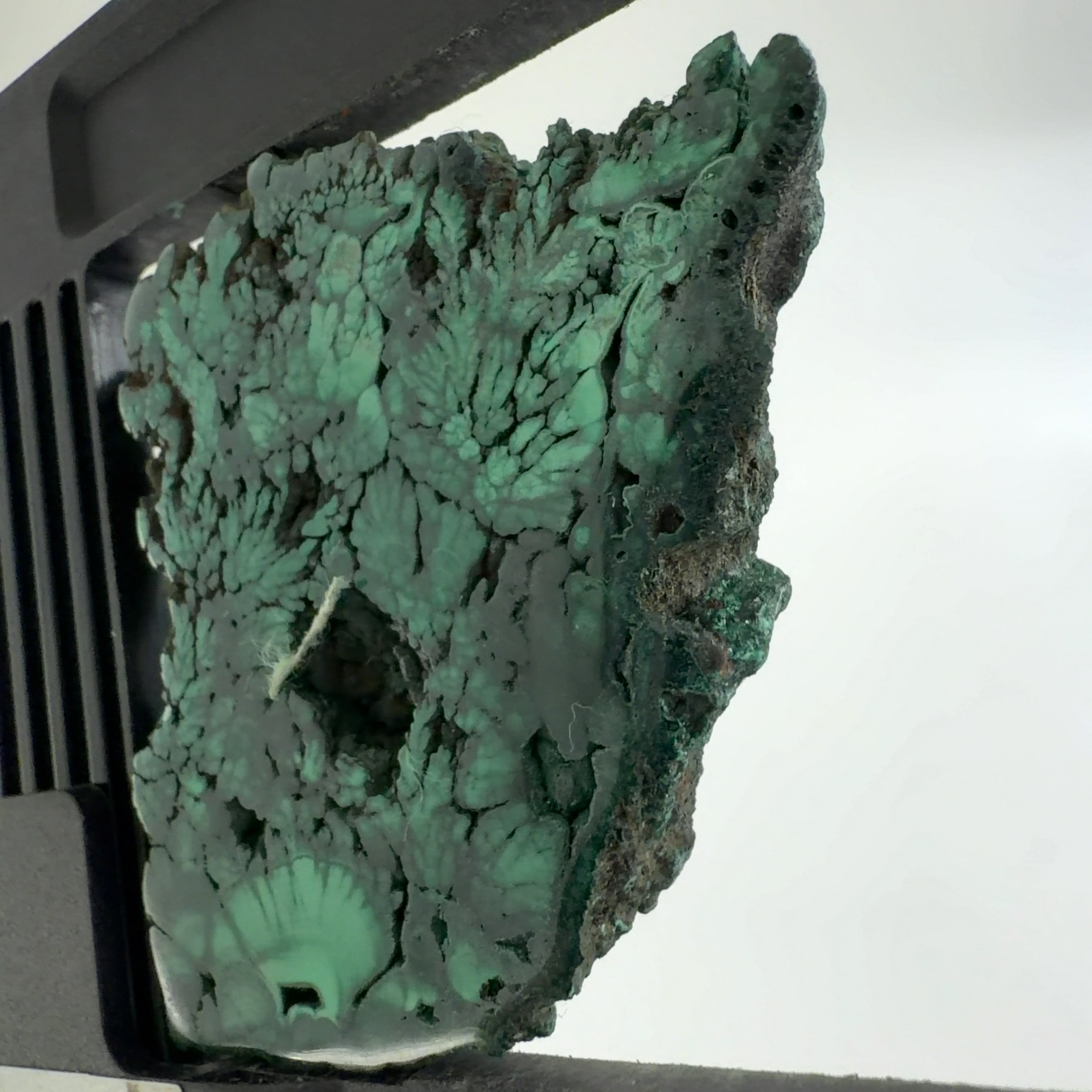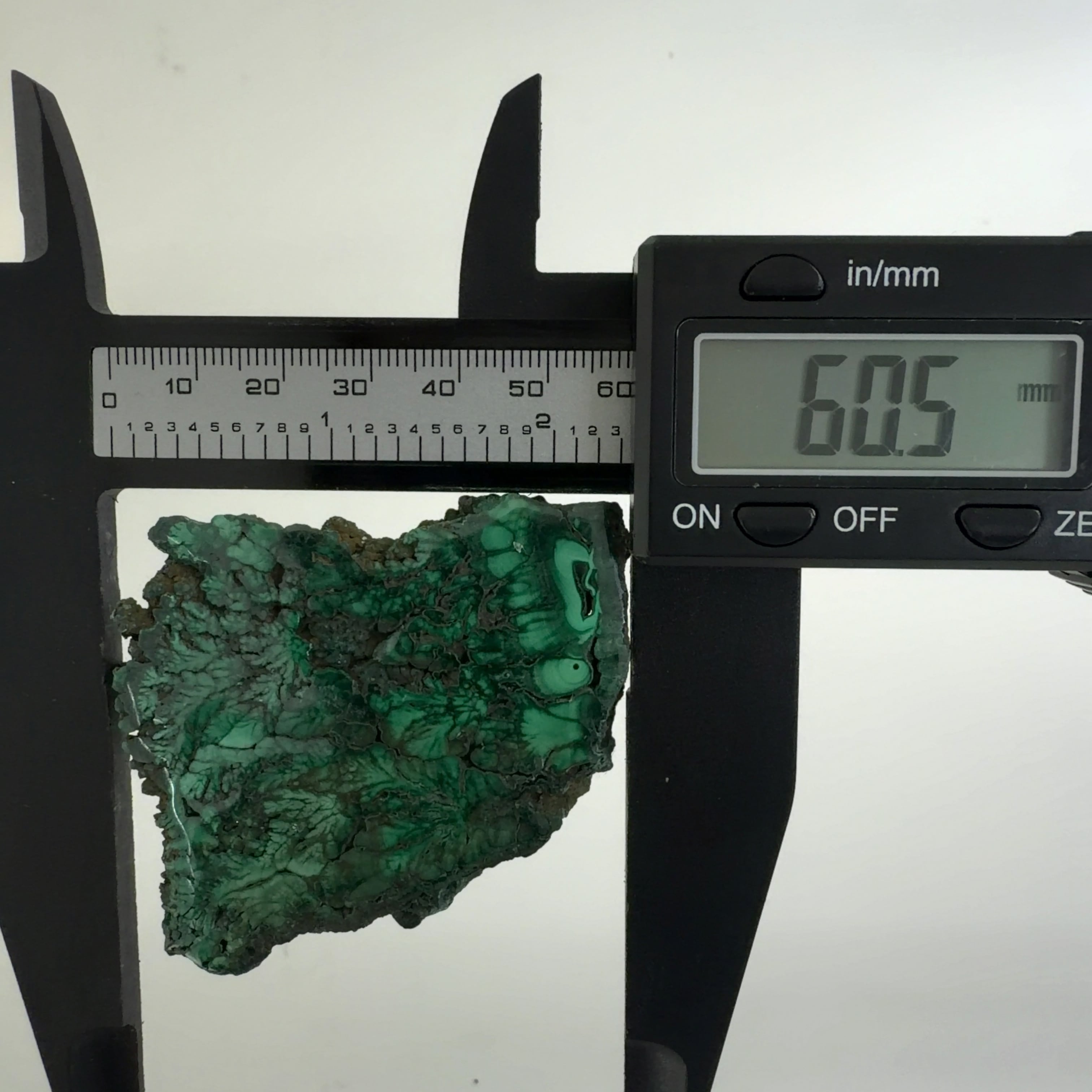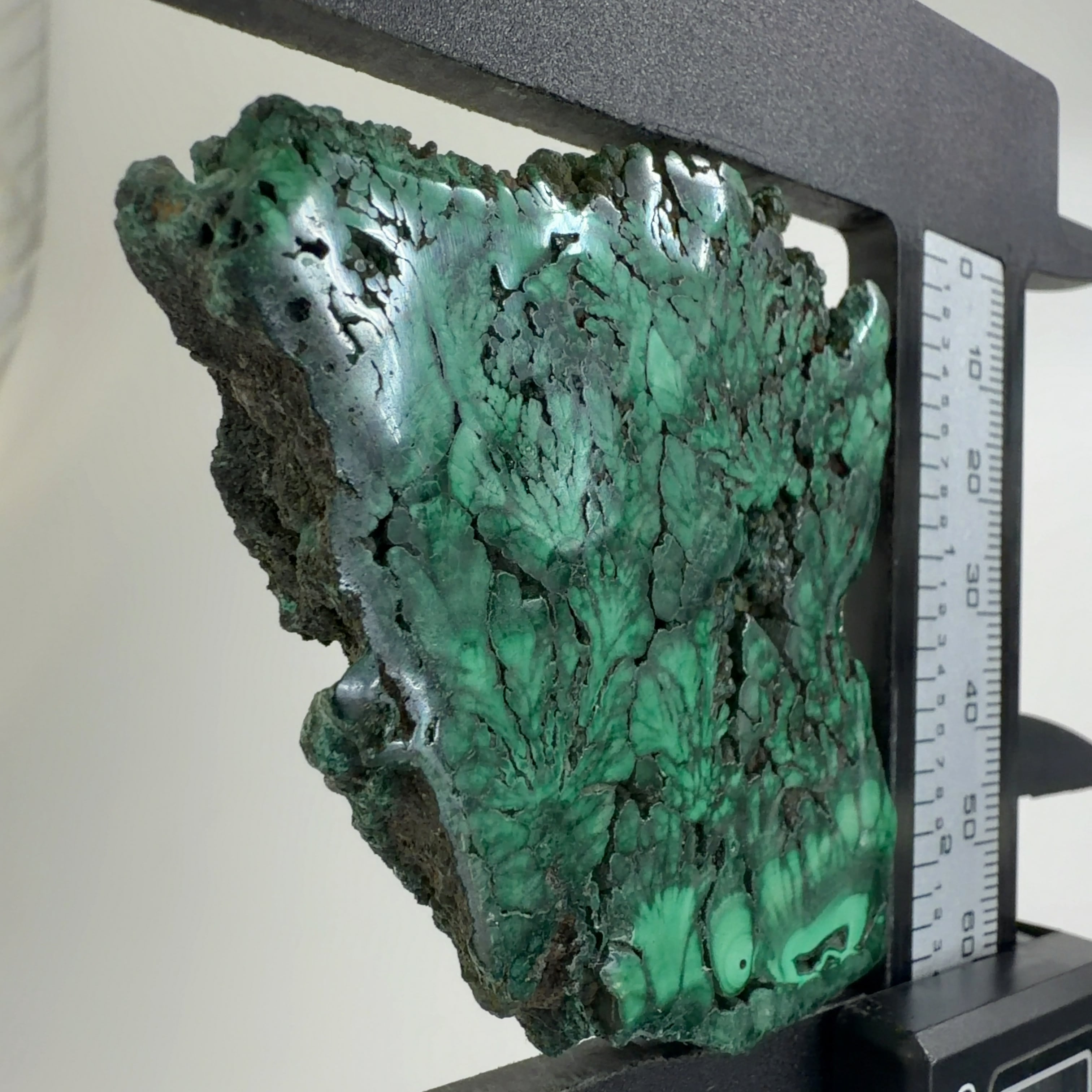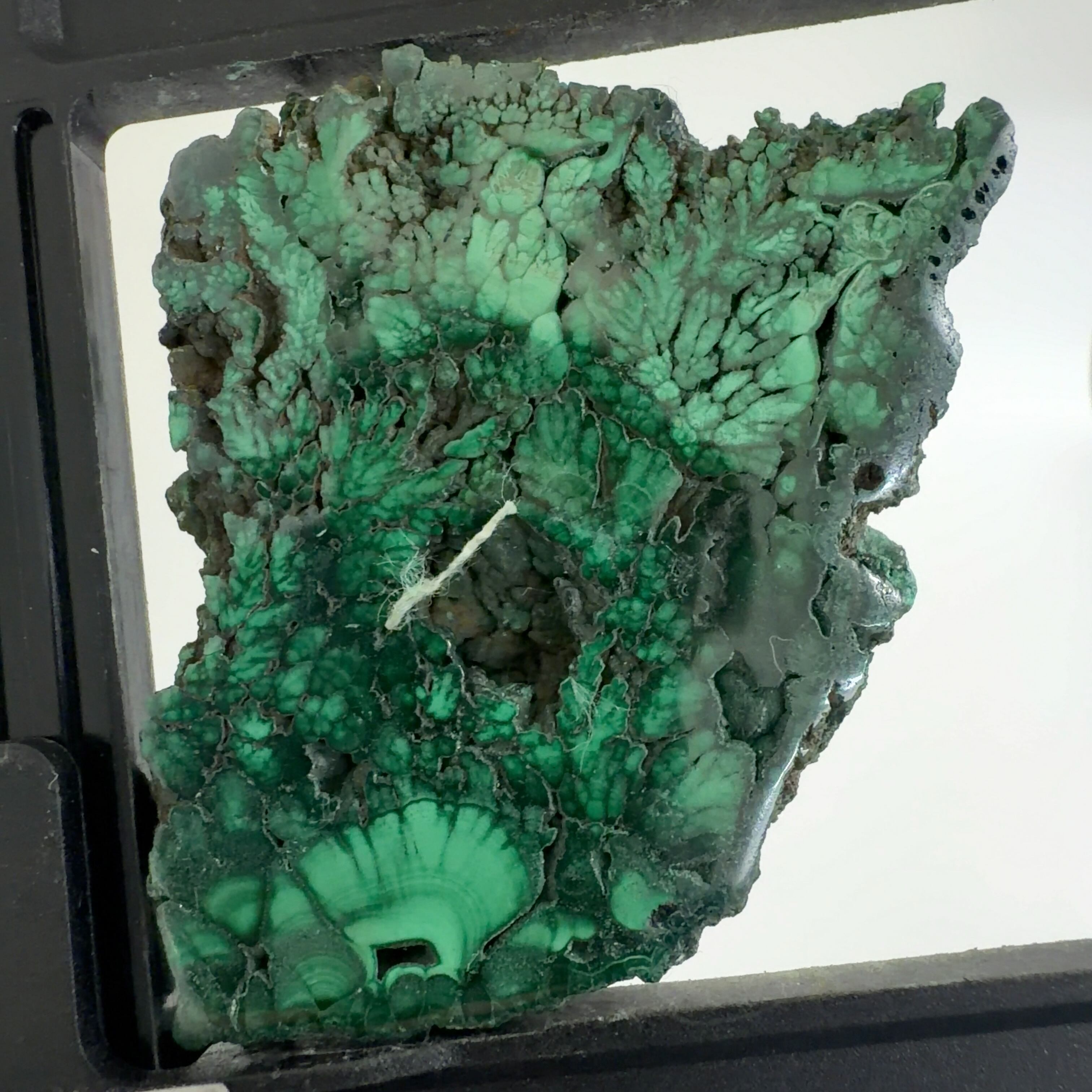 水に溶けた黄銅鉱と水に溶けた二酸化炭素が反応してできる鉱物で、斜めから光を反射させると孔雀の羽のように見えるので和名は孔雀石と名付けられています。