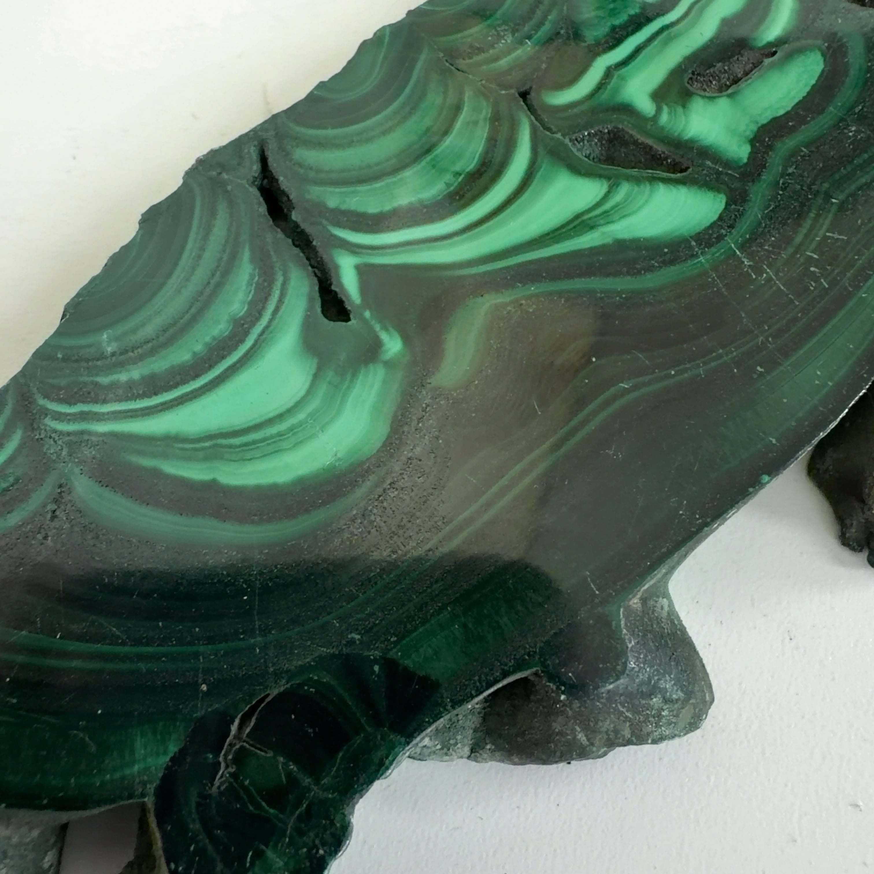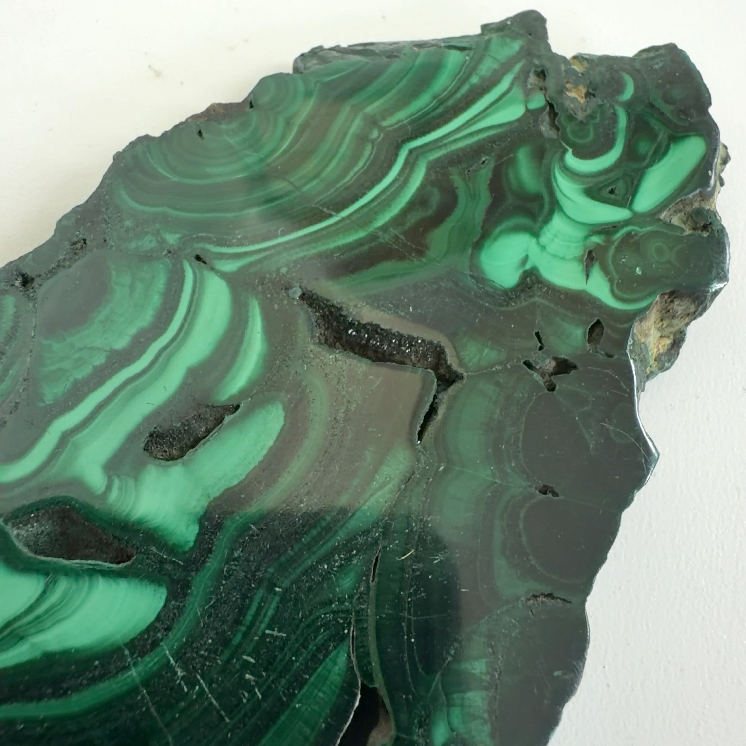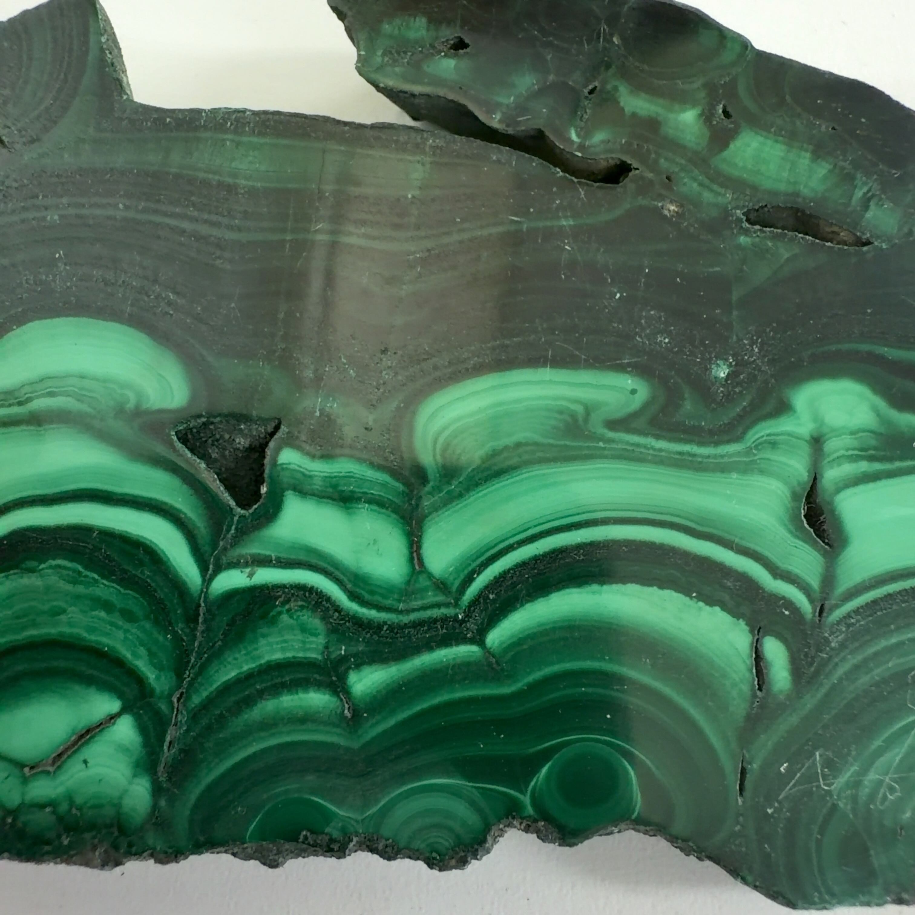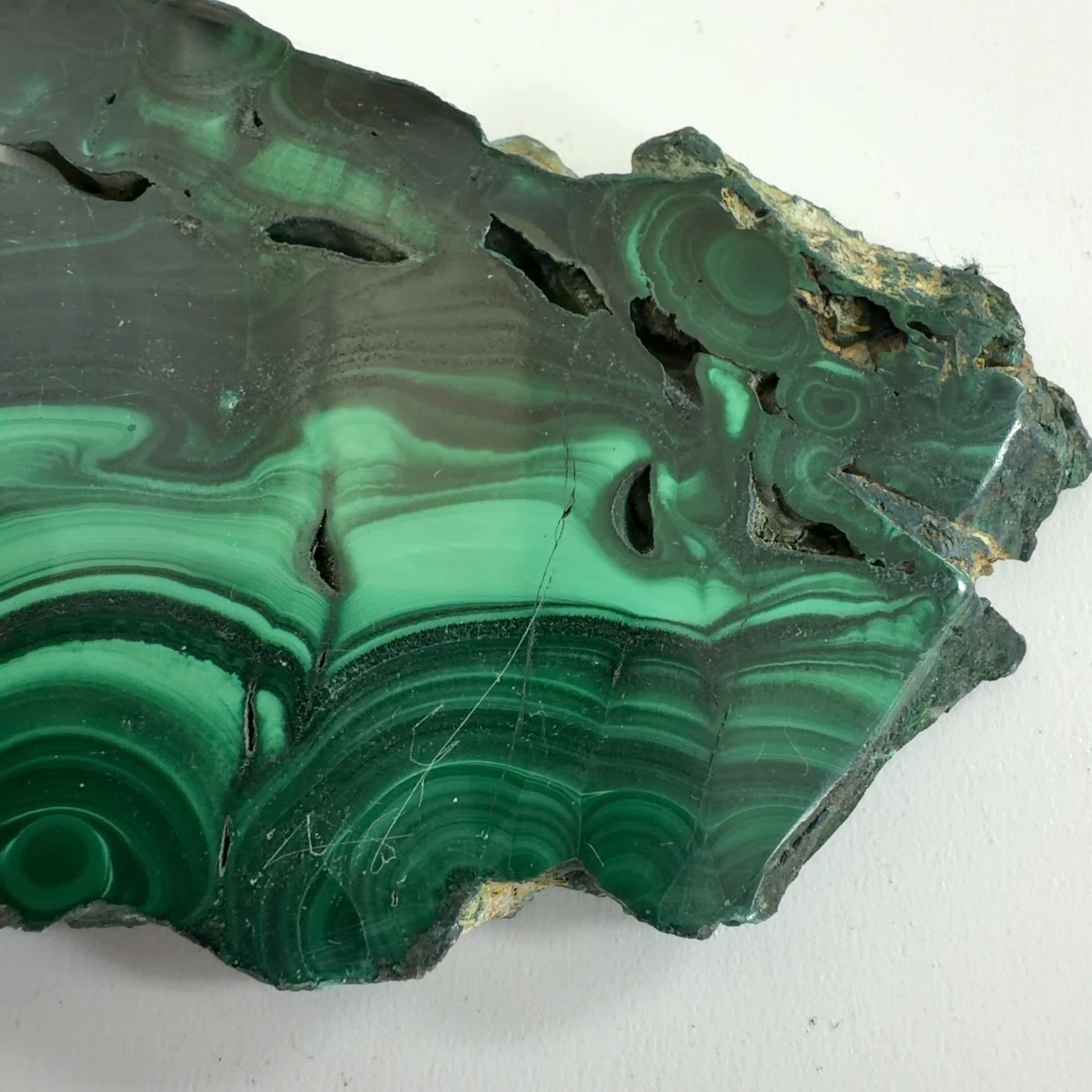 水に溶けた黄銅鉱と水に溶けた二酸化炭素が反応してできる鉱物で、斜めから光を反射させると孔雀の羽のように見えるので和名は孔雀石と名付けられています。