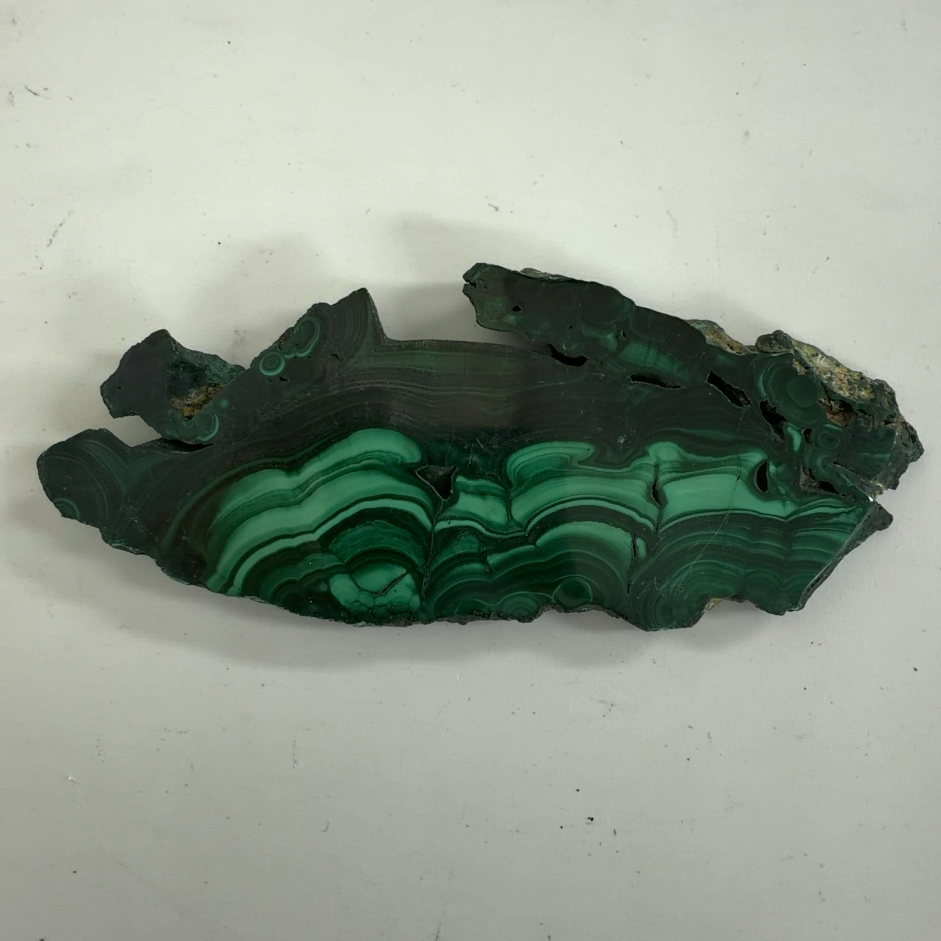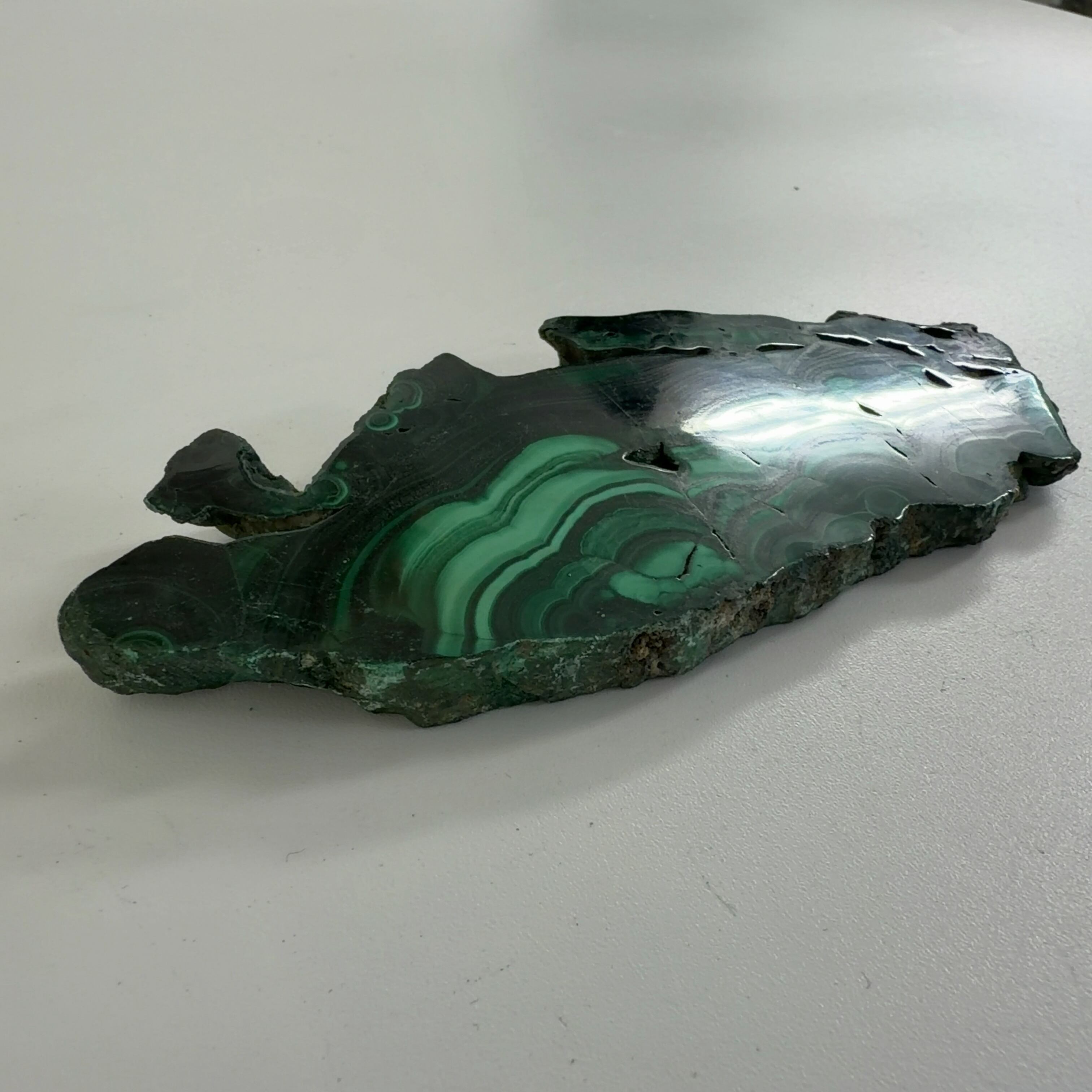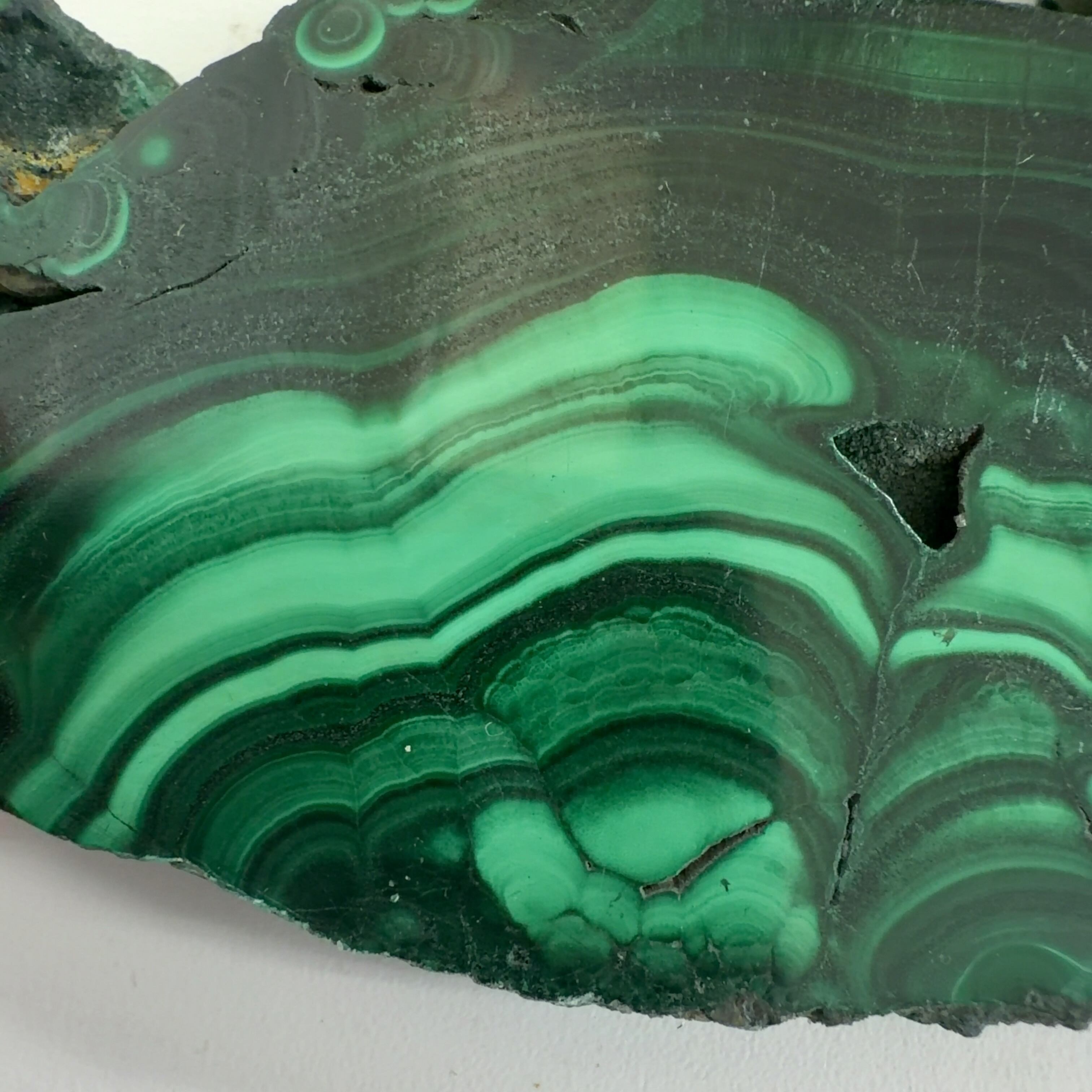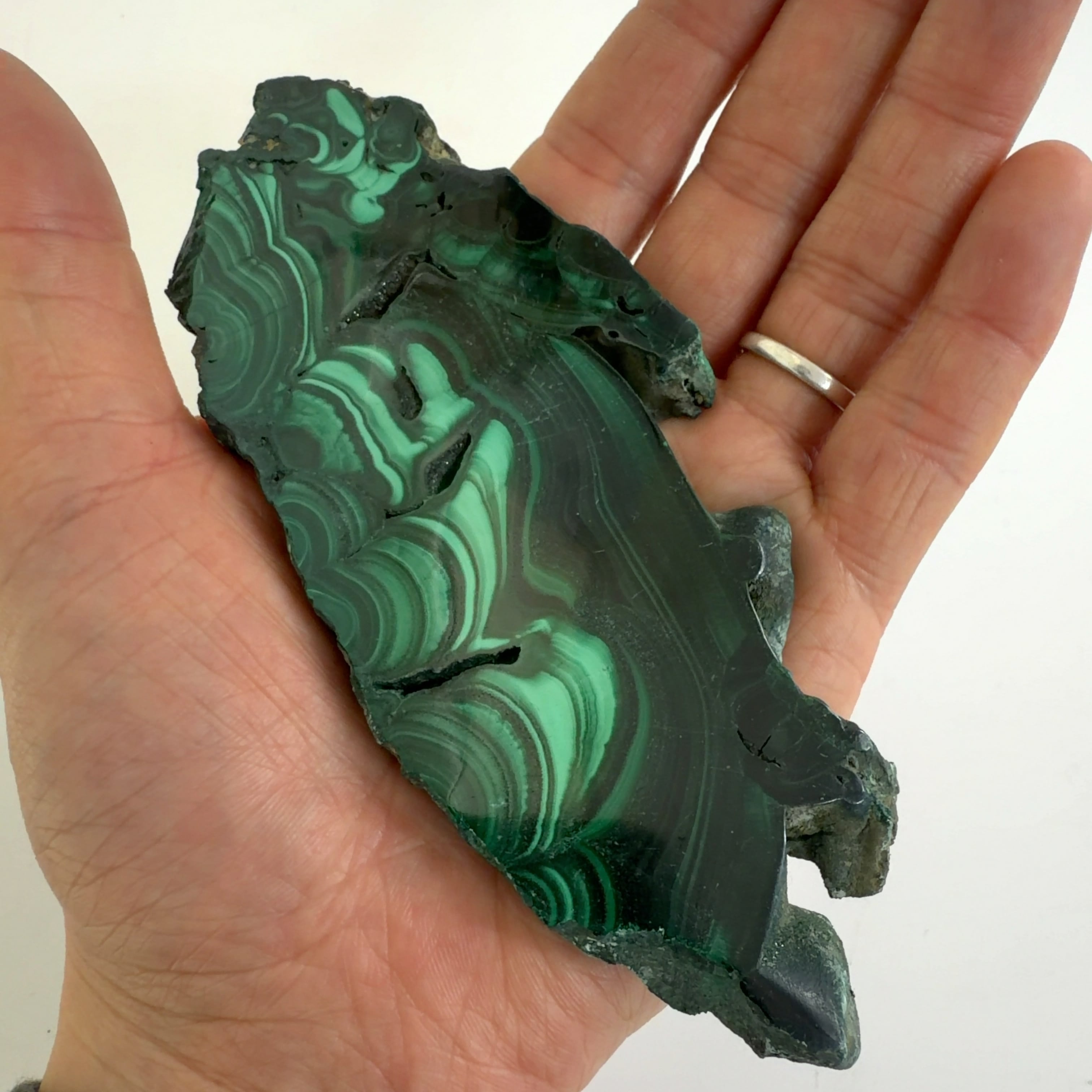水に溶けた黄銅鉱と水に溶けた二酸化炭素が反応してできる鉱物で、斜めから光を反射させると孔雀の羽のように見えるので和名は孔雀石と名付けられています。