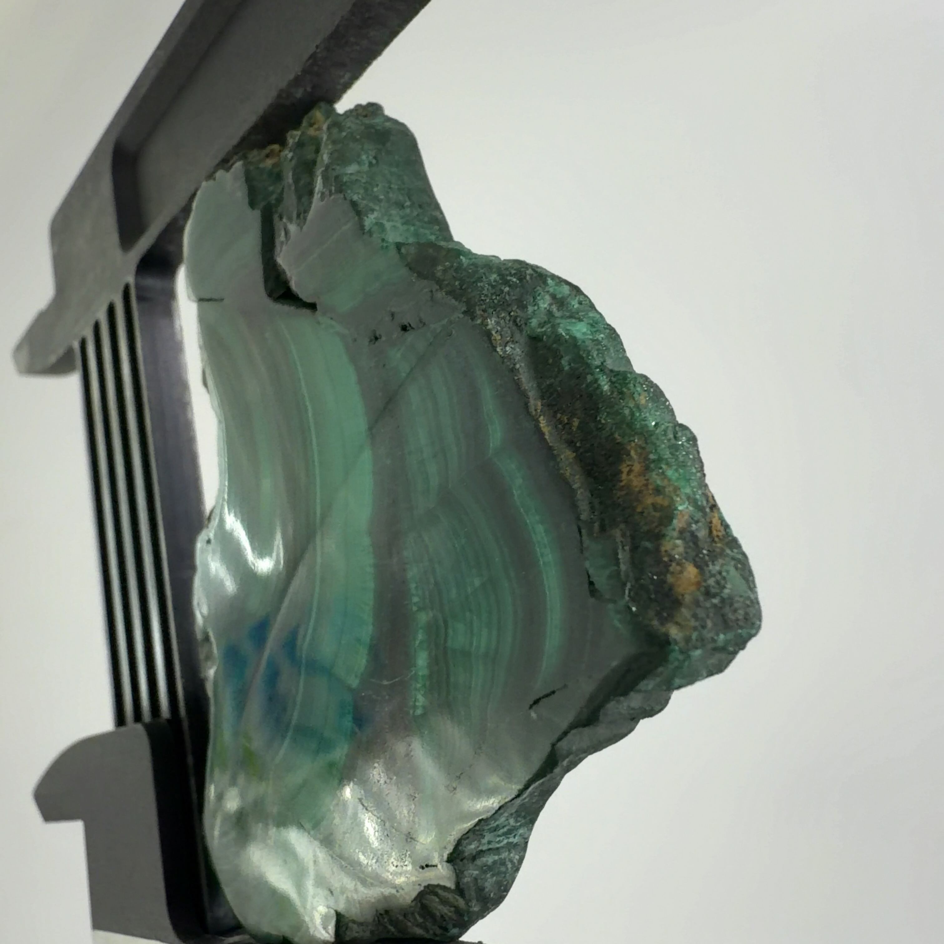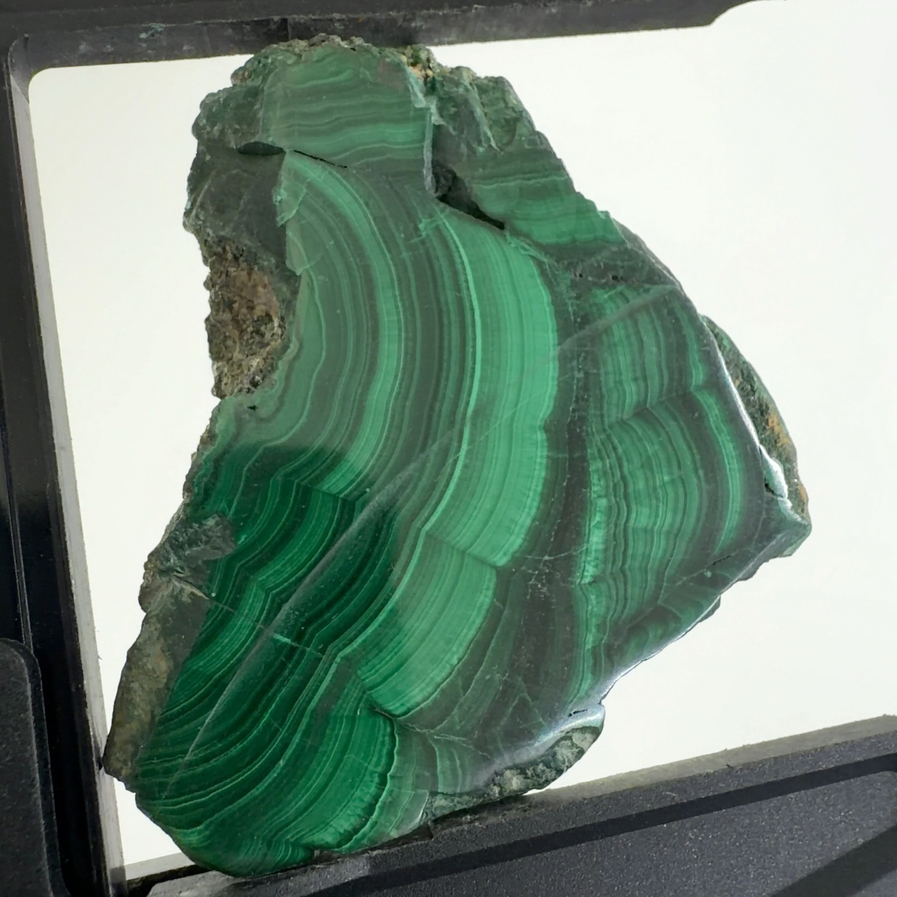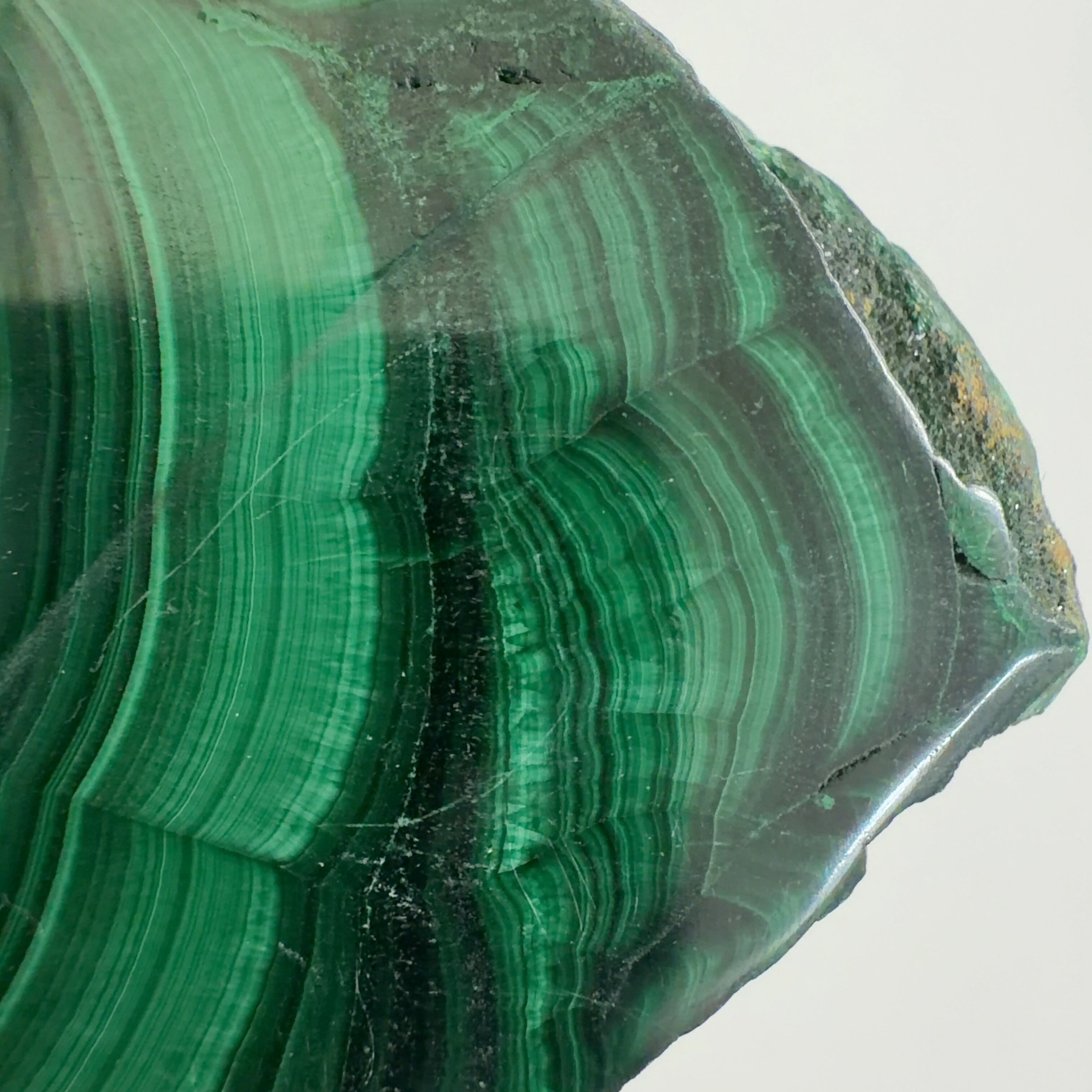 水に溶けた黄銅鉱と水に溶けた二酸化炭素が反応してできる鉱物で、斜めから光を反射させると孔雀の羽のように見えるので和名は孔雀石と名付けられています。