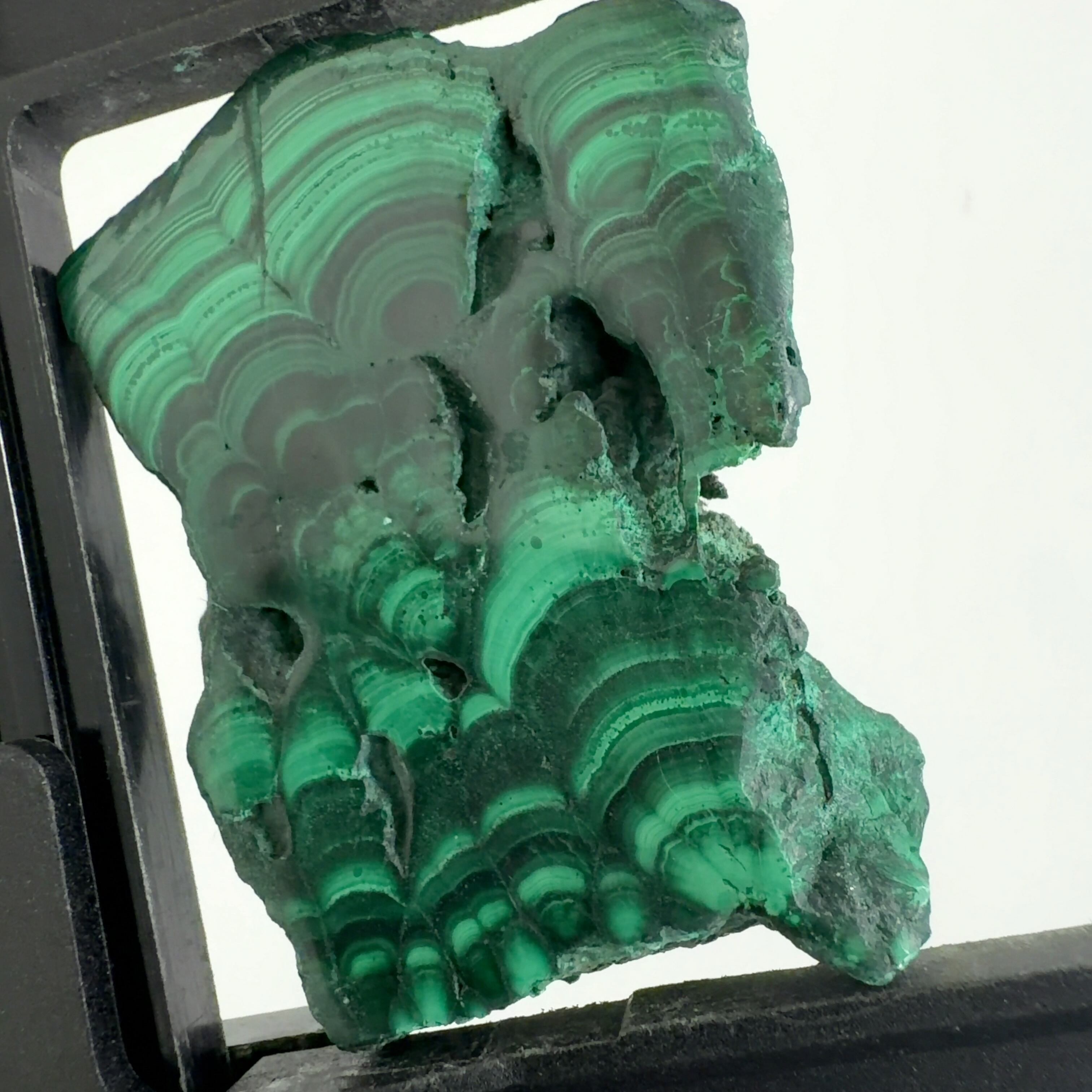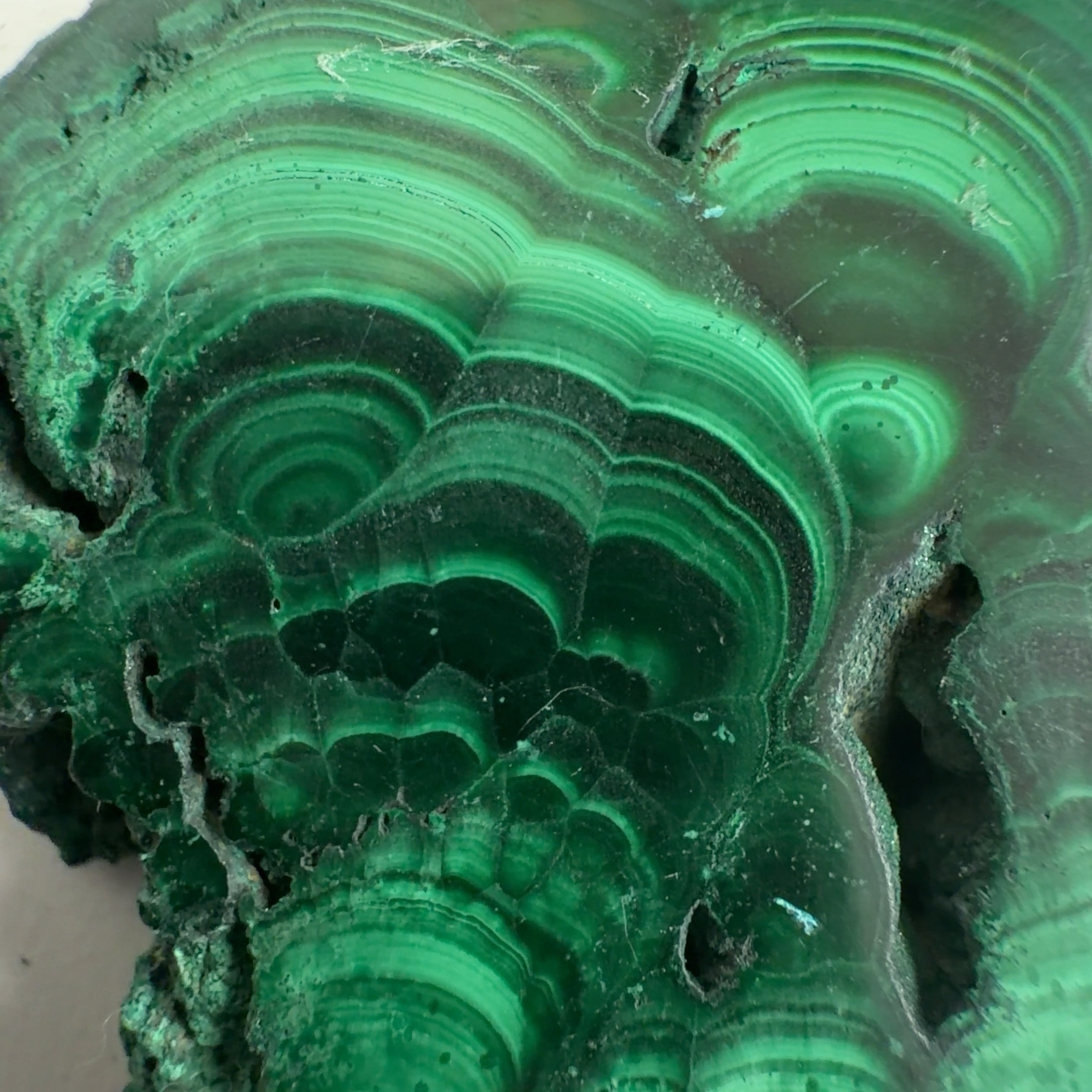 水に溶けた黄銅鉱と水に溶けた二酸化炭素が反応してできる鉱物で、斜めから光を反射させると孔雀の羽のように見えるので和名は孔雀石と名付けられています。