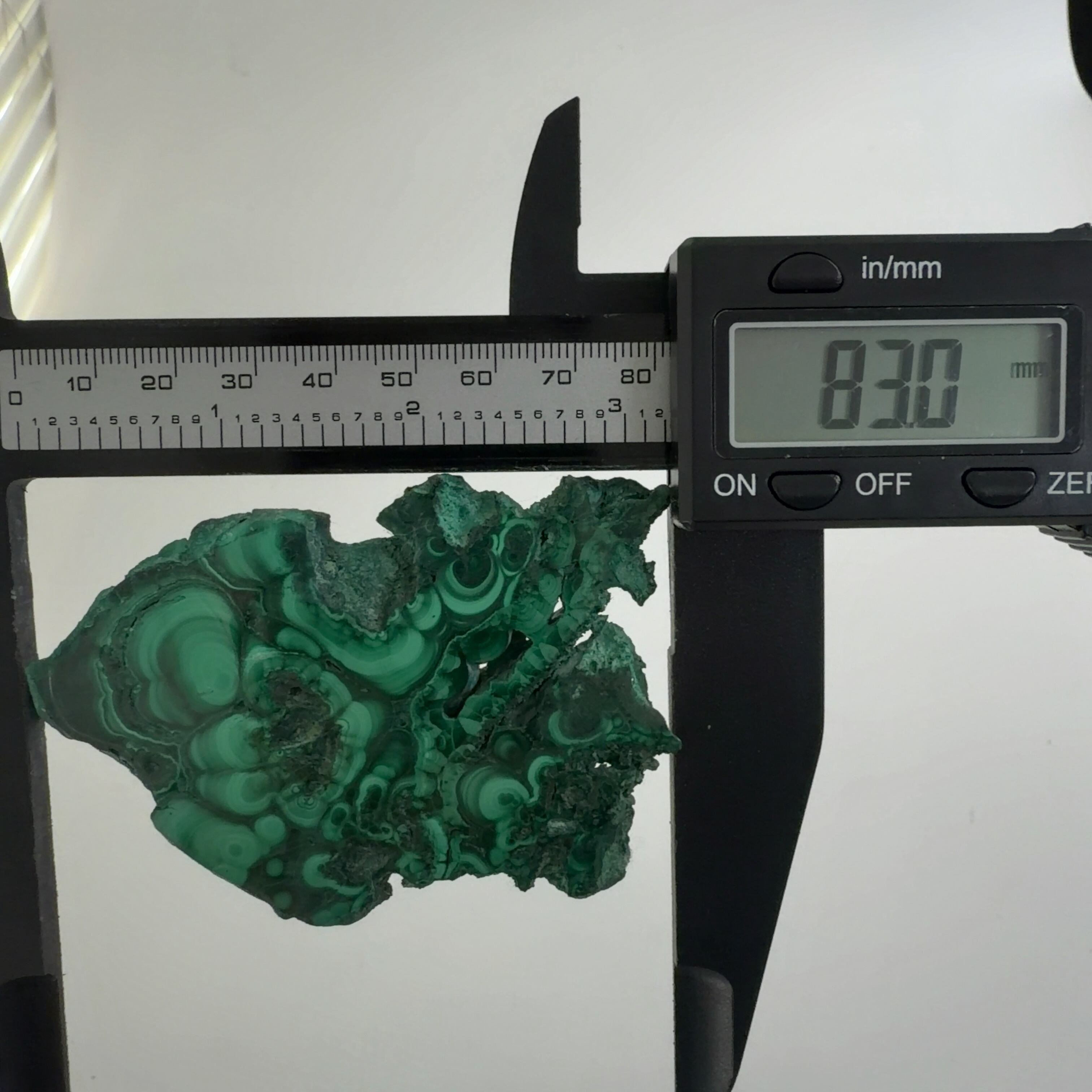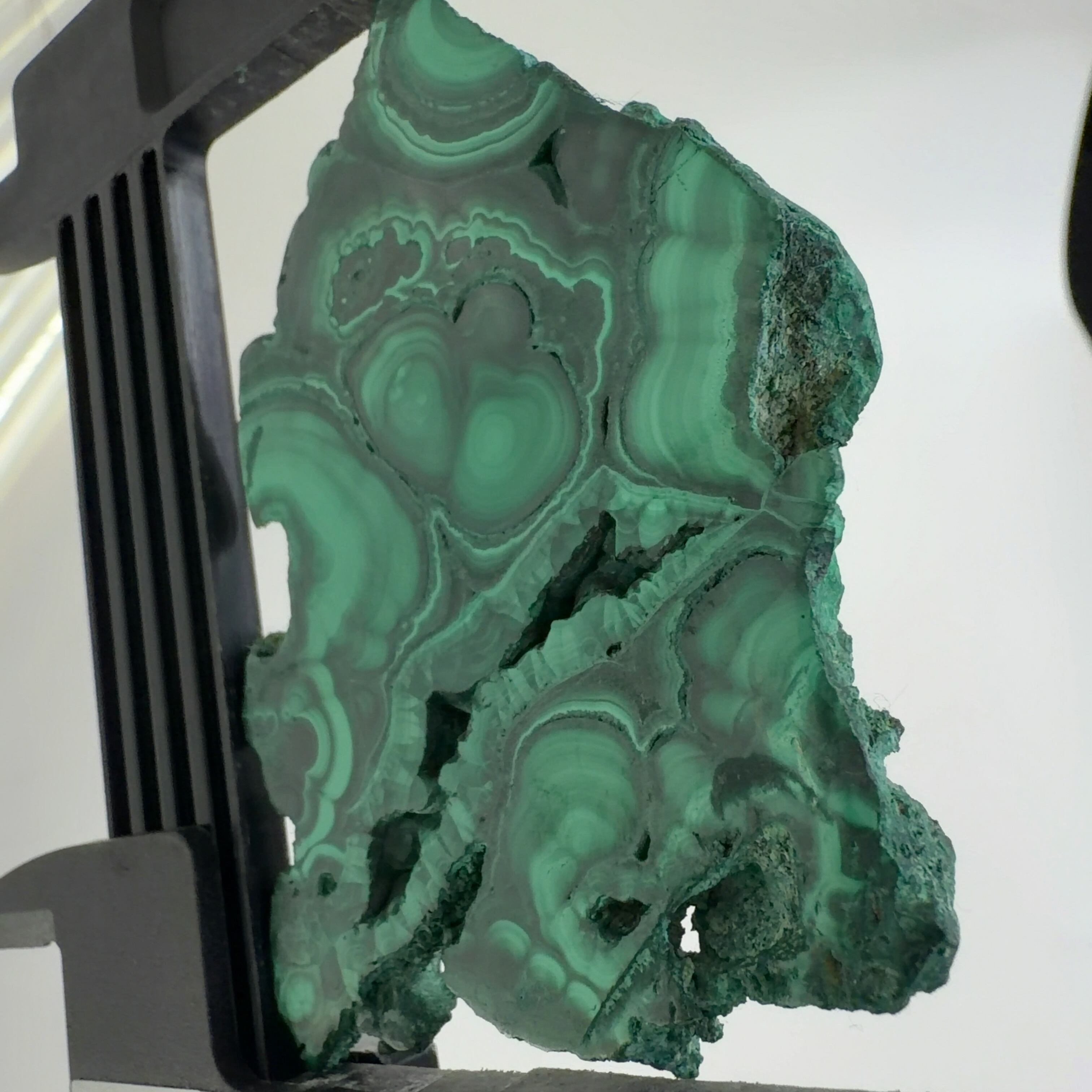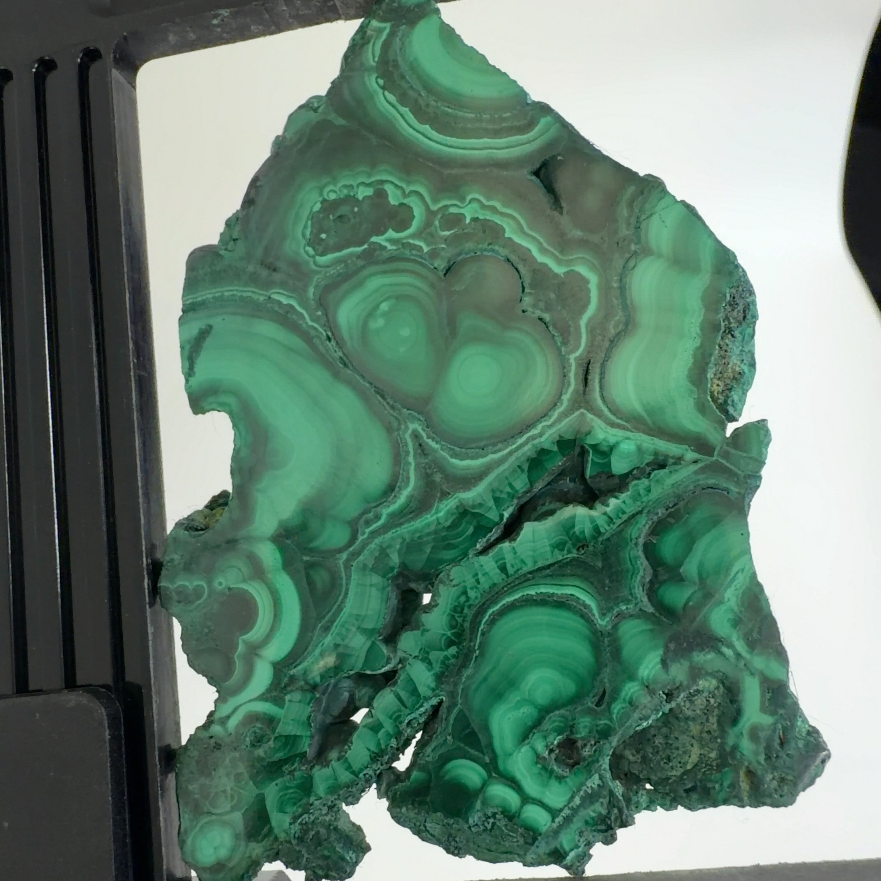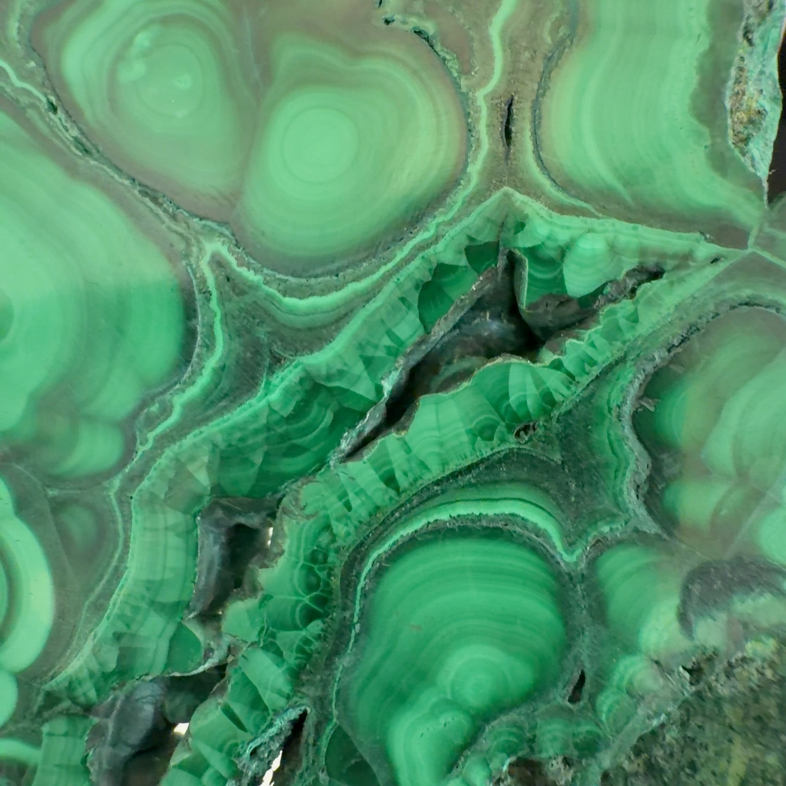 水に溶けた黄銅鉱と水に溶けた二酸化炭素が反応してできる鉱物で、斜めから光を反射させると孔雀の羽のように見えるので和名は孔雀石と名付けられています。