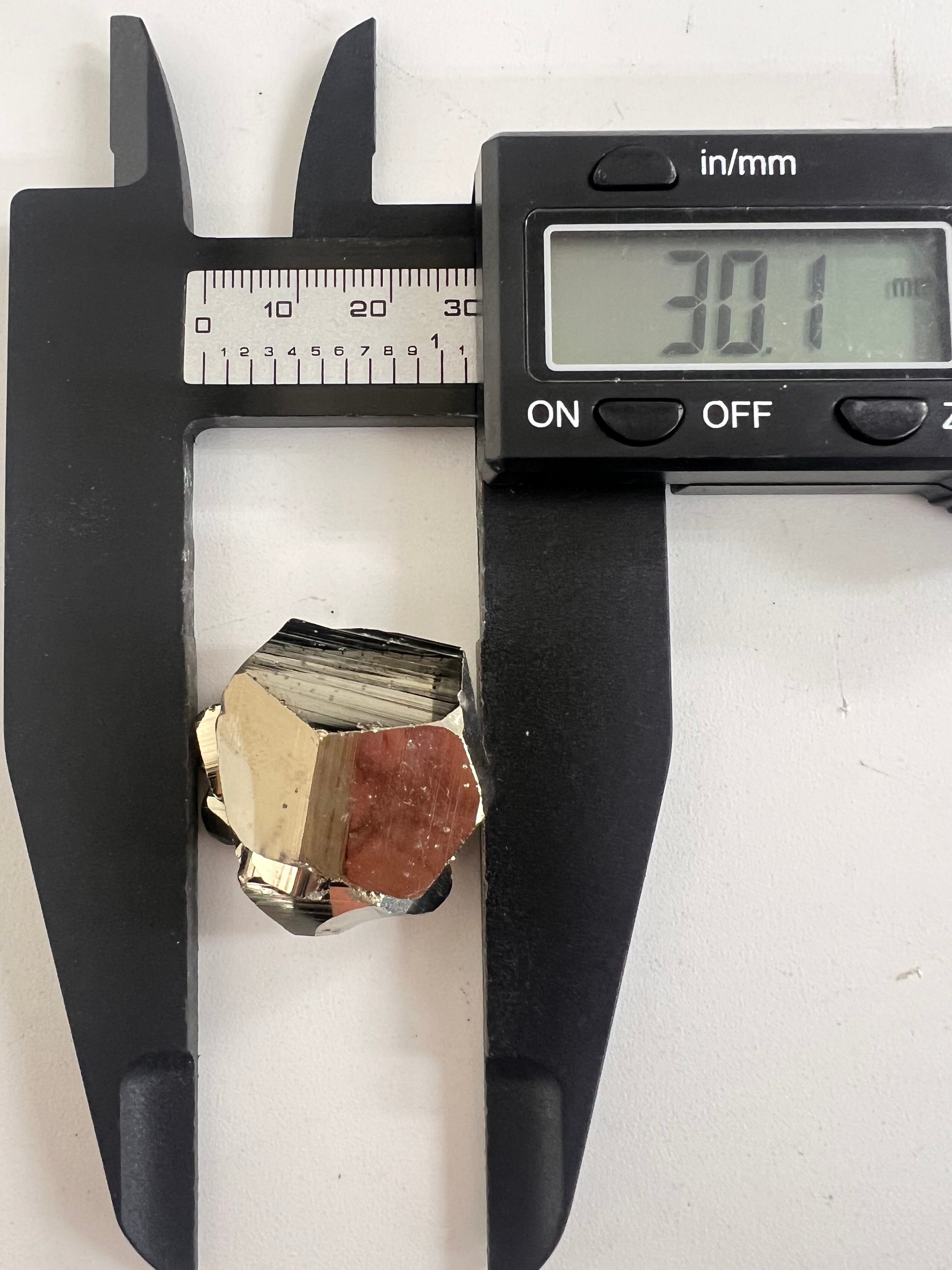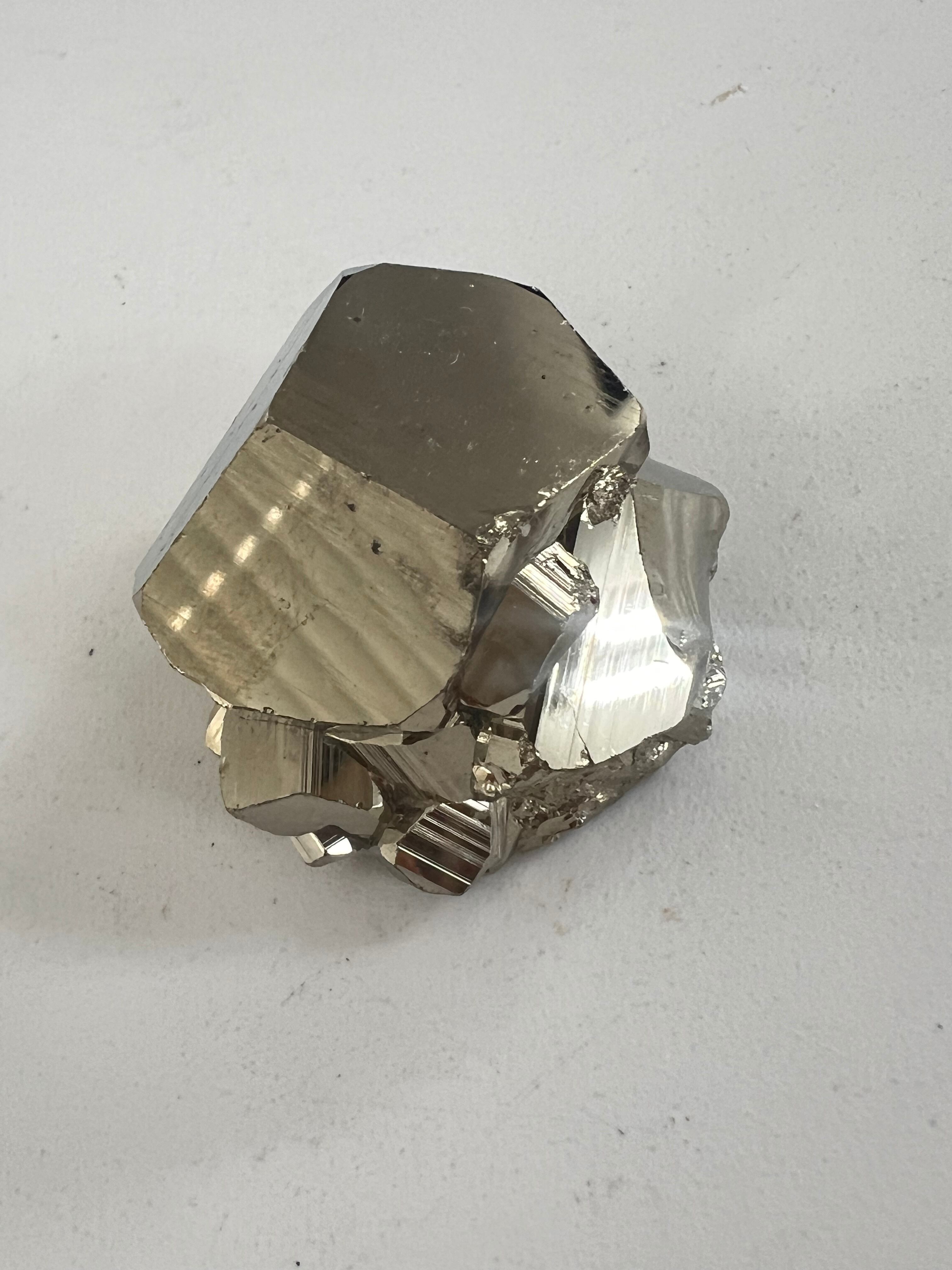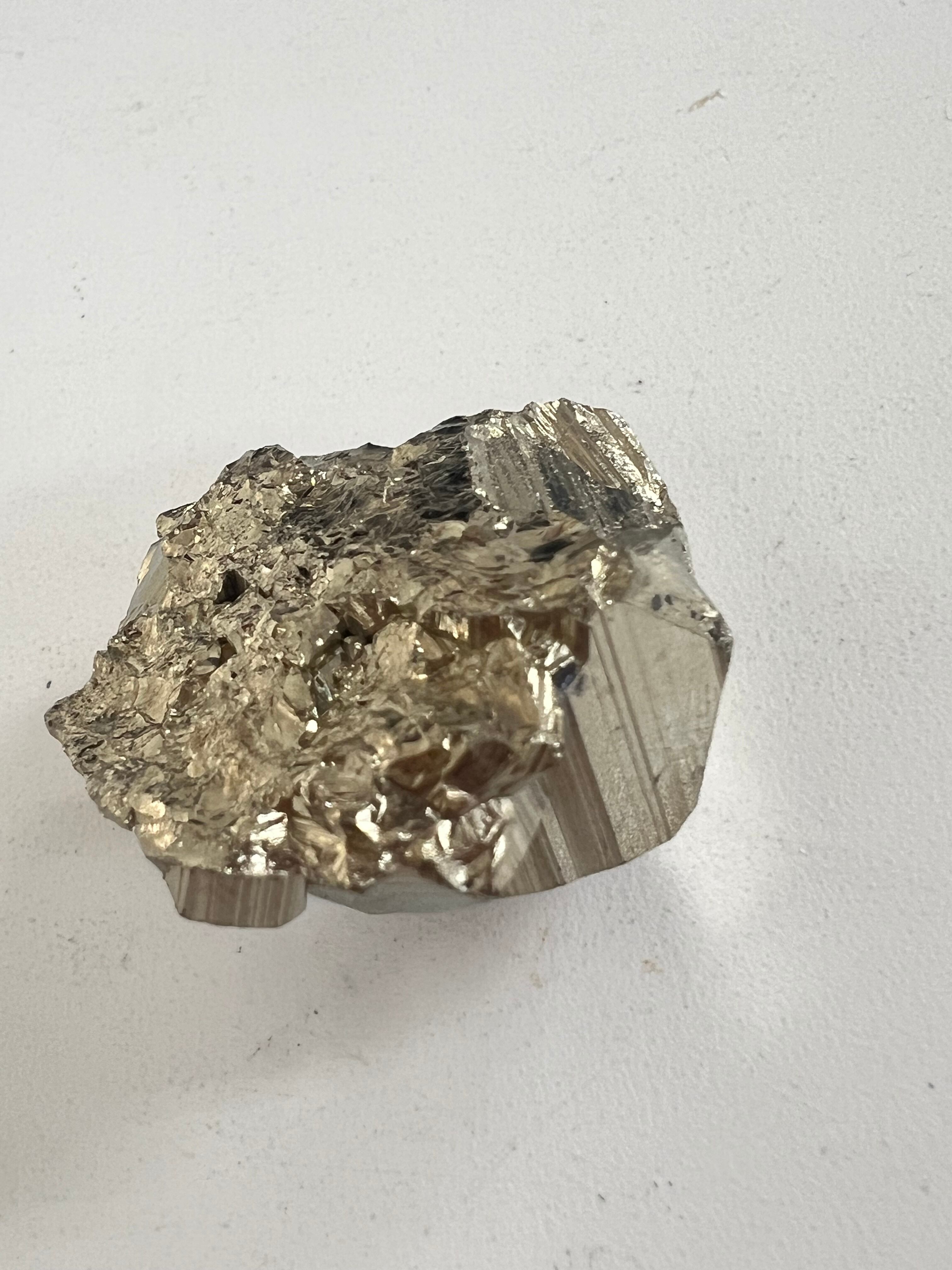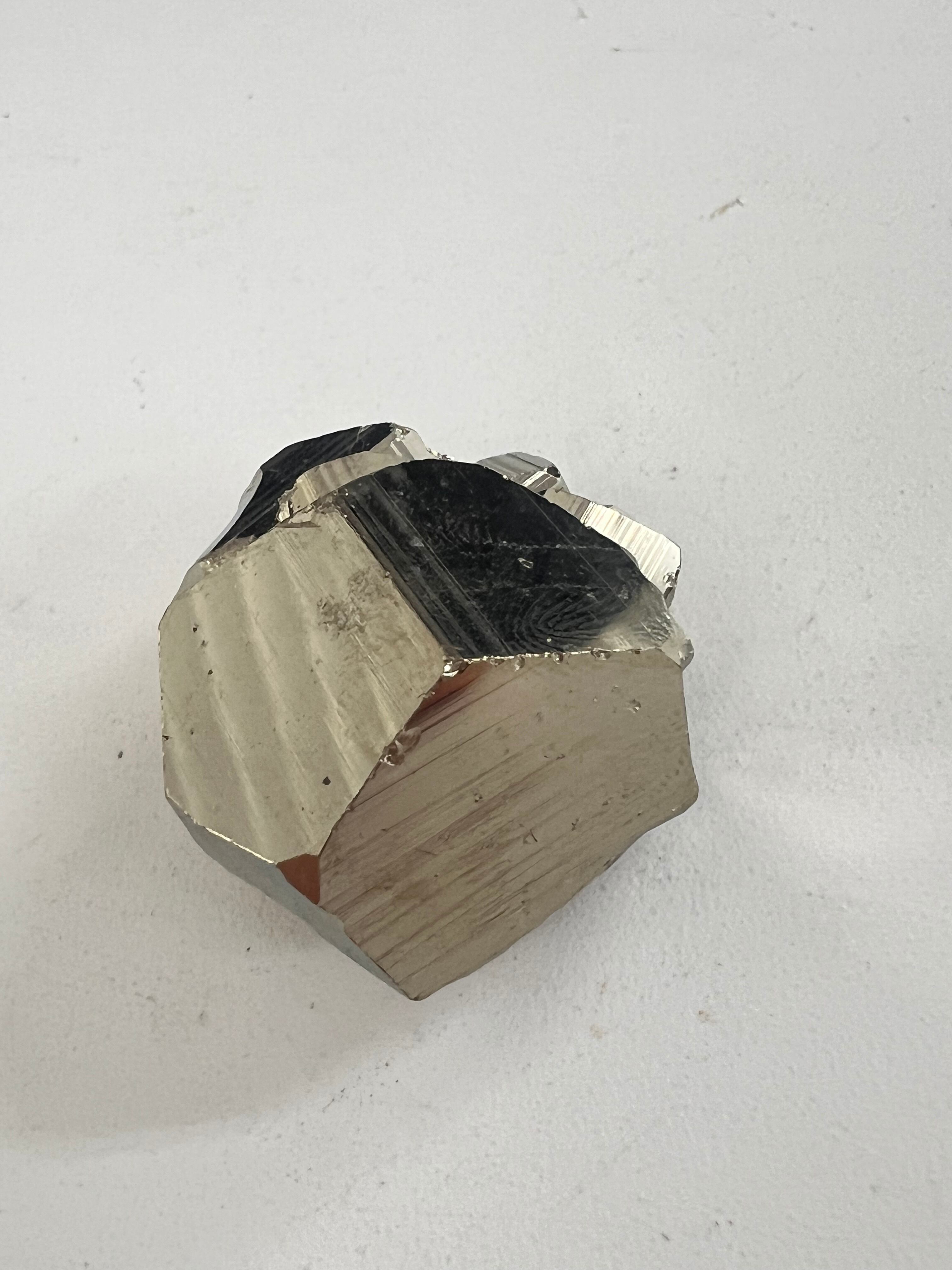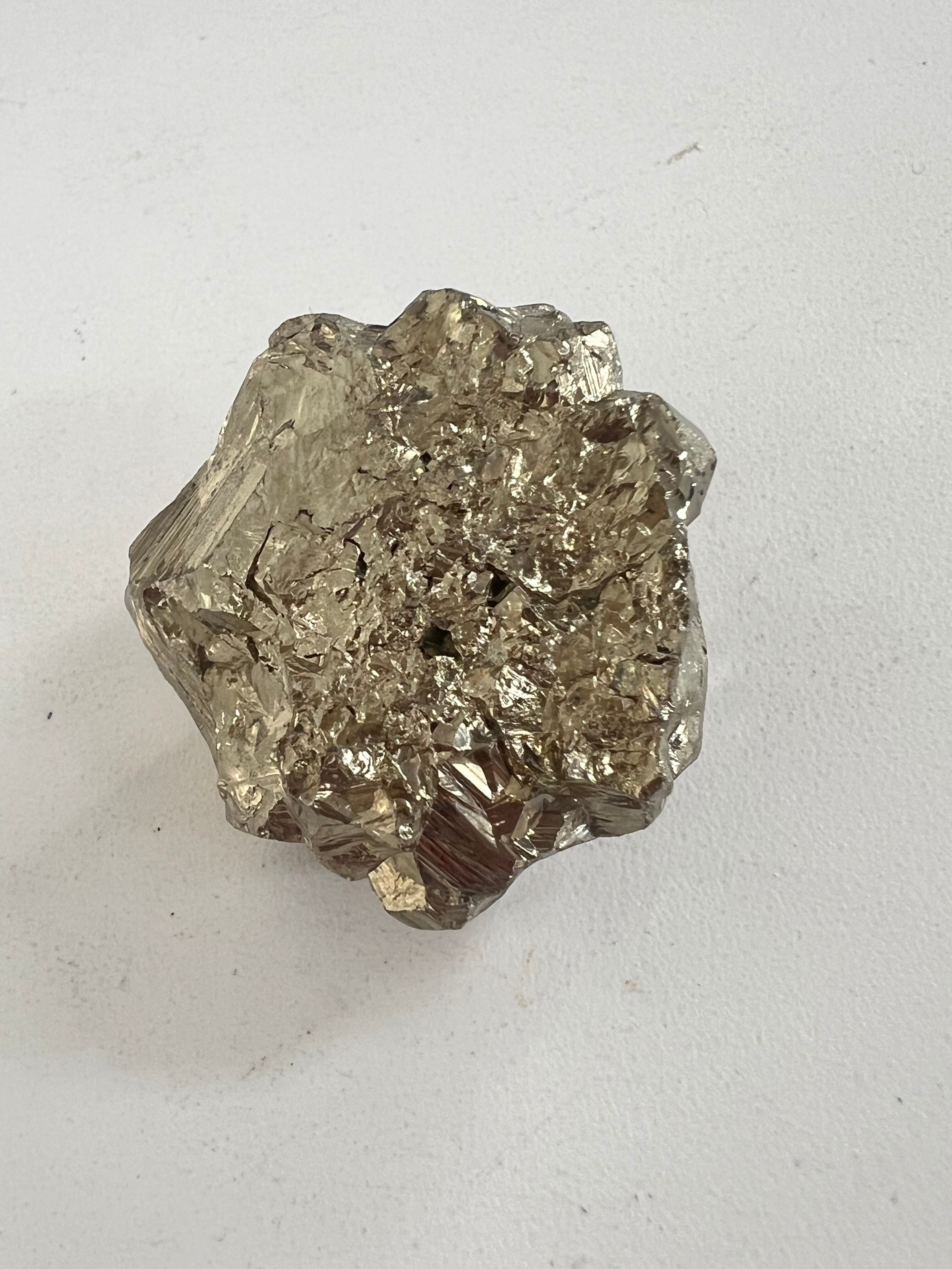 硫黄と鉄の化合物。黄金色の美しい光沢および、立方体、五画十二面体、八面体、二十四面体、又はそれらが合わさった形など様々な結晶をするので標本として人気があります。