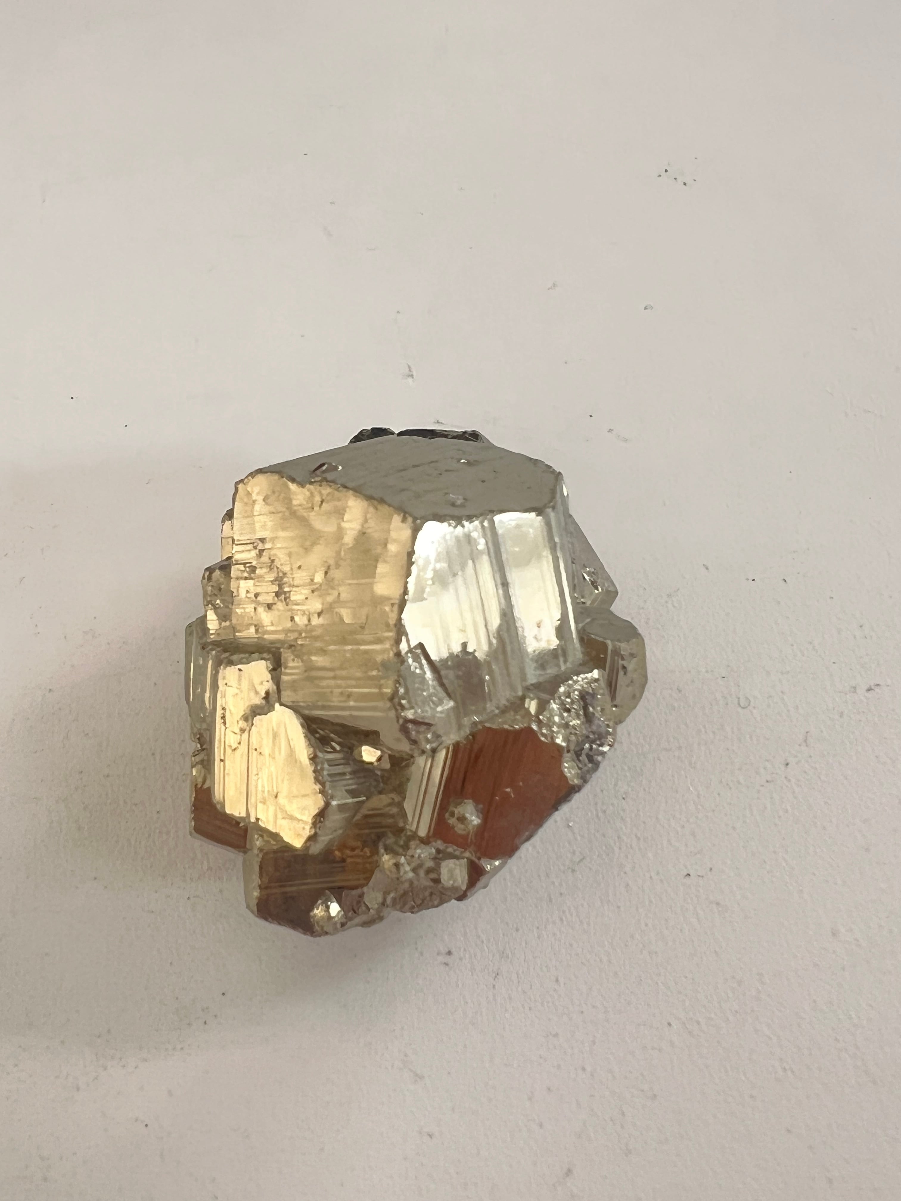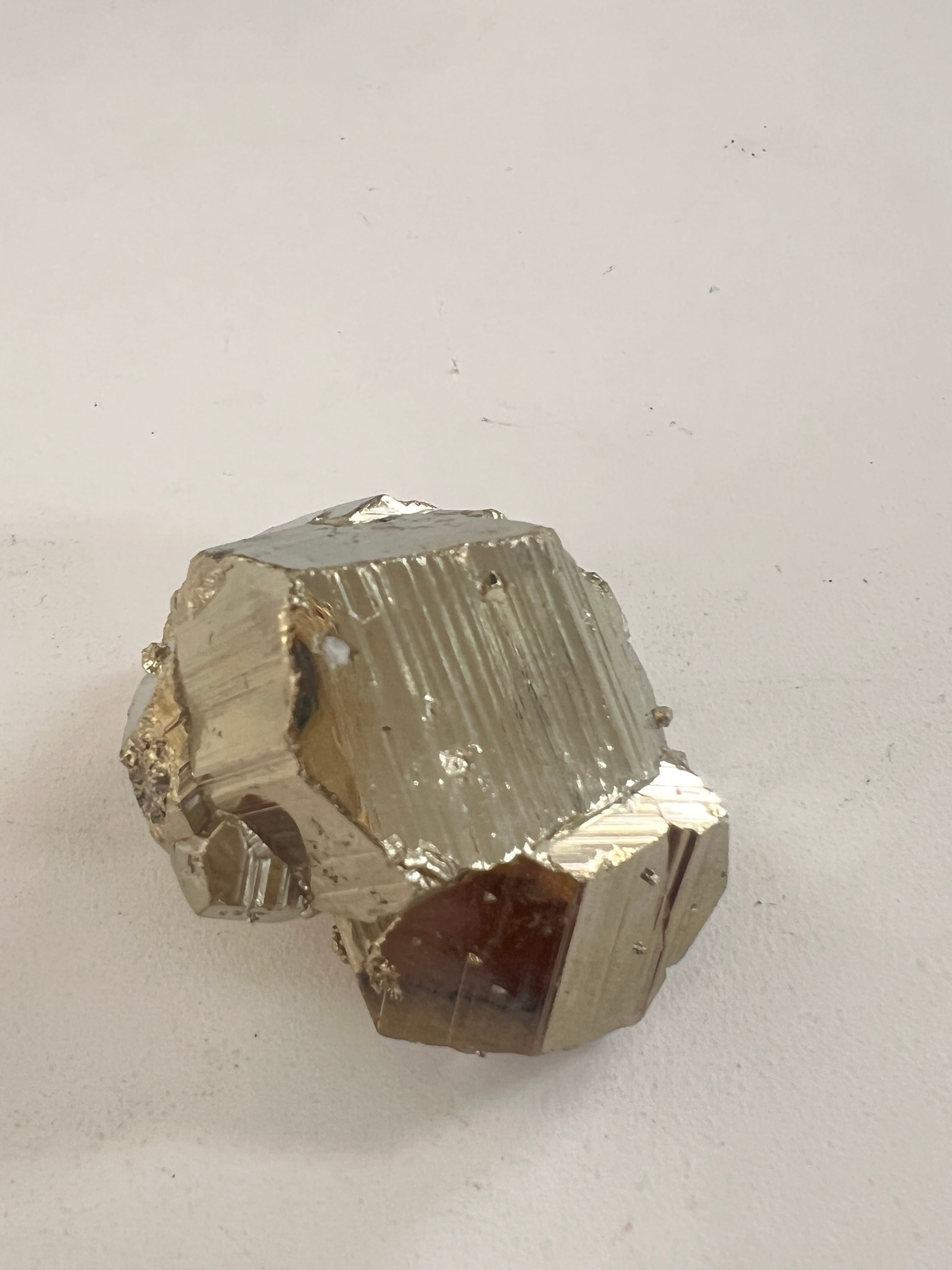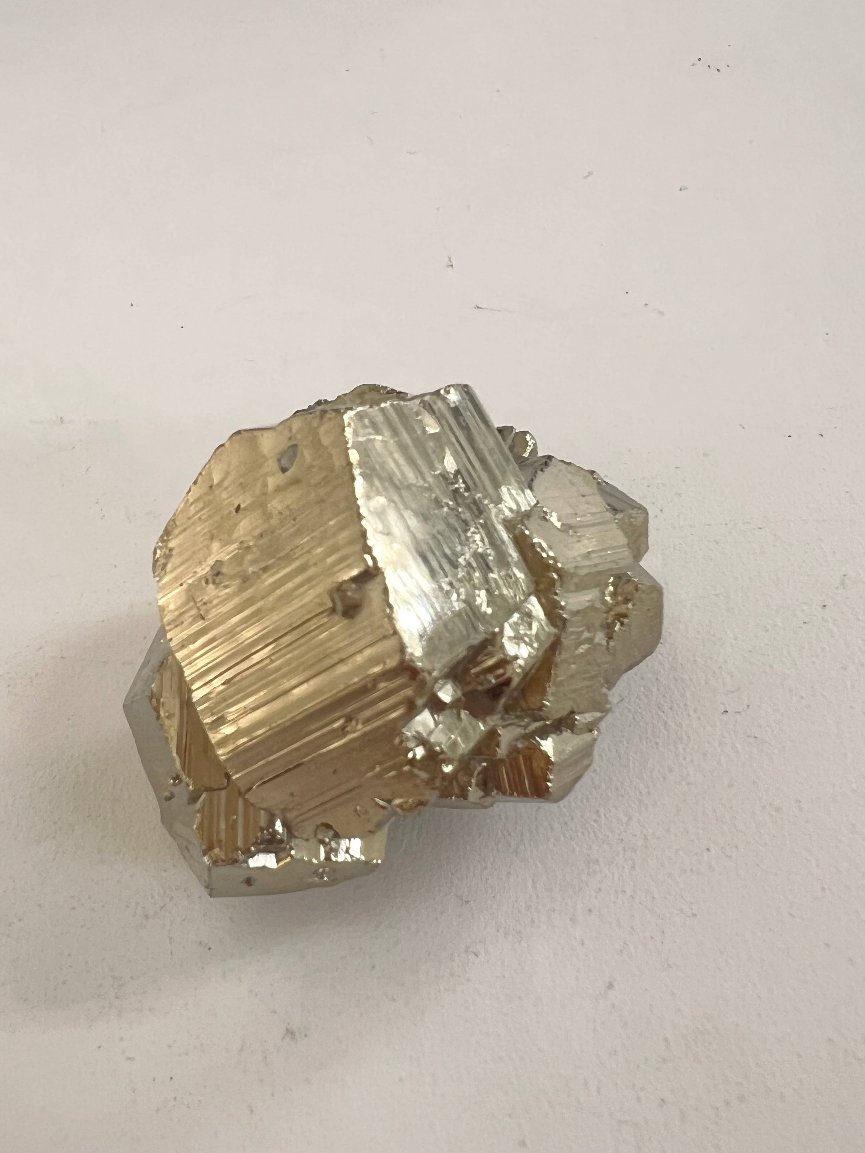 硫黄と鉄の化合物。黄金色の美しい光沢および、立方体、五画十二面体、八面体、二十四面体、又はそれらが合わさった形など様々な結晶をするので標本として人気があります。