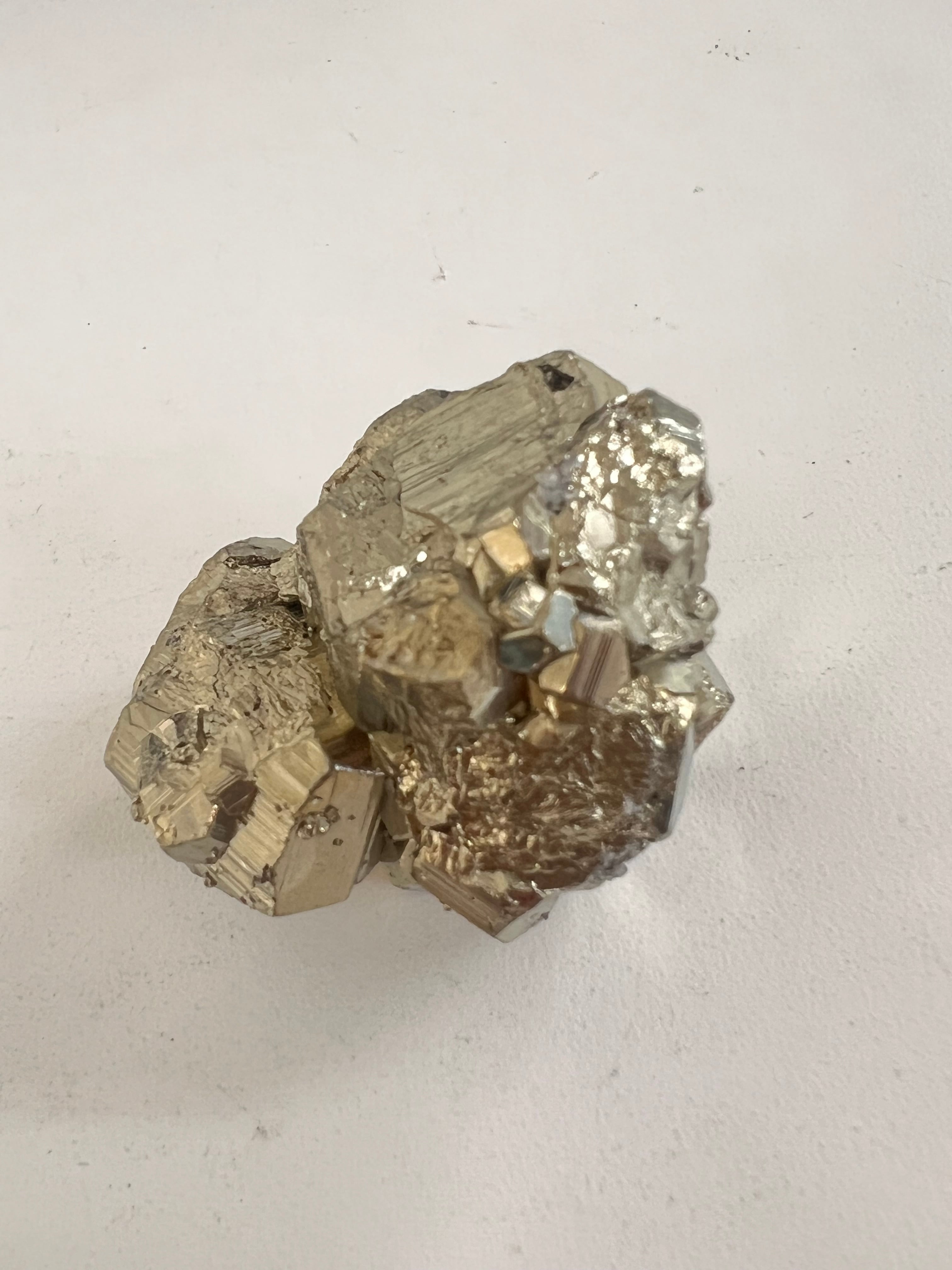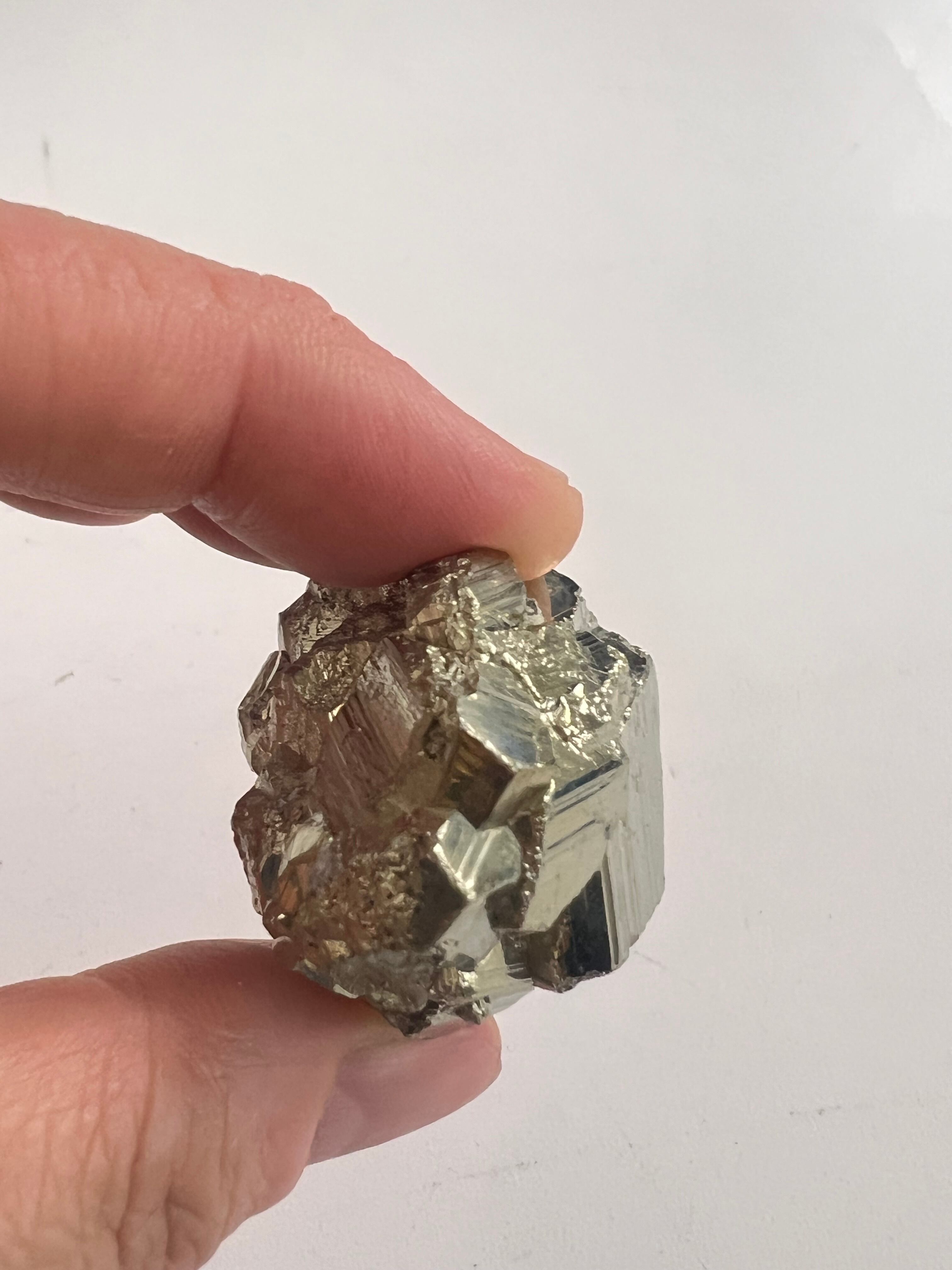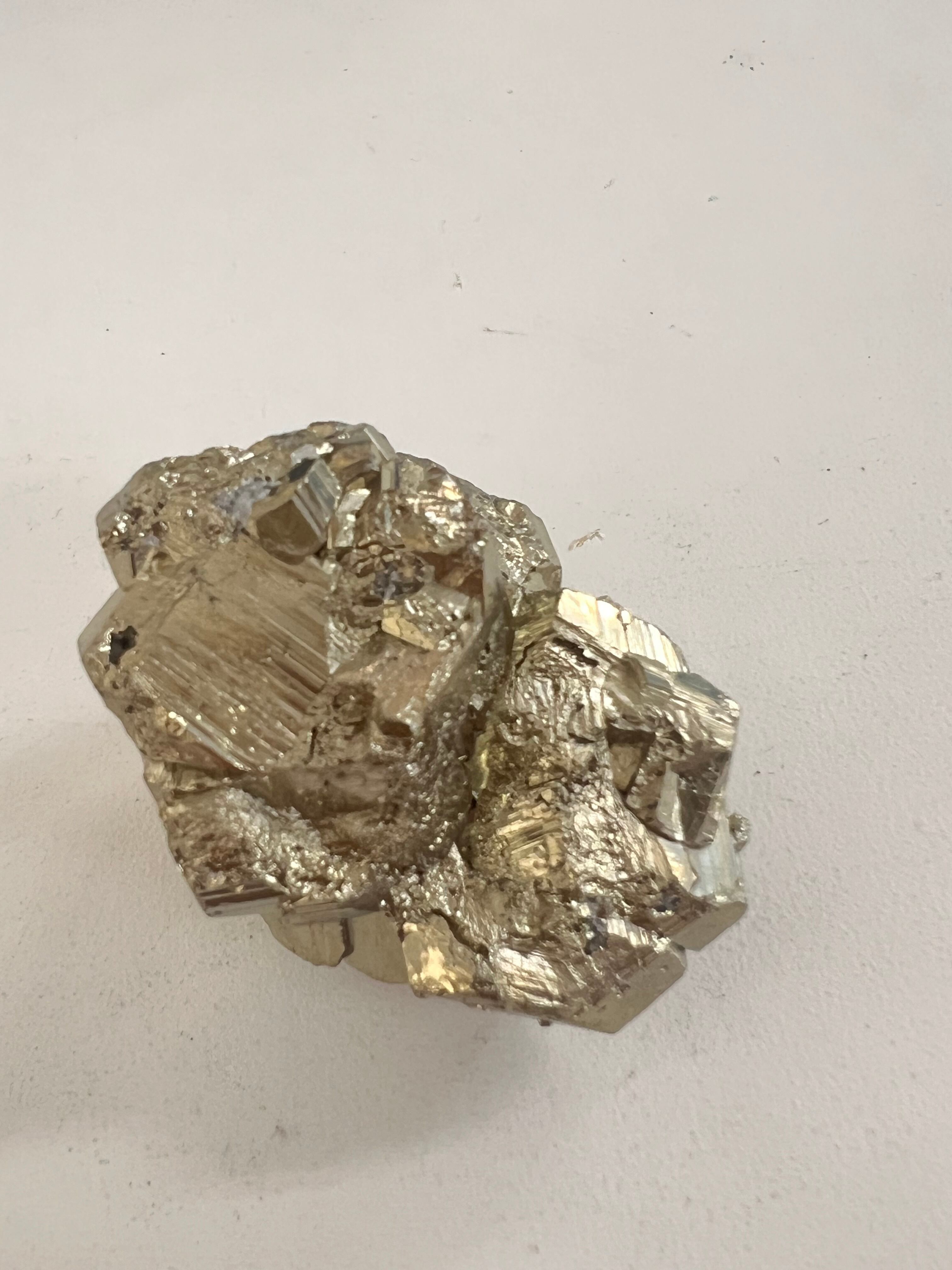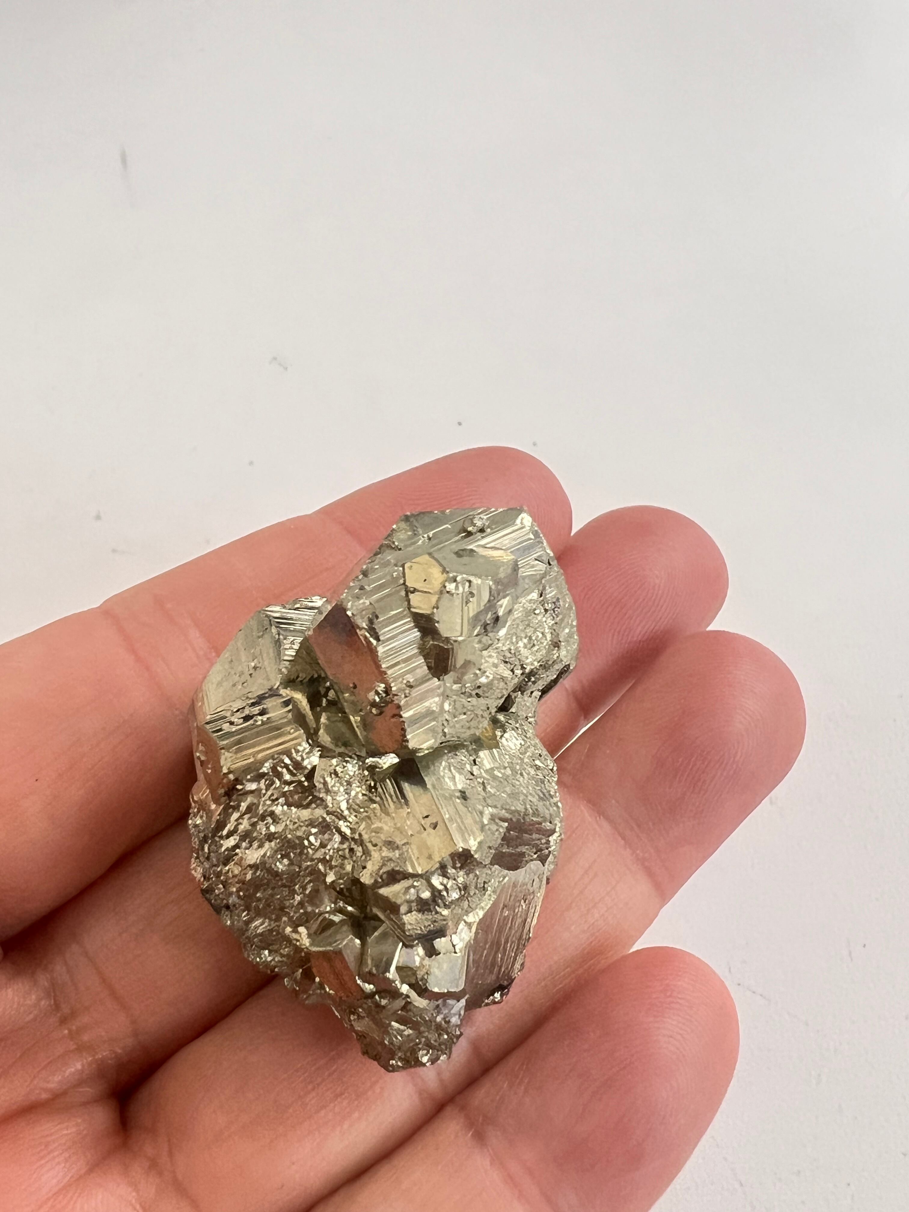 硫黄と鉄の化合物。黄金色の美しい光沢および、立方体、五画十二面体、八面体、二十四面体、又はそれらが合わさった形など様々な結晶をするので標本として人気があります。
