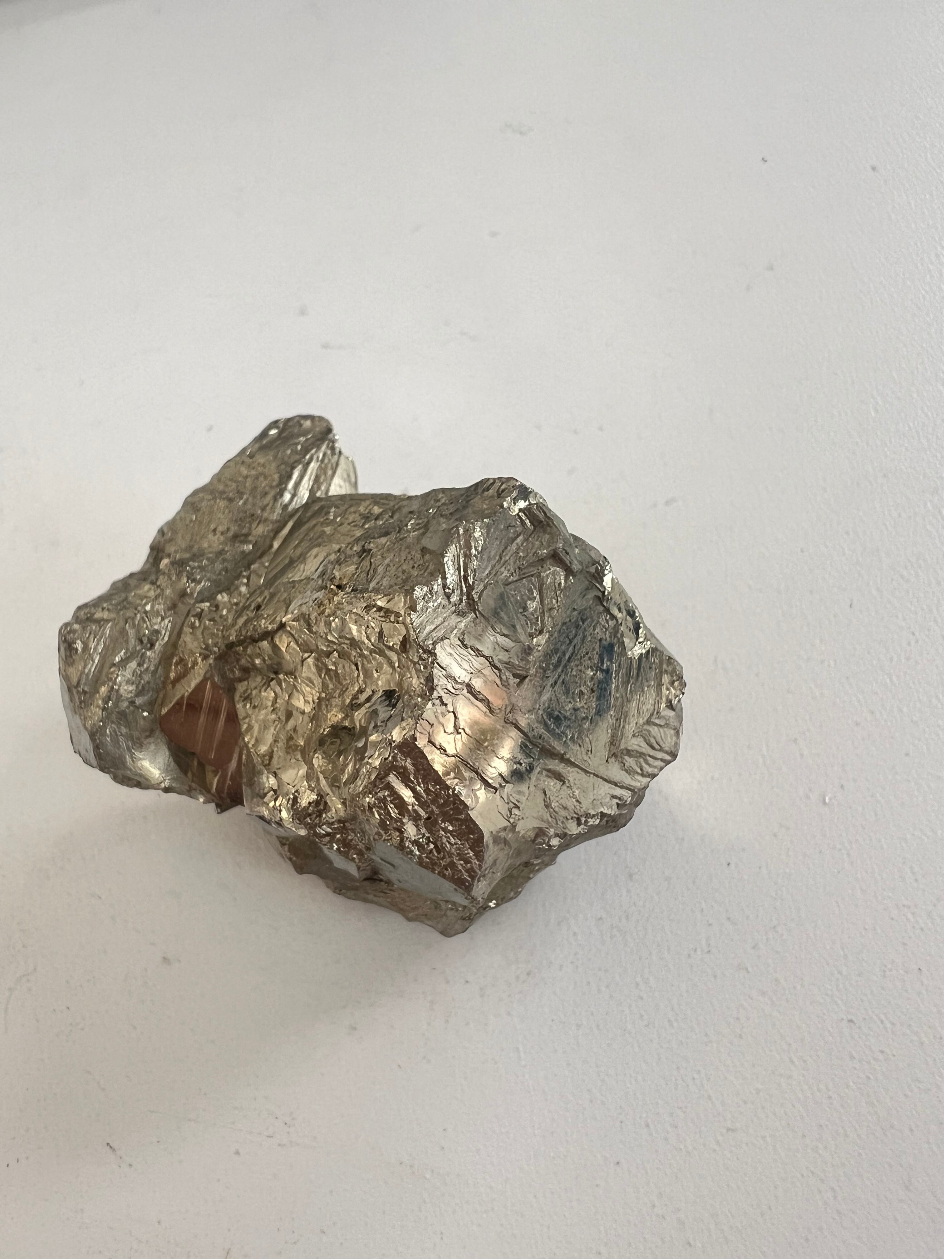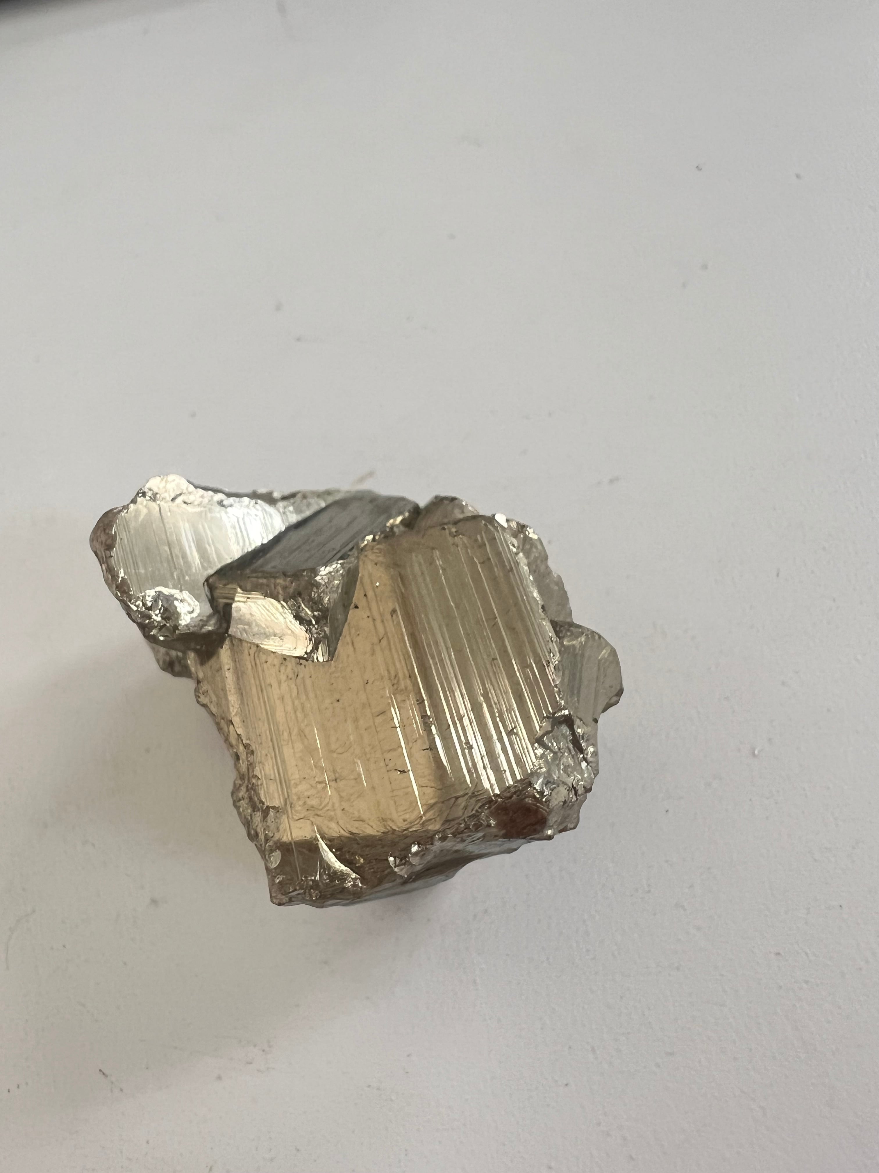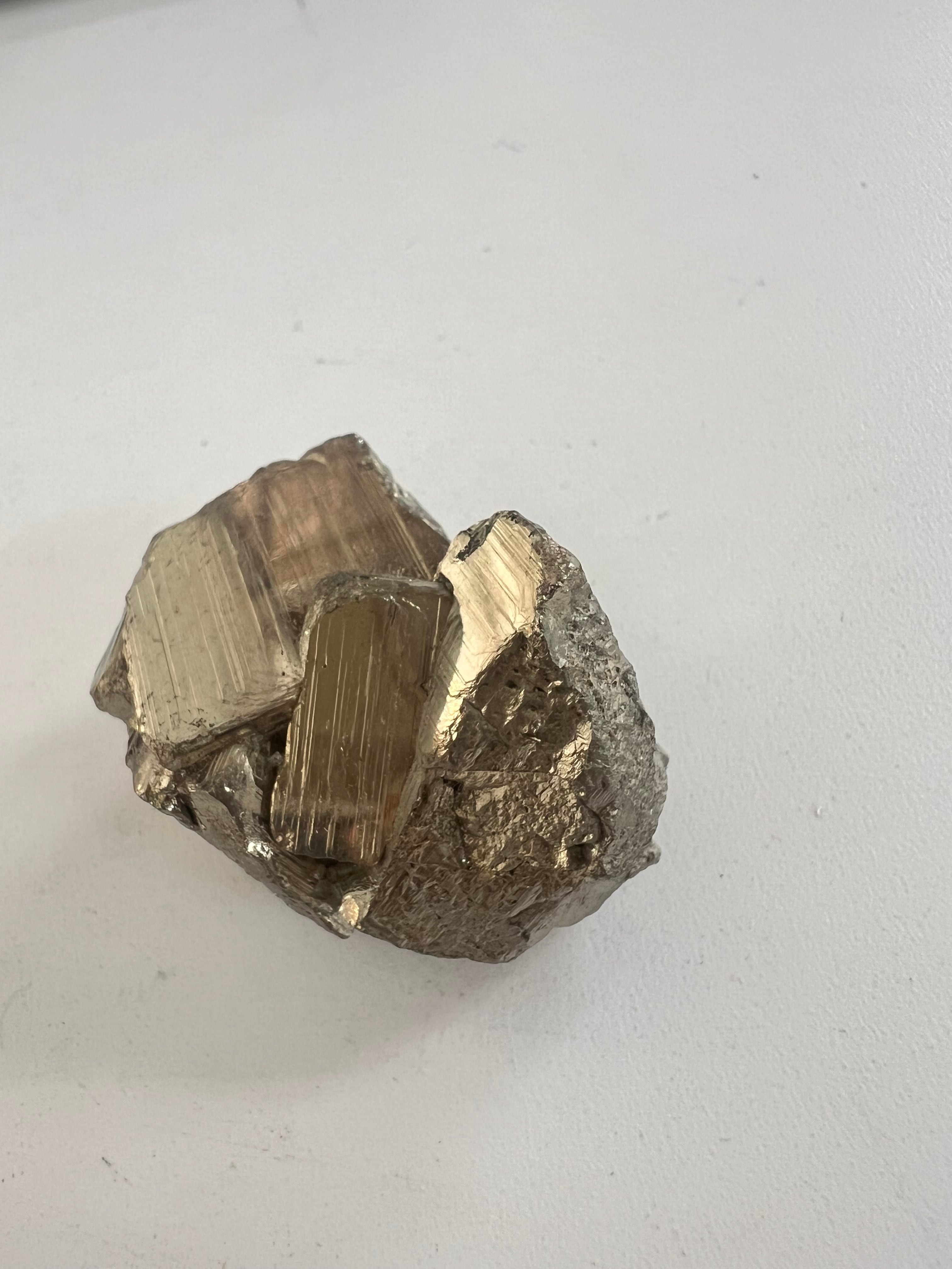 硫黄と鉄の化合物。黄金色の美しい光沢および、立方体、五画十二面体、八面体、二十四面体、又はそれらが合わさった形など様々な結晶をするので標本として人気があります。