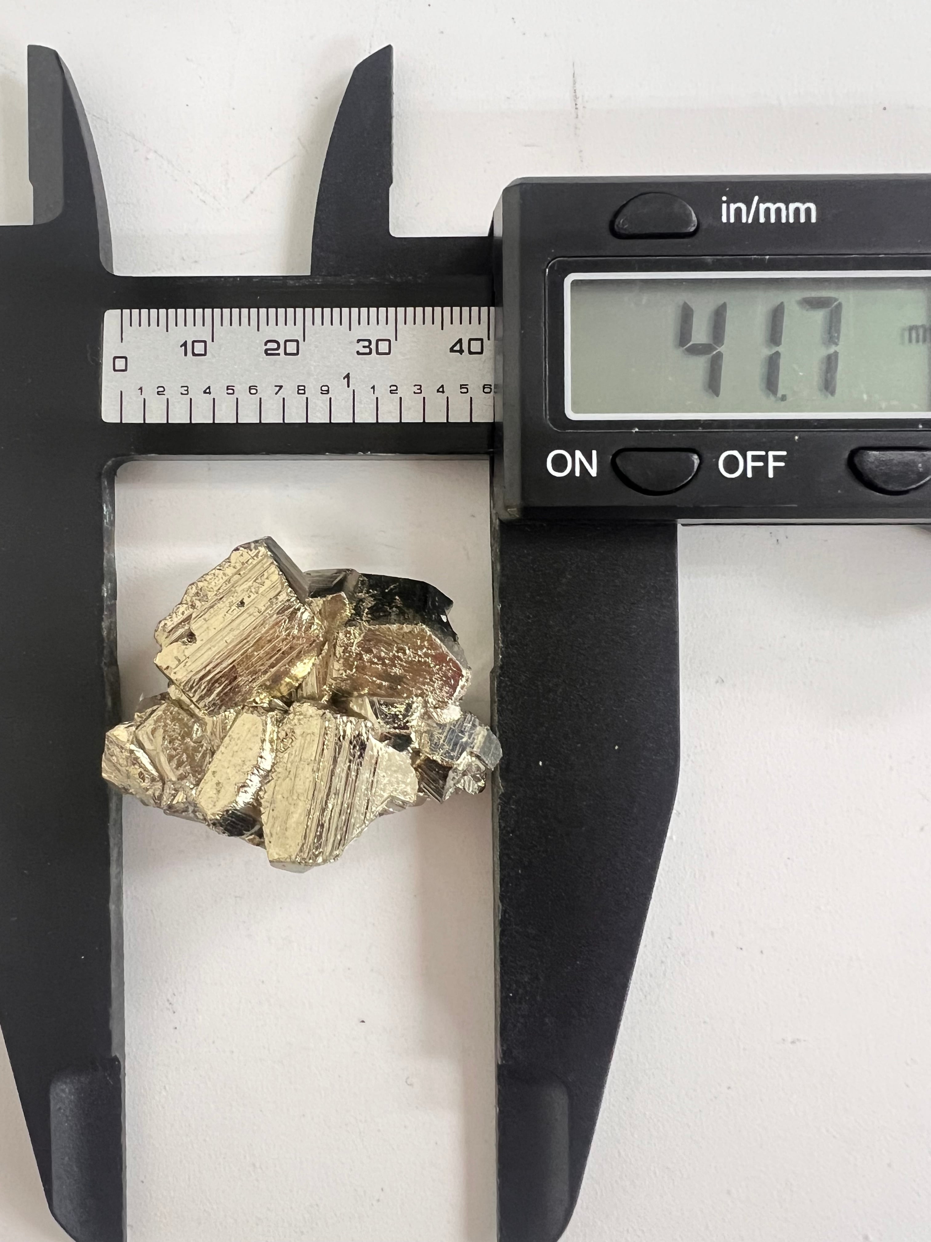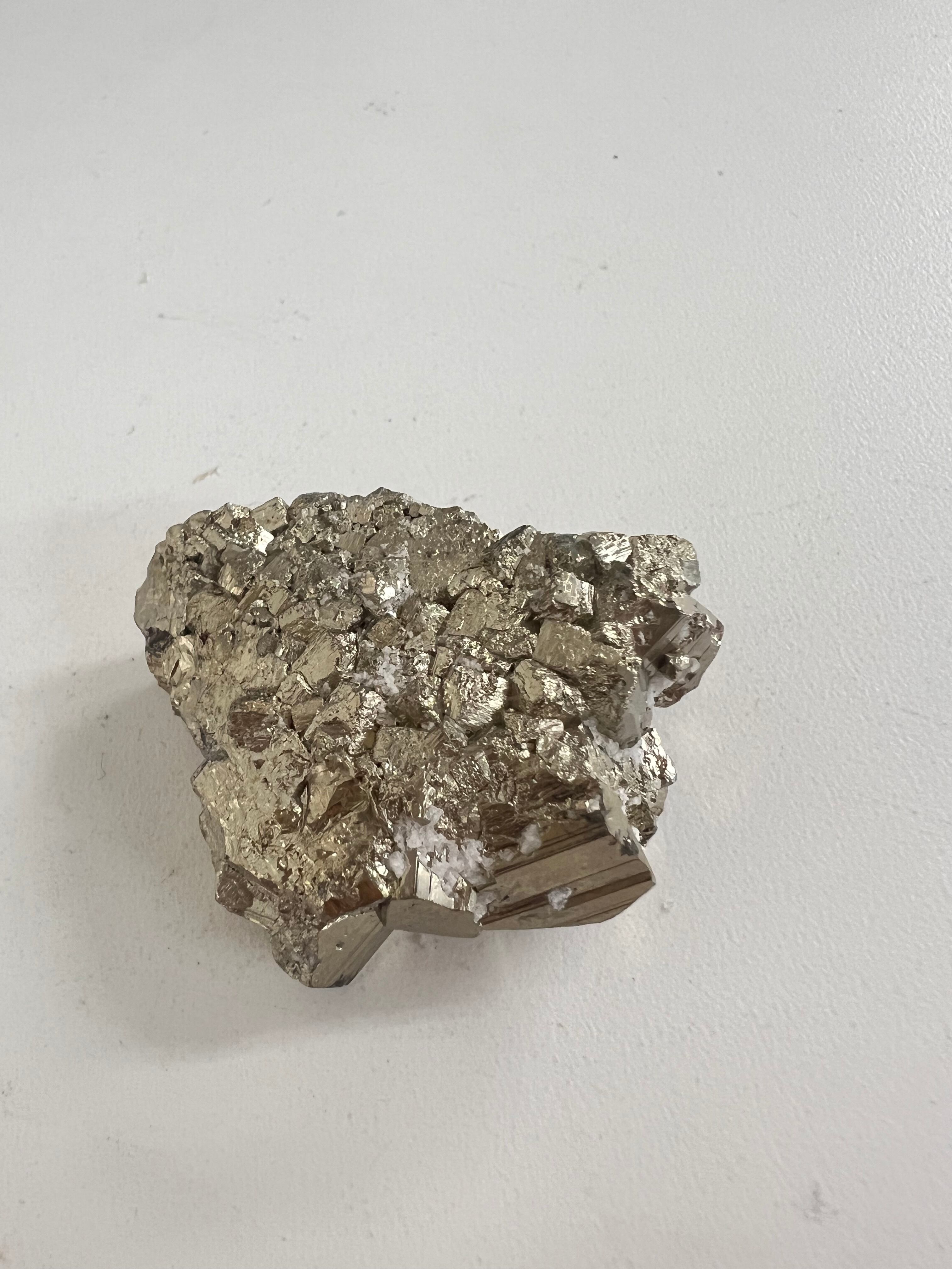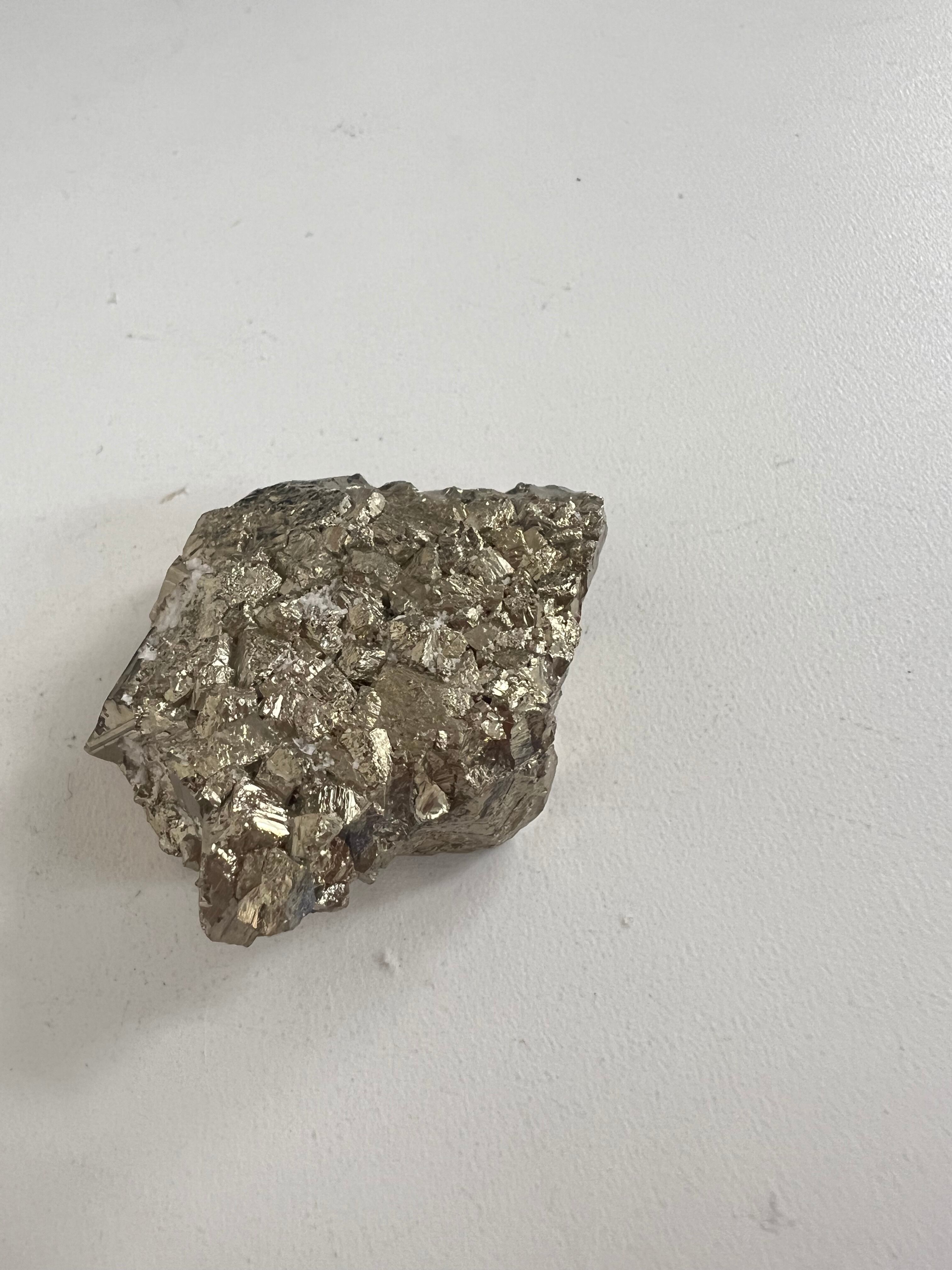 硫黄と鉄の化合物。黄金色の美しい光沢および、立方体、五画十二面体、八面体、二十四面体、又はそれらが合わさった形など様々な結晶をするので標本として人気があります。
