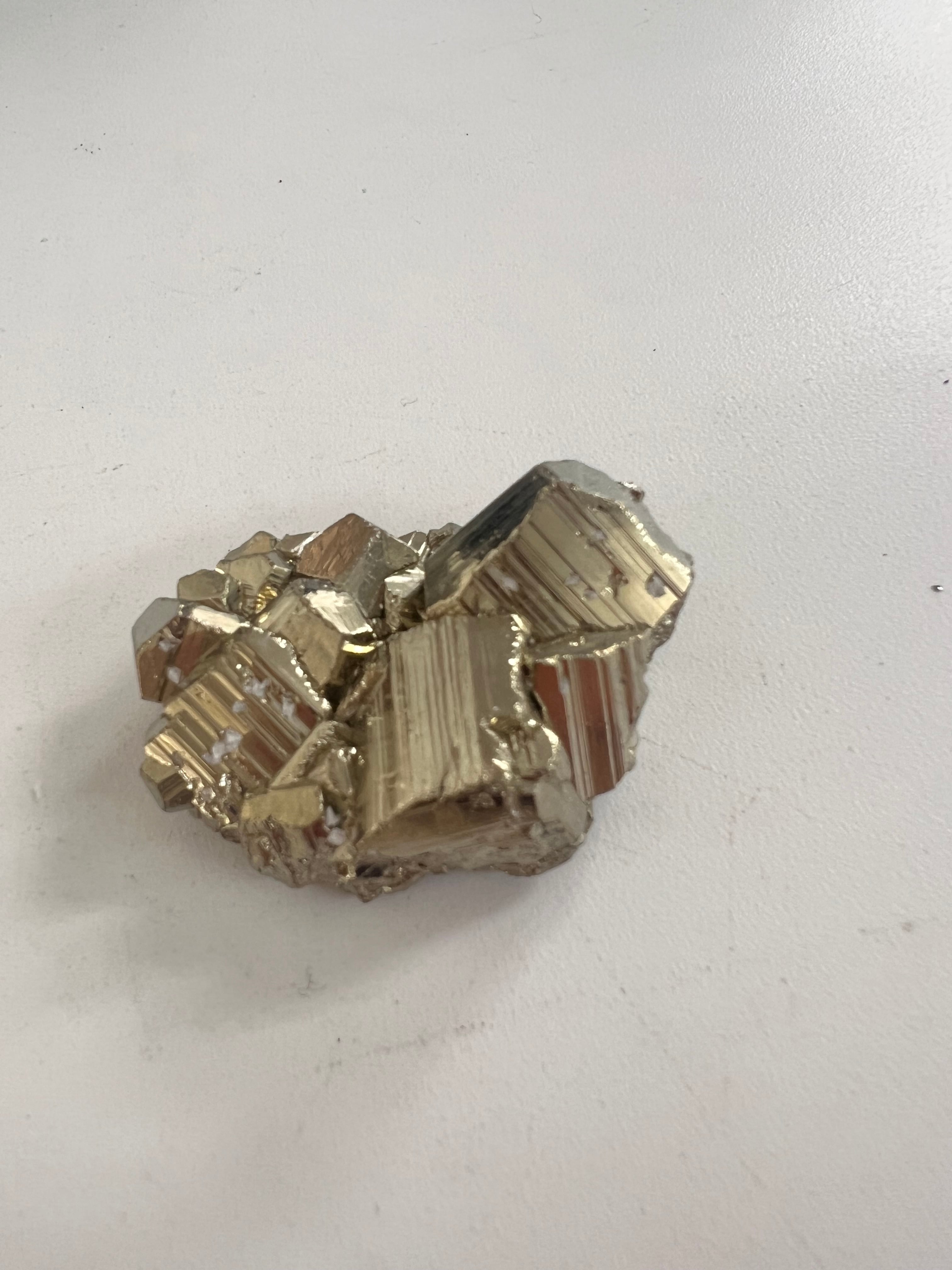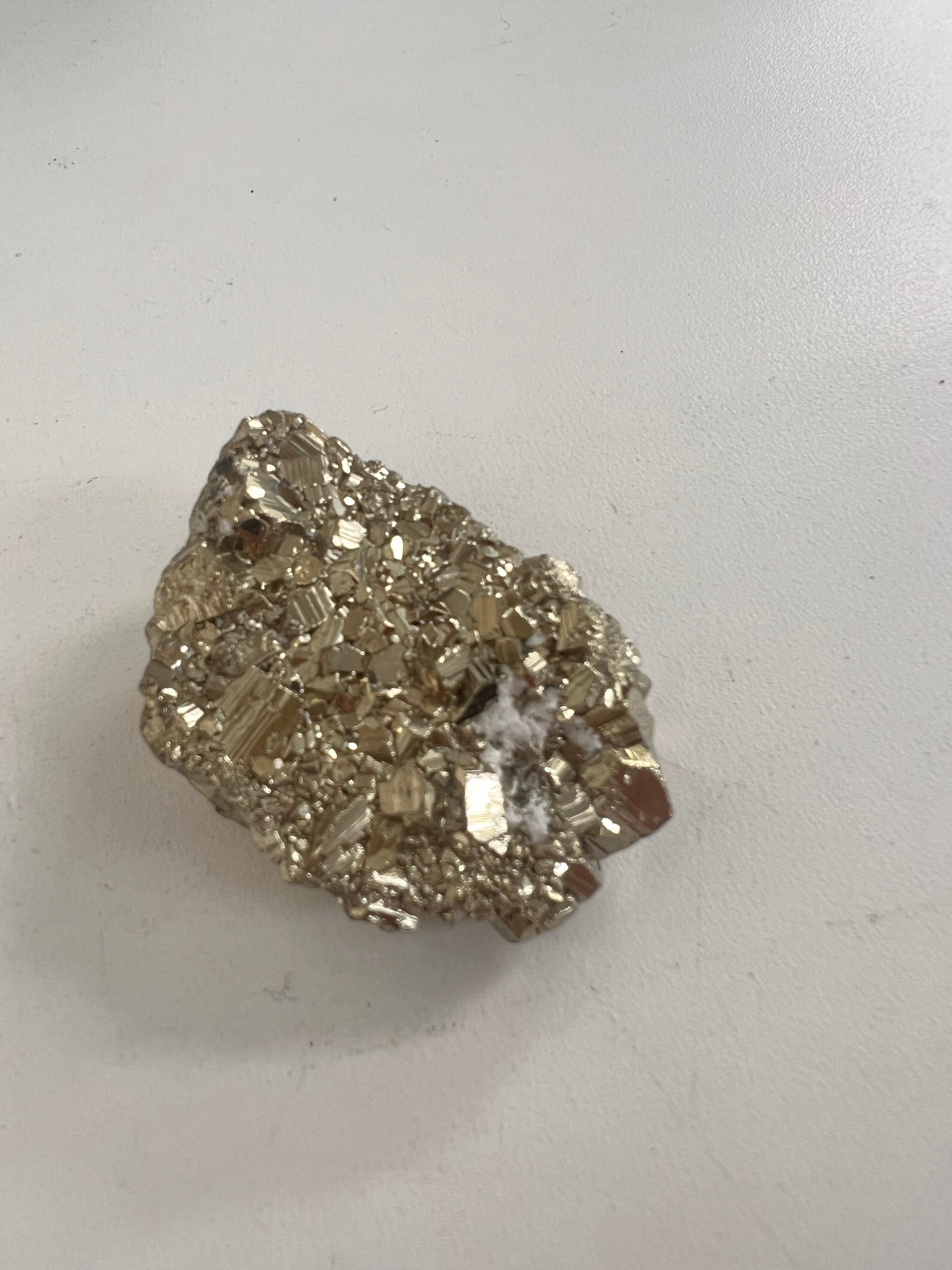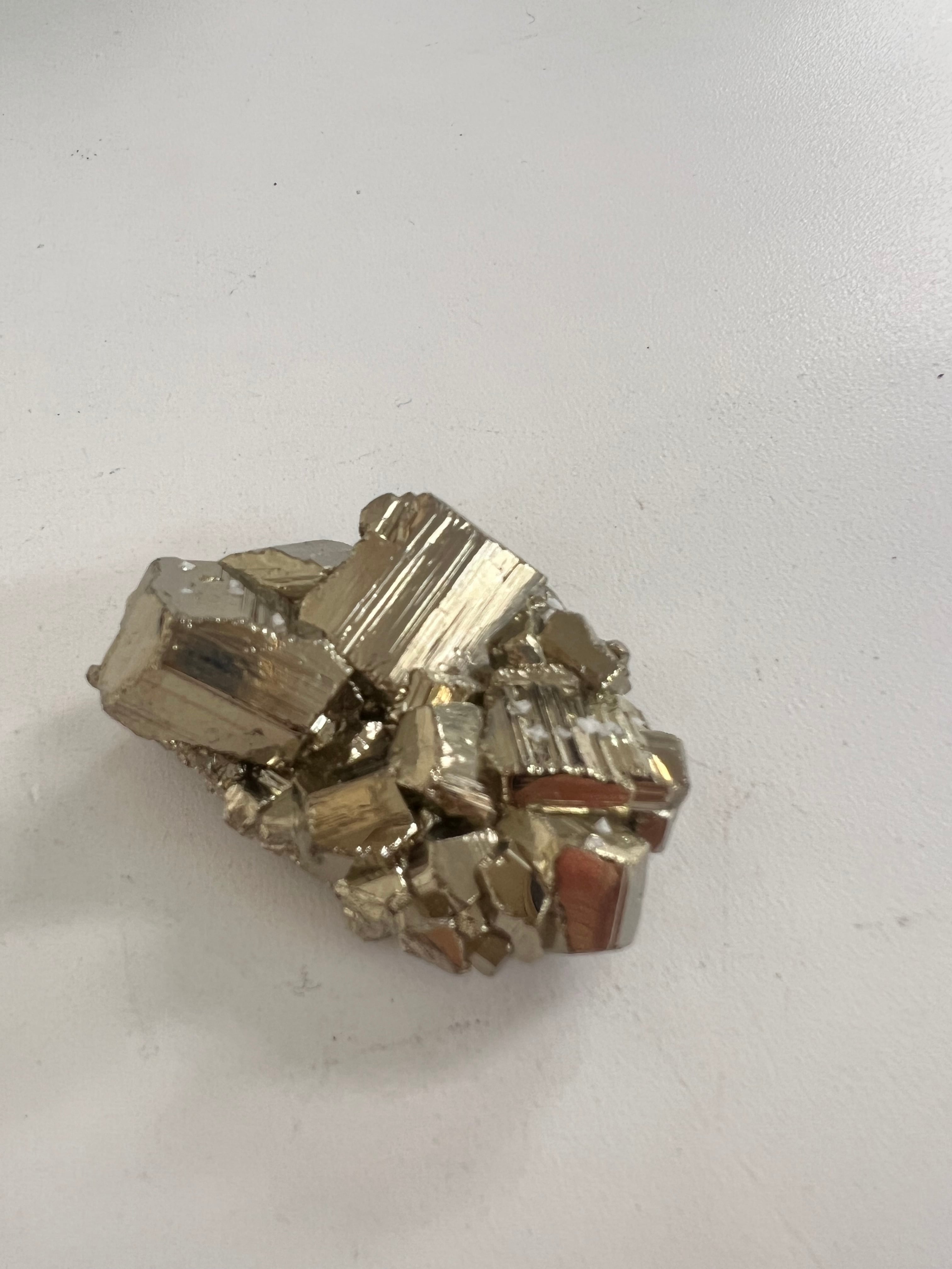 硫黄と鉄の化合物。黄金色の美しい光沢および、立方体、五画十二面体、八面体、二十四面体、又はそれらが合わさった形など様々な結晶をするので標本として人気があります。