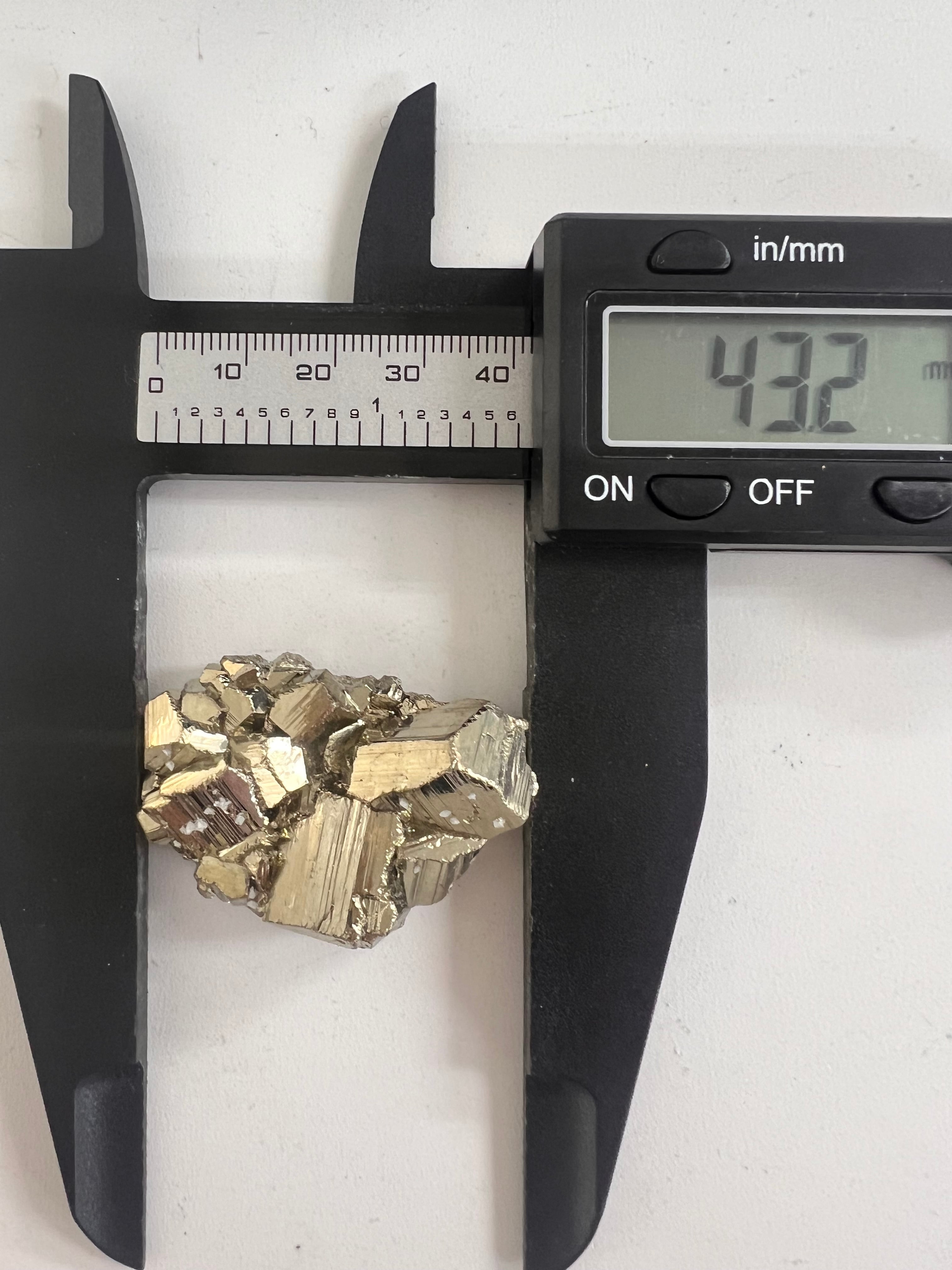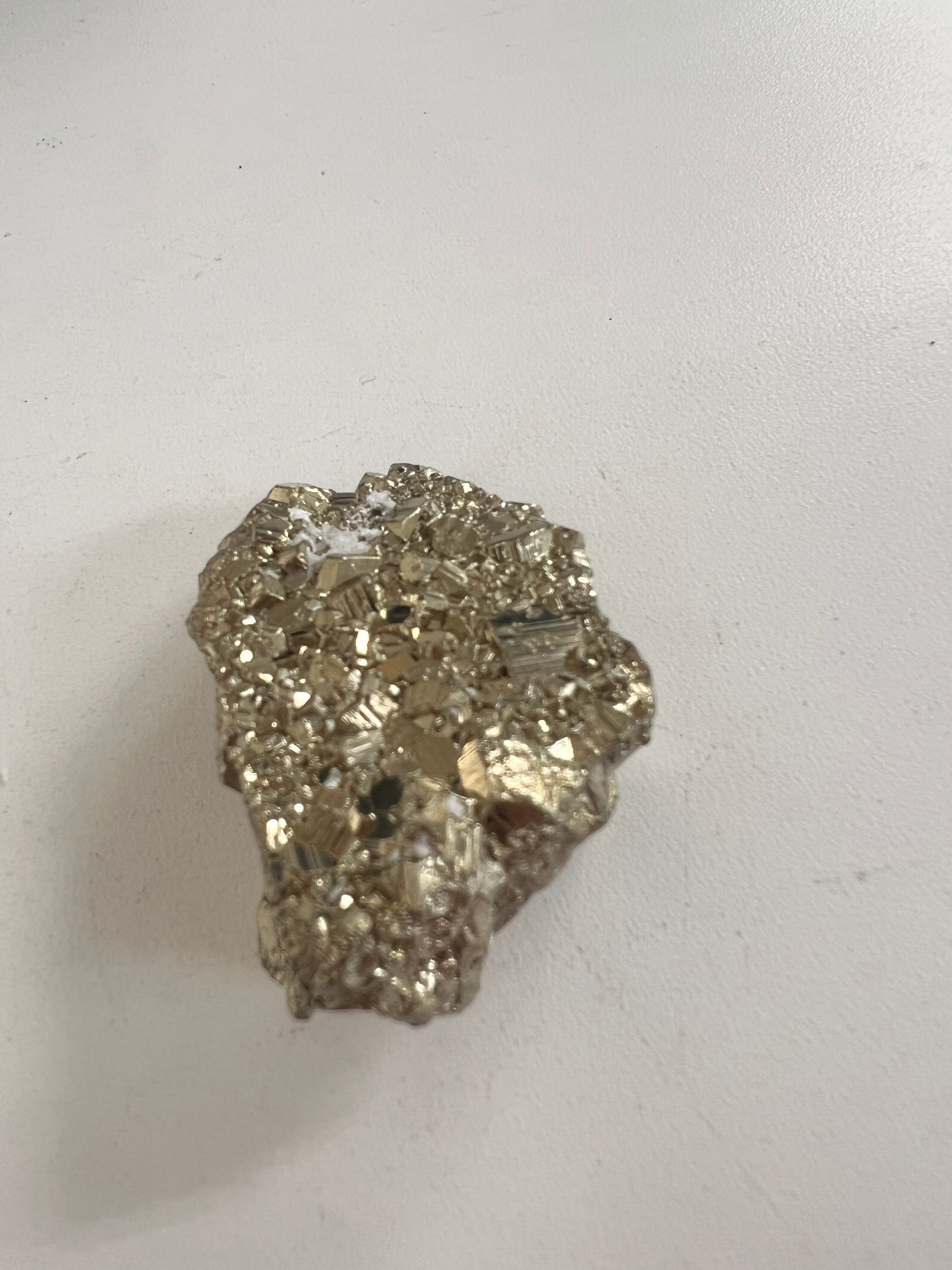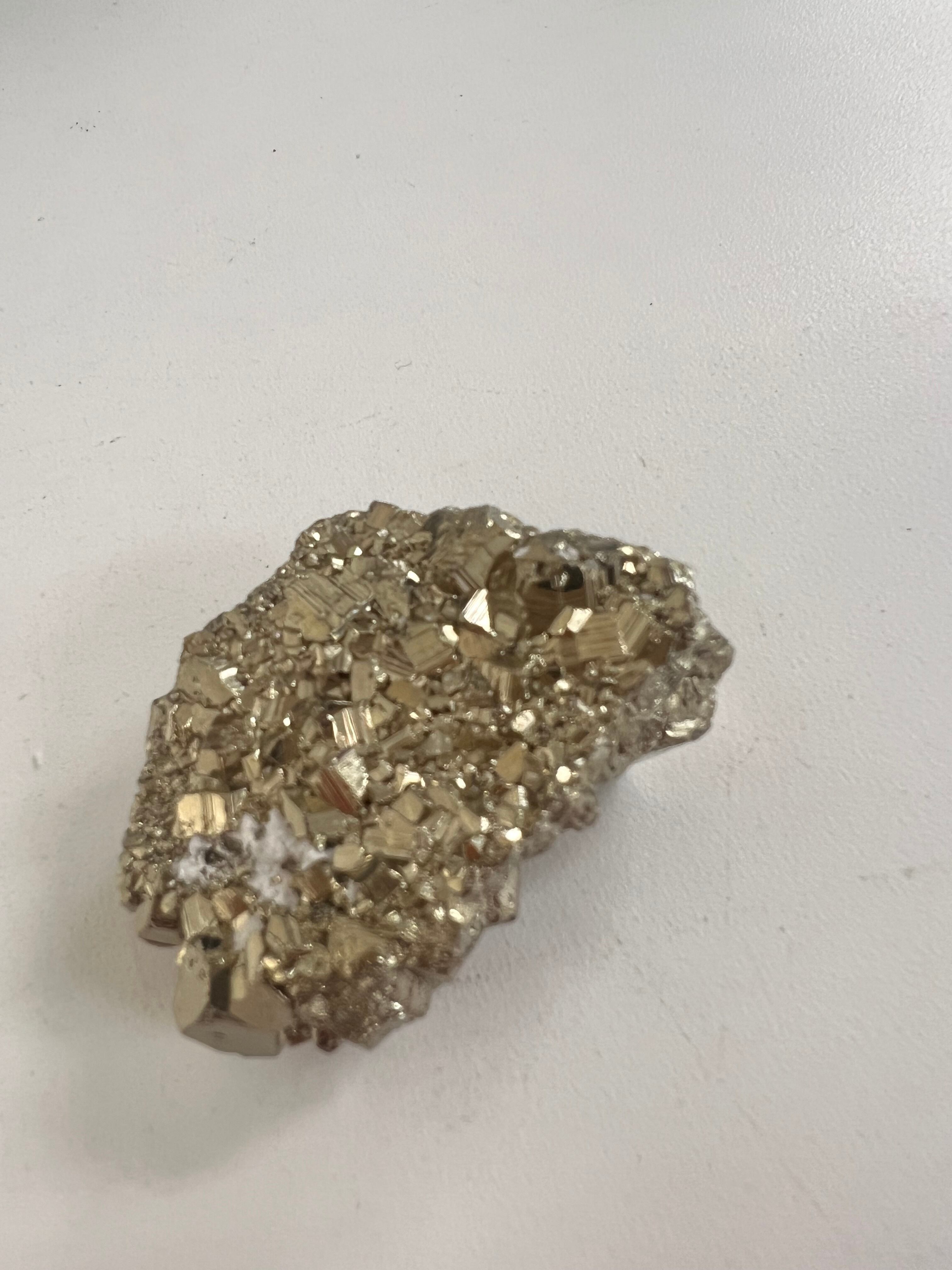硫黄と鉄の化合物。黄金色の美しい光沢および、立方体、五画十二面体、八面体、二十四面体、又はそれらが合わさった形など様々な結晶をするので標本として人気があります。