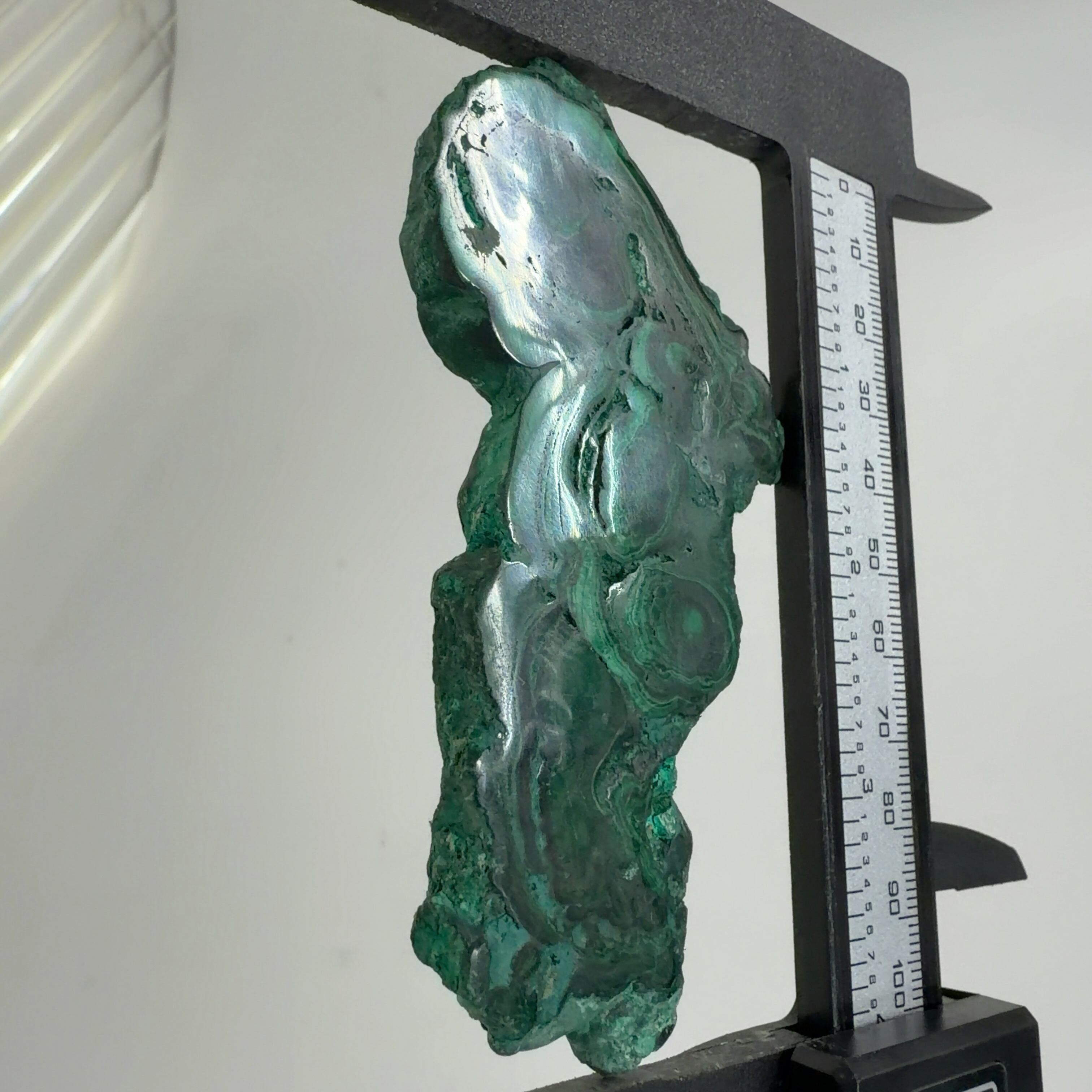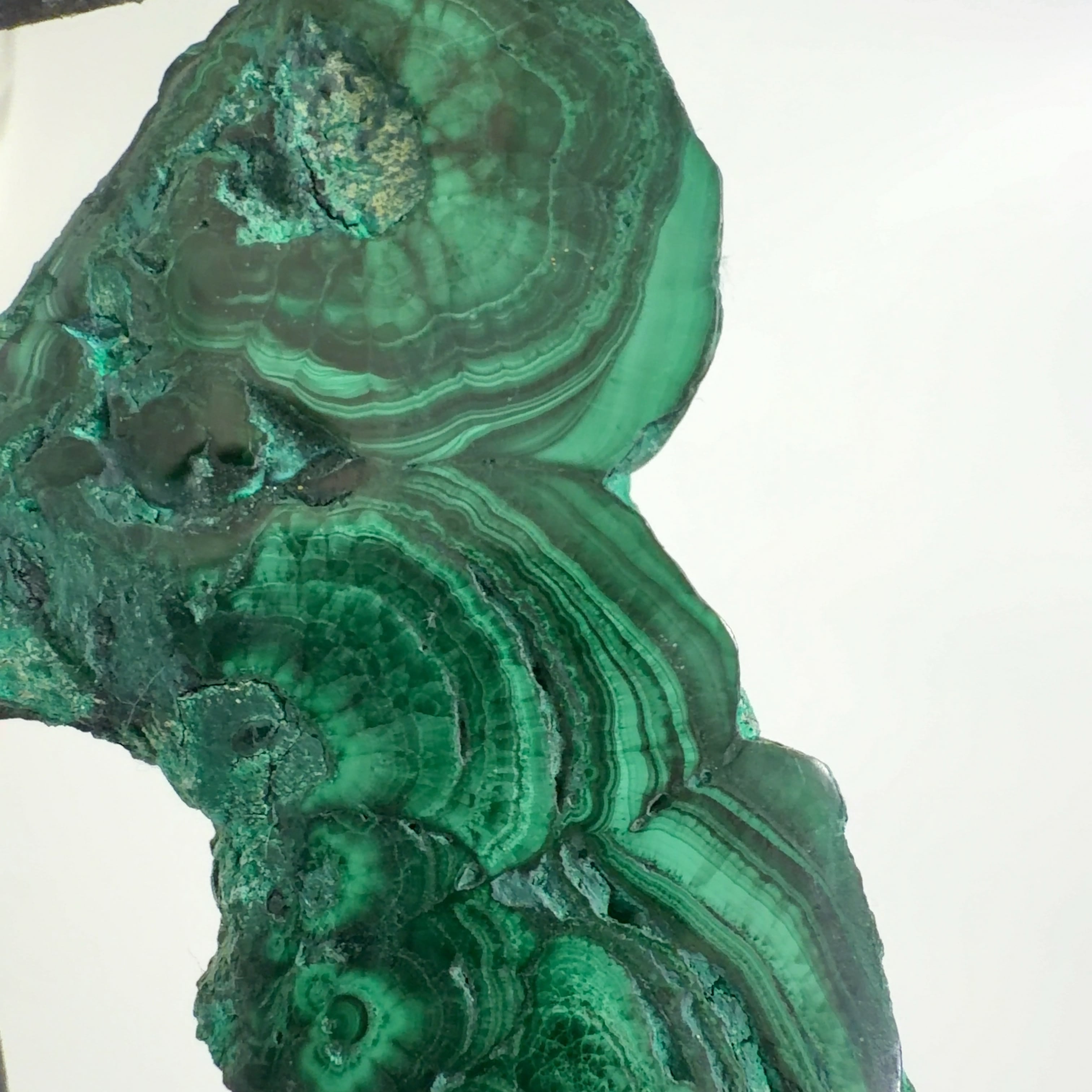 水に溶けた黄銅鉱と水に溶けた二酸化炭素が反応してできる鉱物で、斜めから光を反射させると孔雀の羽のように見えるので和名は孔雀石と名付けられています。