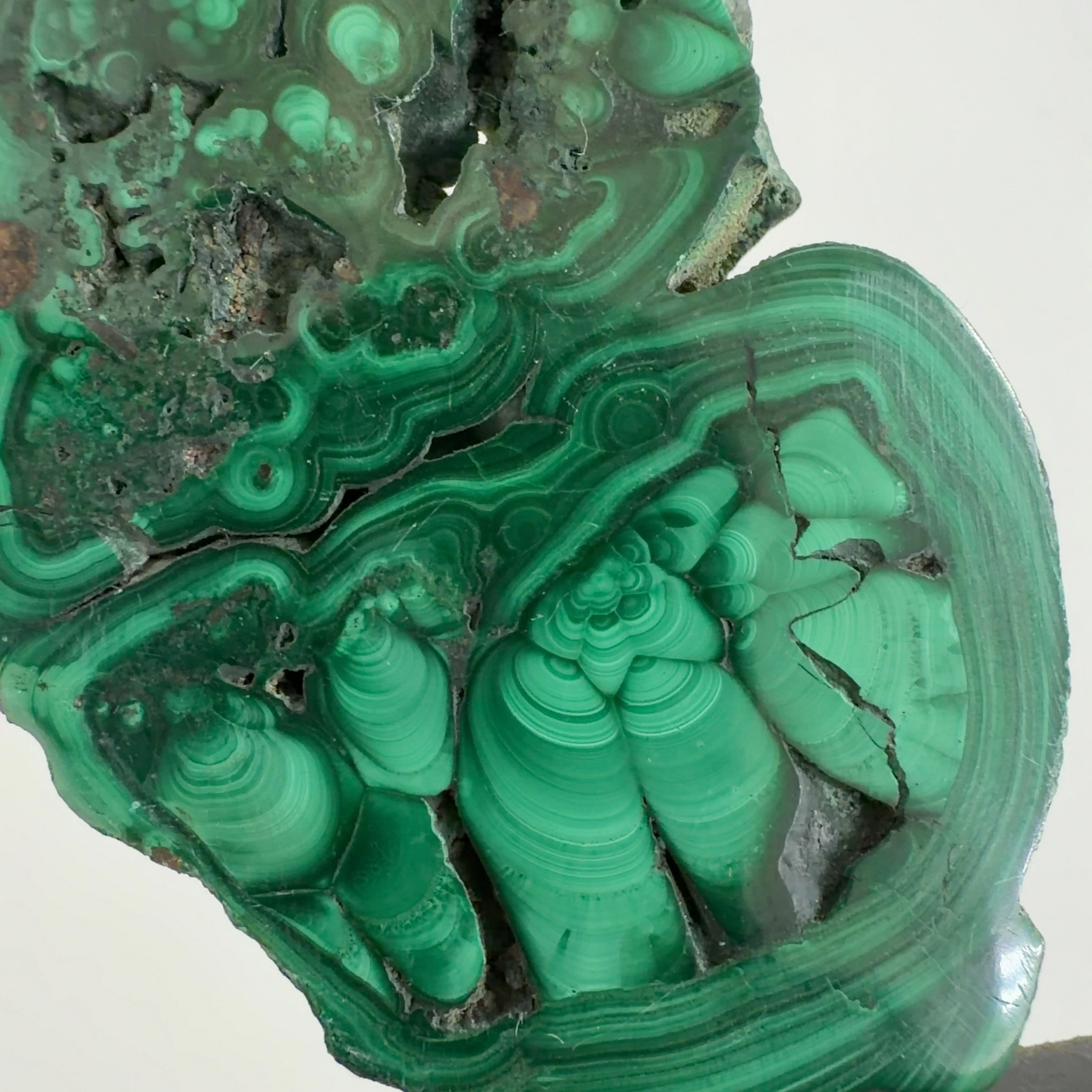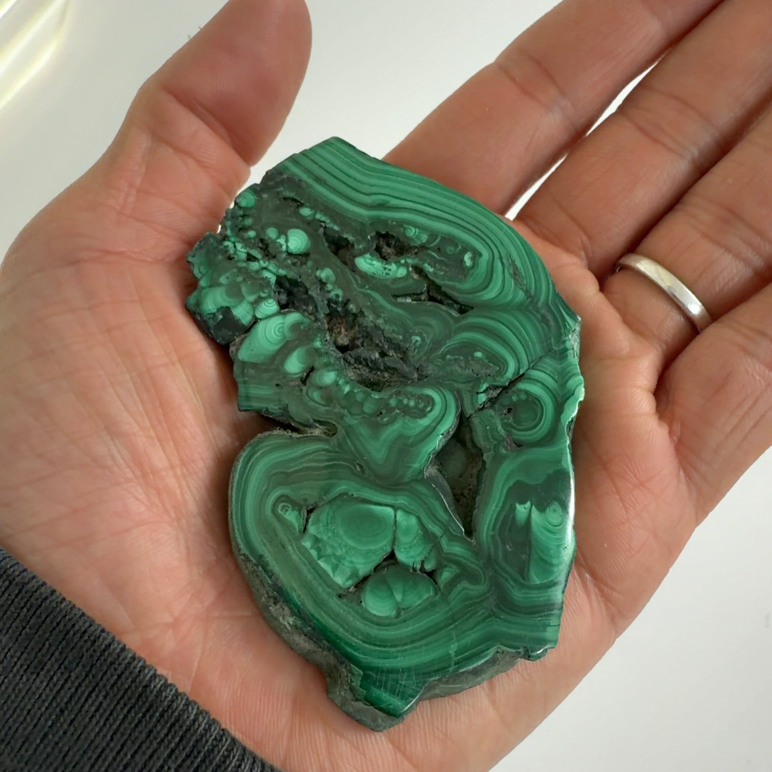 水に溶けた黄銅鉱と水に溶けた二酸化炭素が反応してできる鉱物で、斜めから光を反射させると孔雀の羽のように見えるので和名は孔雀石と名付けられています。