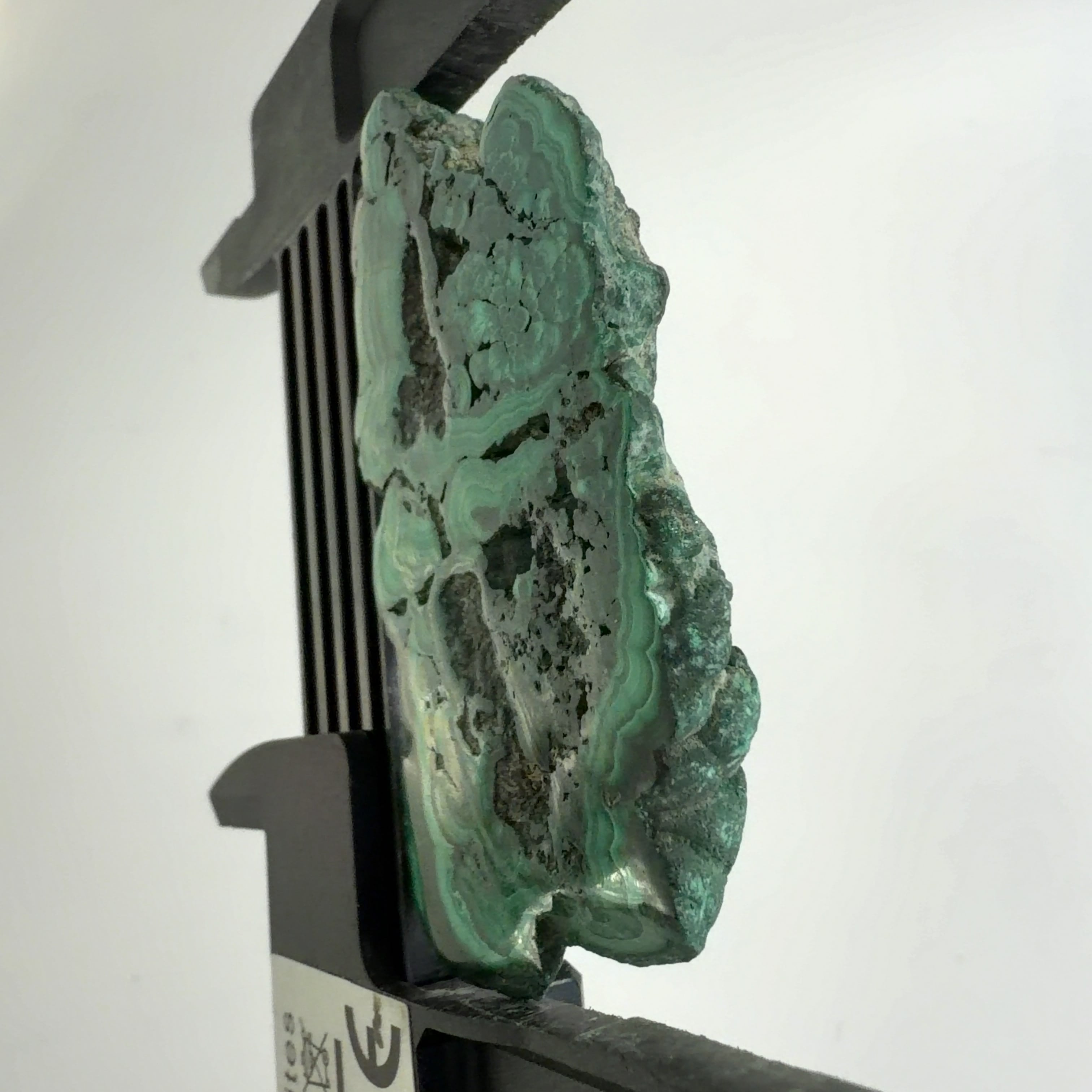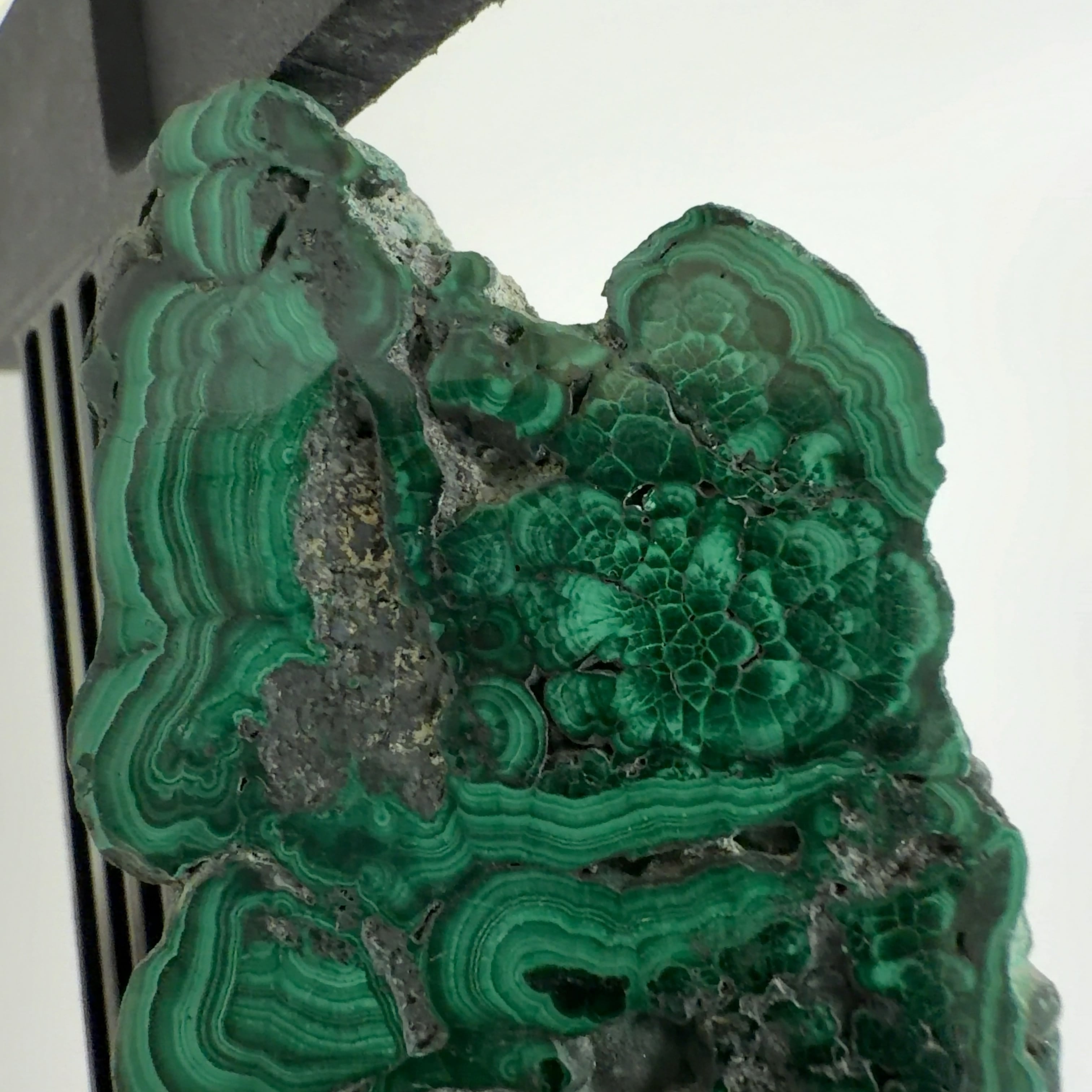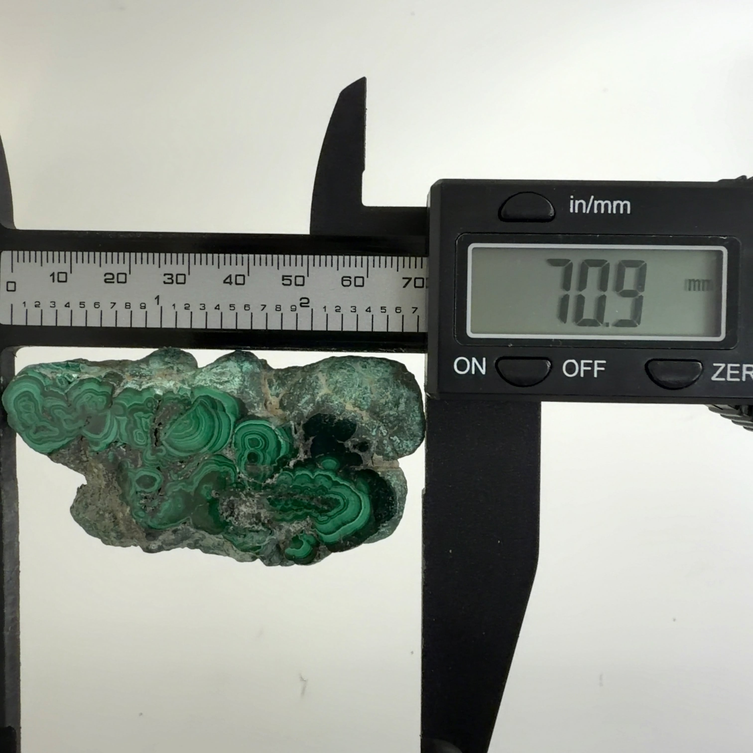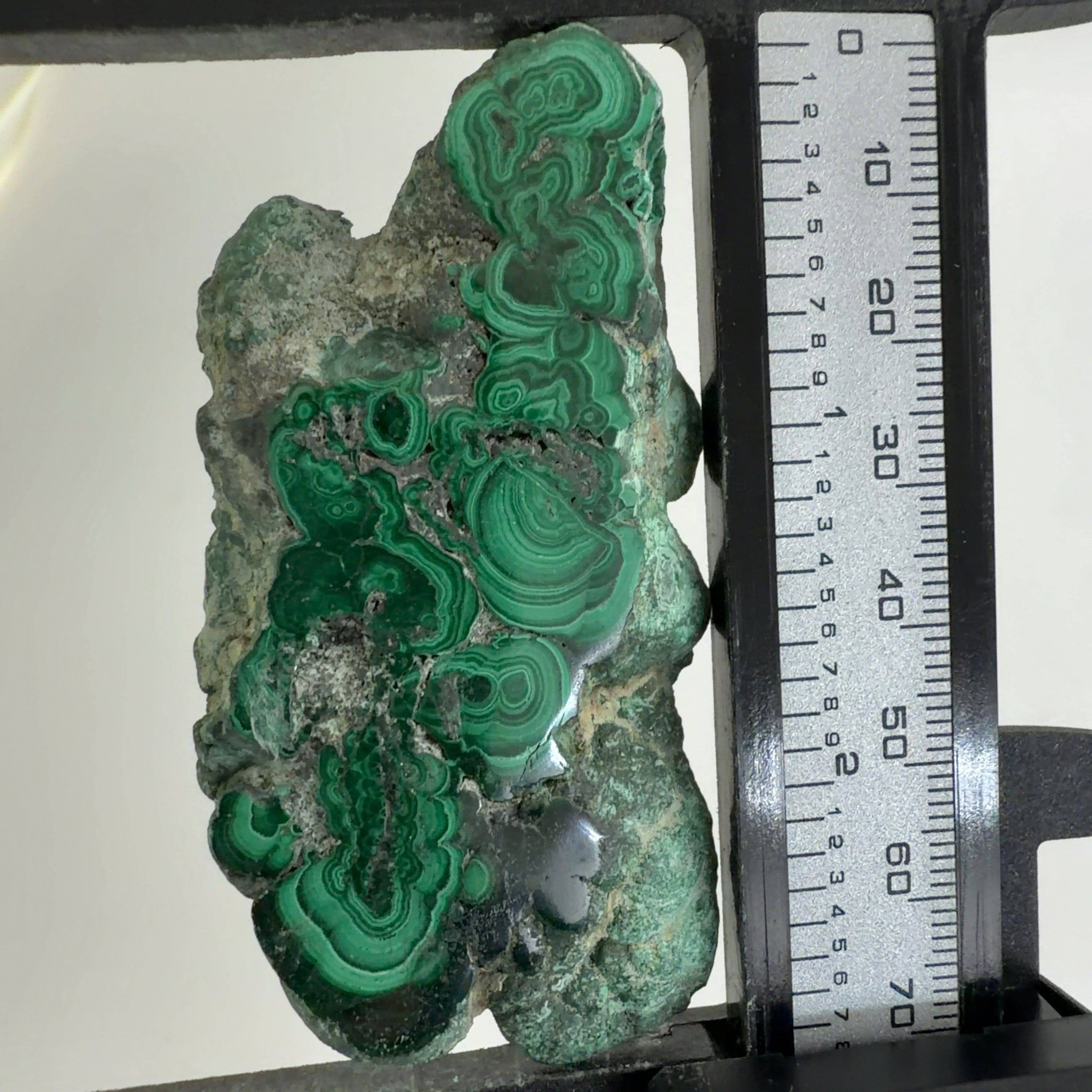 水に溶けた黄銅鉱と水に溶けた二酸化炭素が反応してできる鉱物で、斜めから光を反射させると孔雀の羽のように見えるので和名は孔雀石と名付けられています。