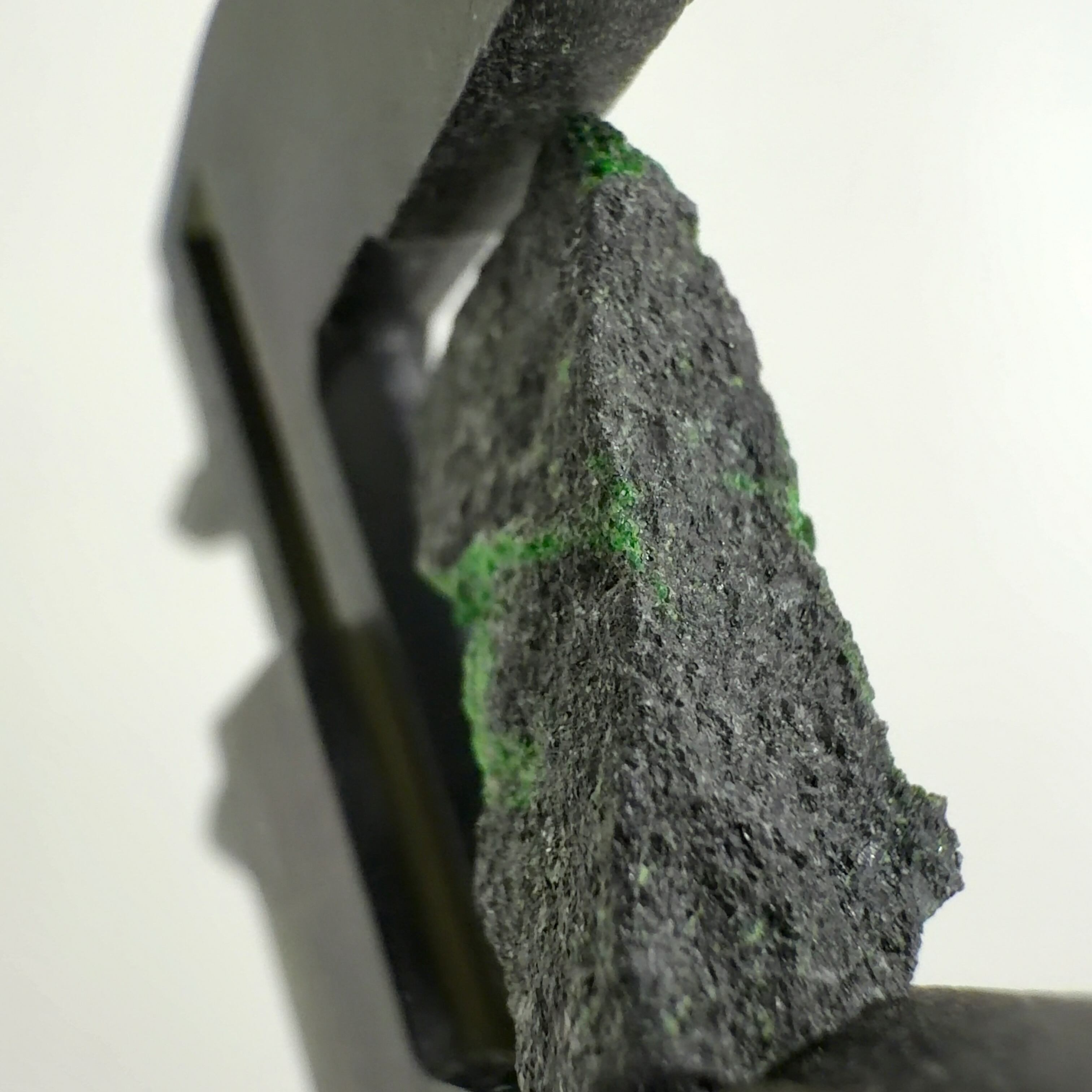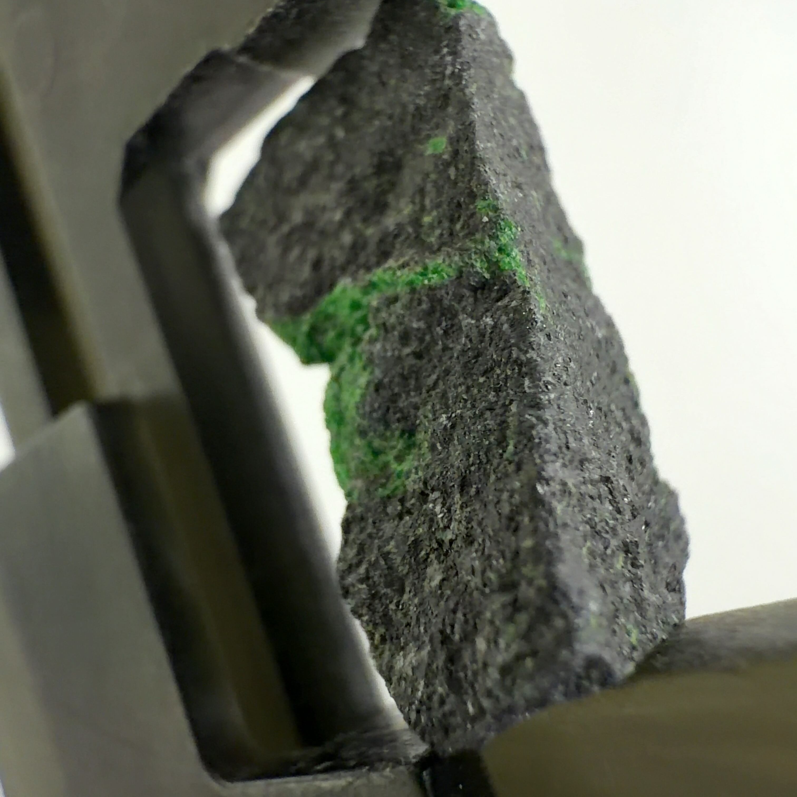 クロム鉄鉱の表面に、濃い緑色の微細な十二面体結晶で付着しています。