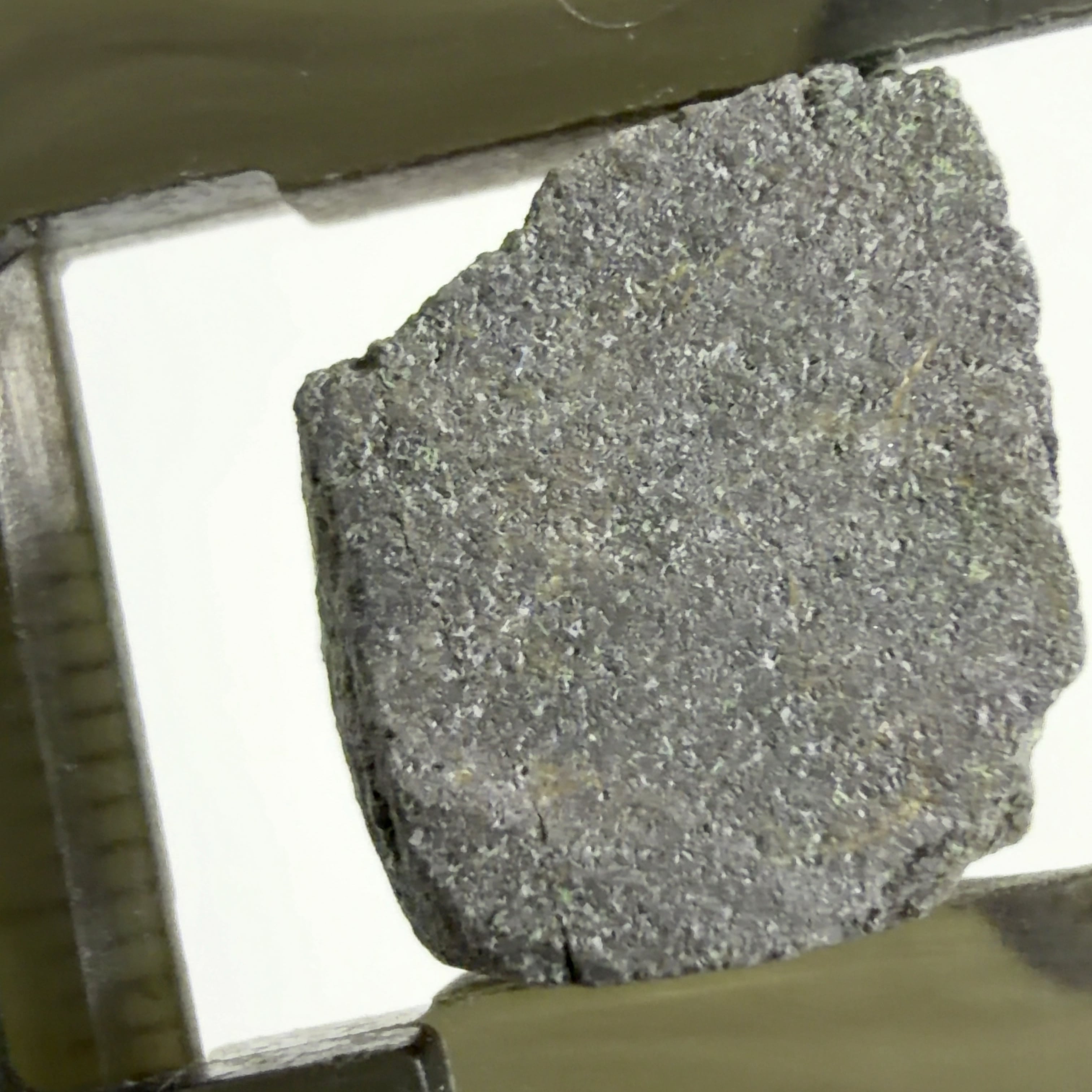クロム鉄鉱の表面に、濃い緑色の微細な十二面体結晶で付着しています。