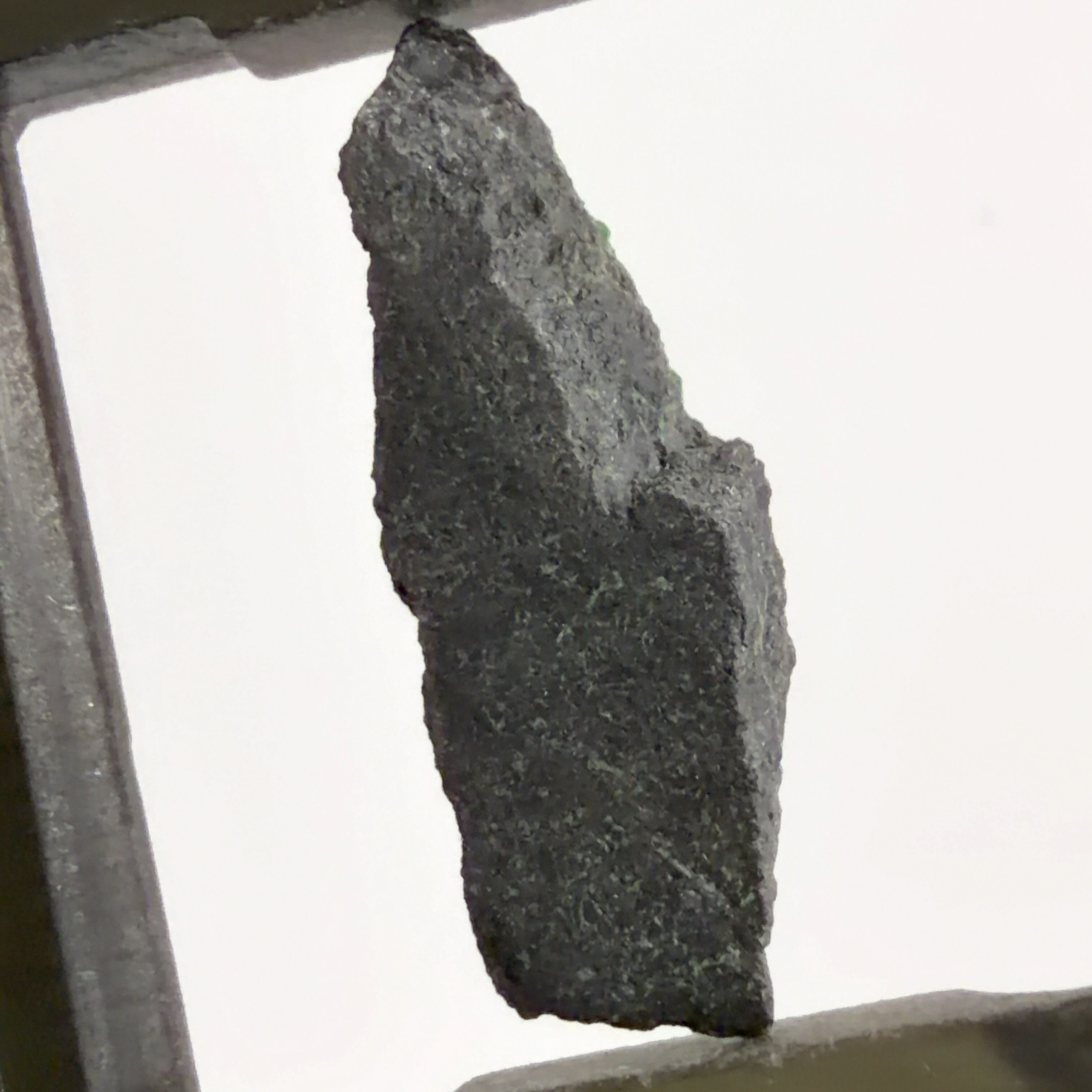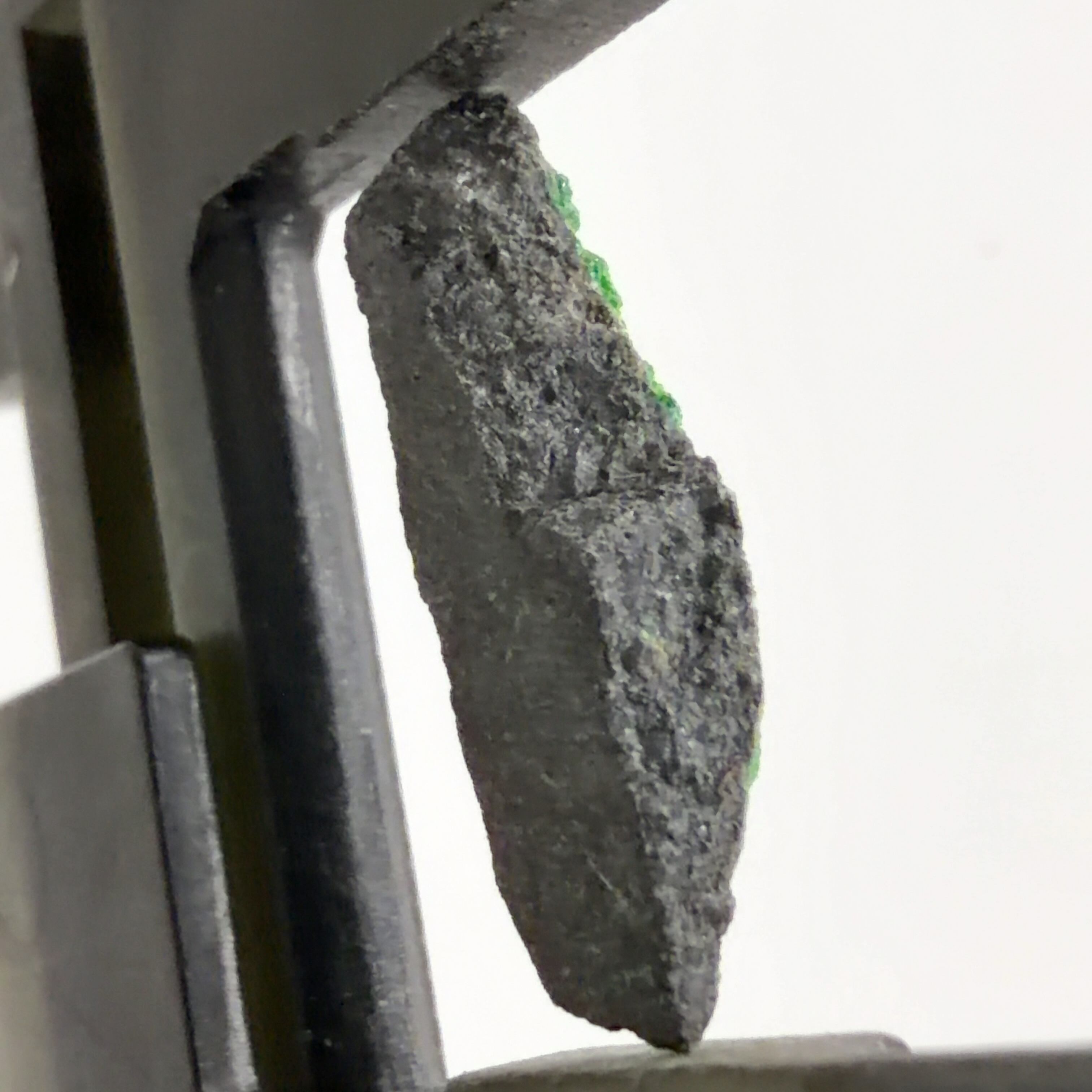 クロム鉄鉱の表面に、濃い緑色の微細な十二面体結晶で付着しています。
