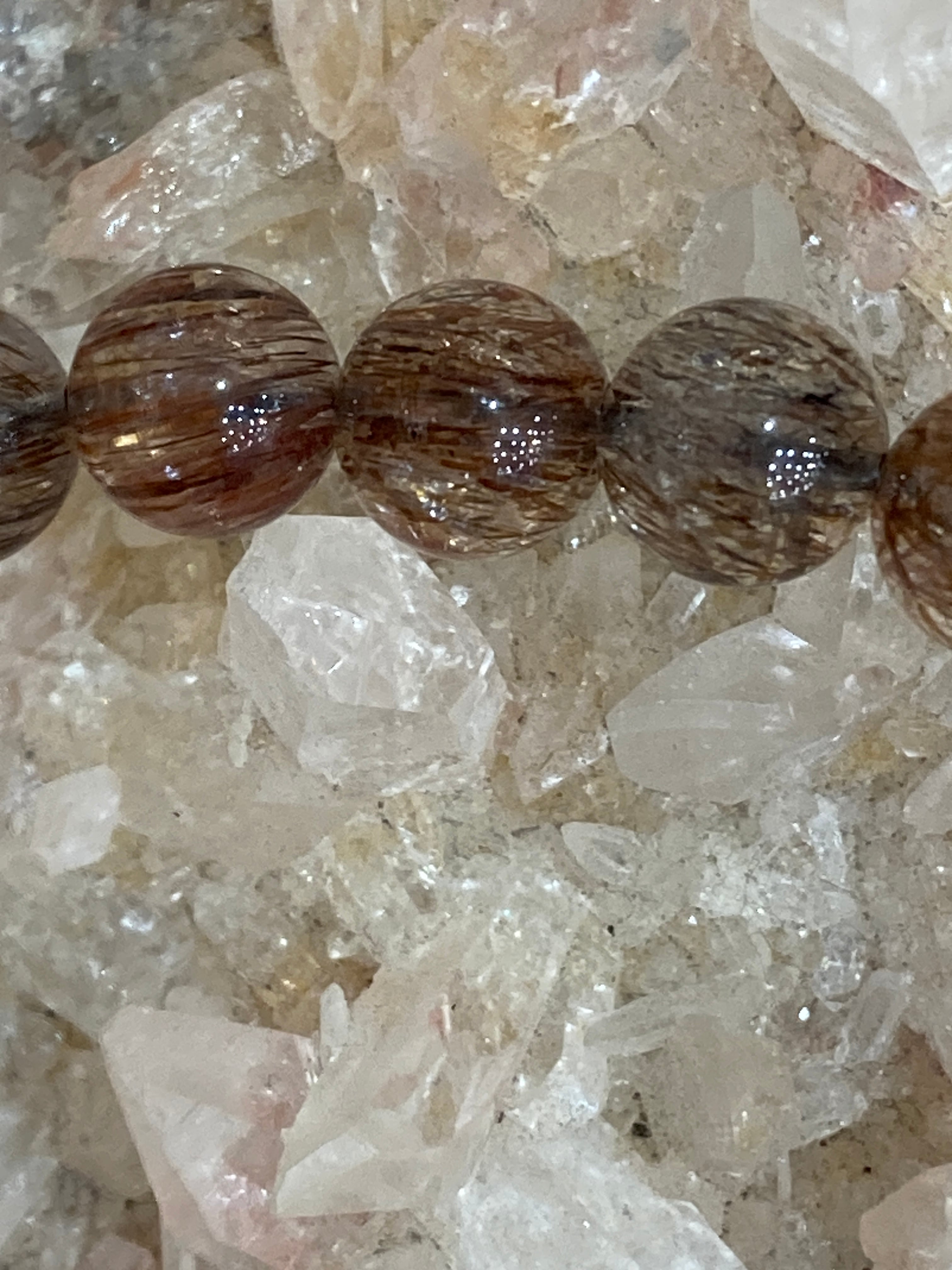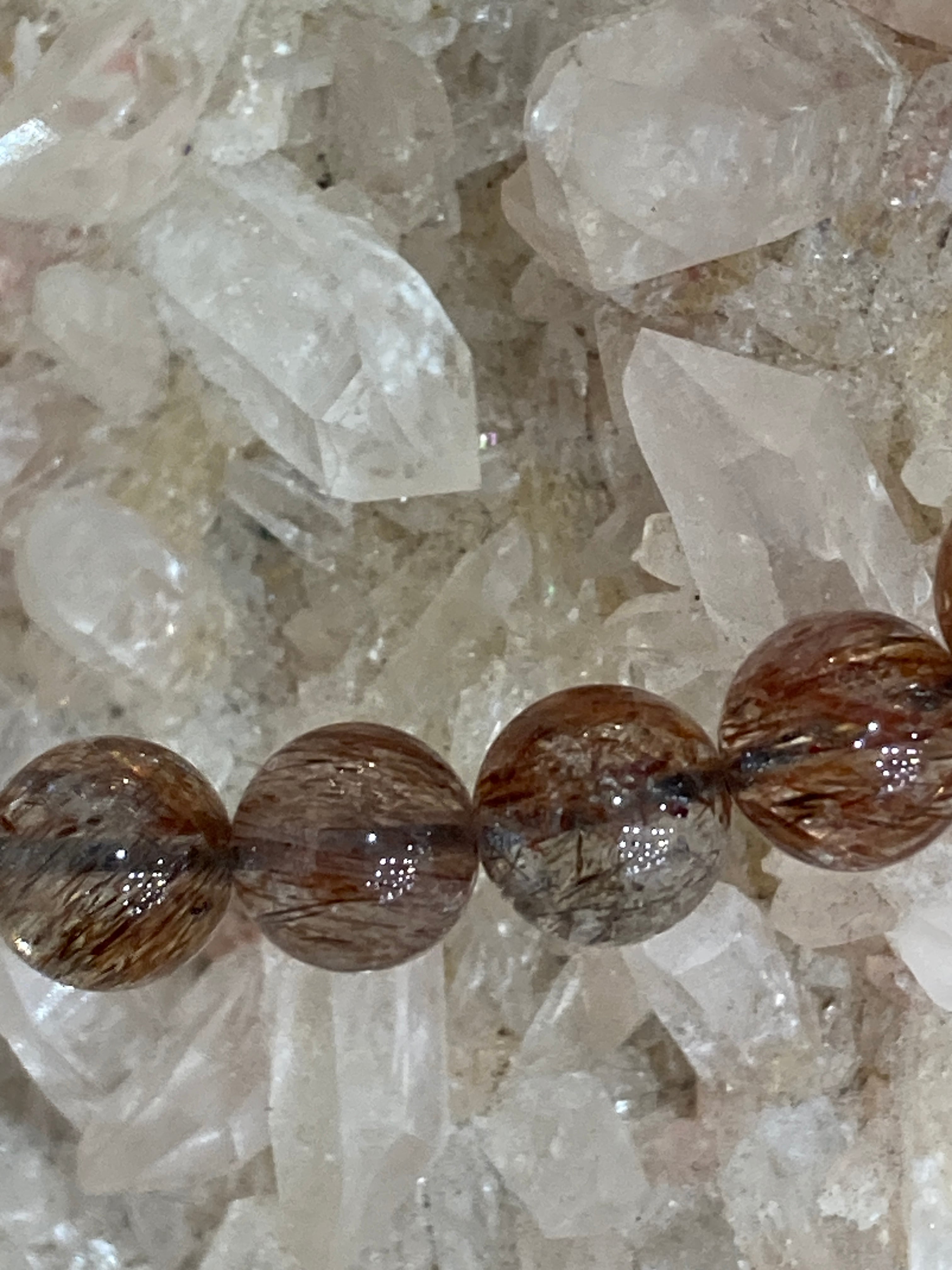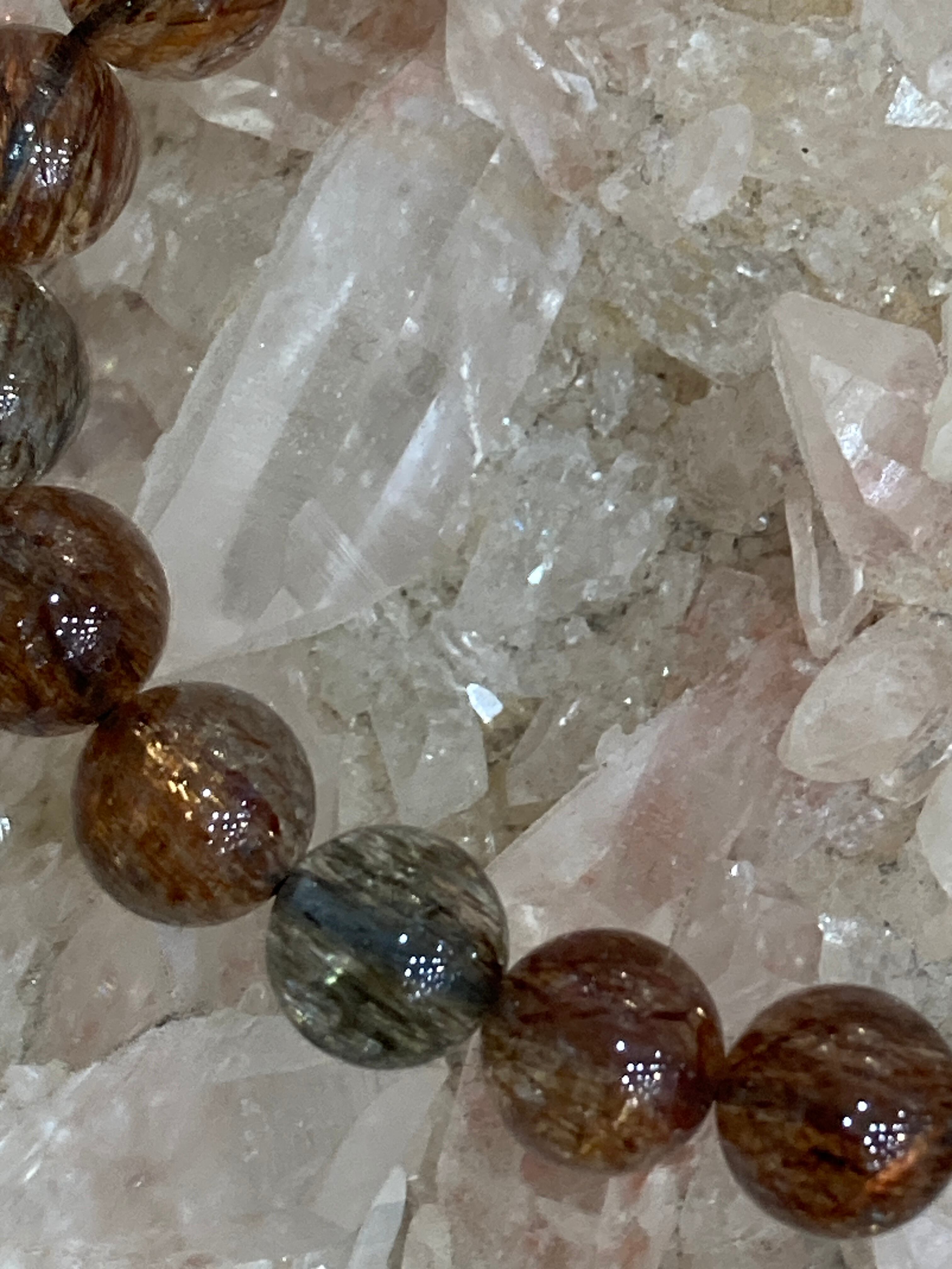 葉のように薄い板状、または針状のマイカ(雲母)がクォーツに内包されており、光に当たるとキラキラと輝く美しい煌めきが特徴です。