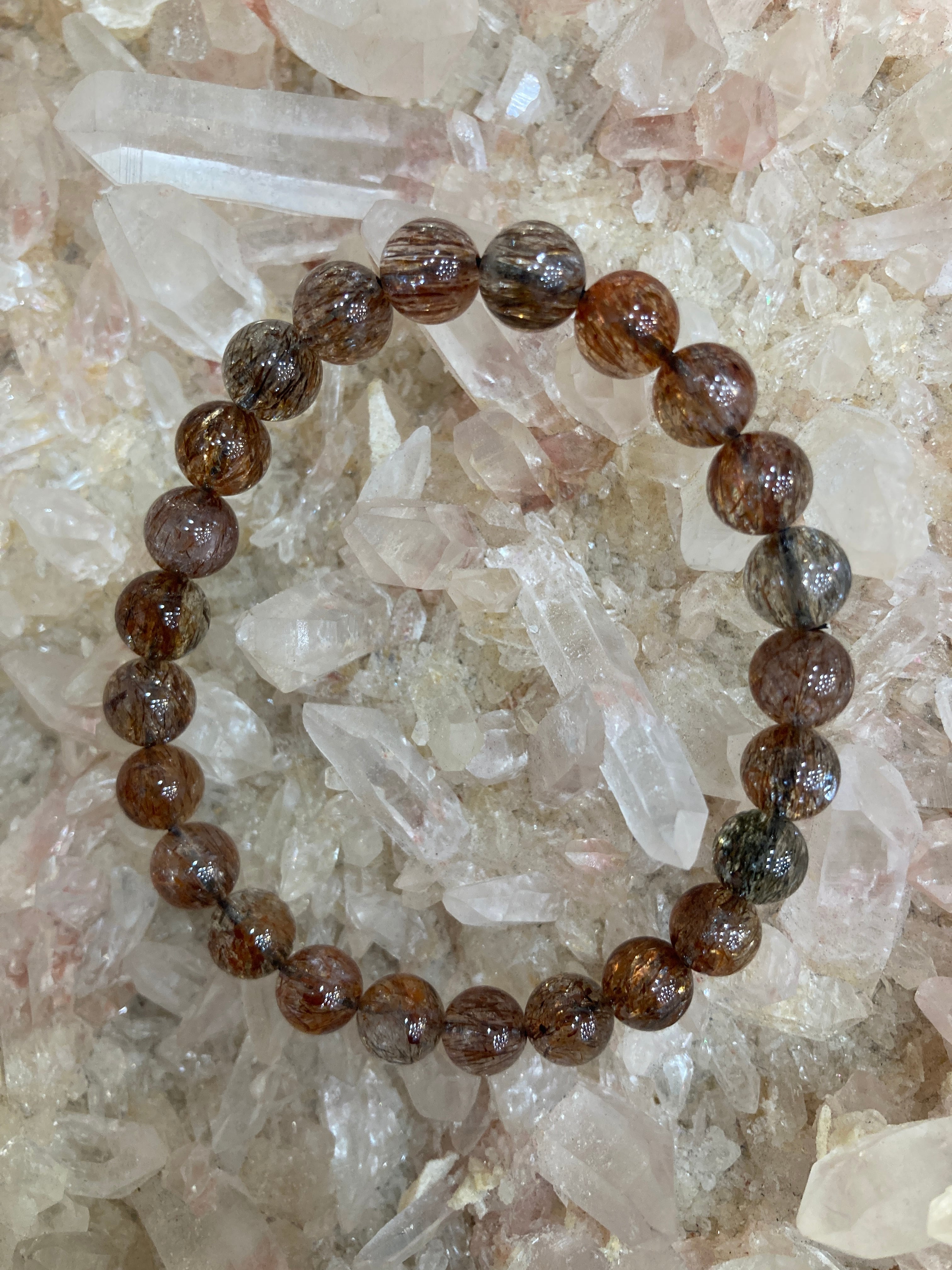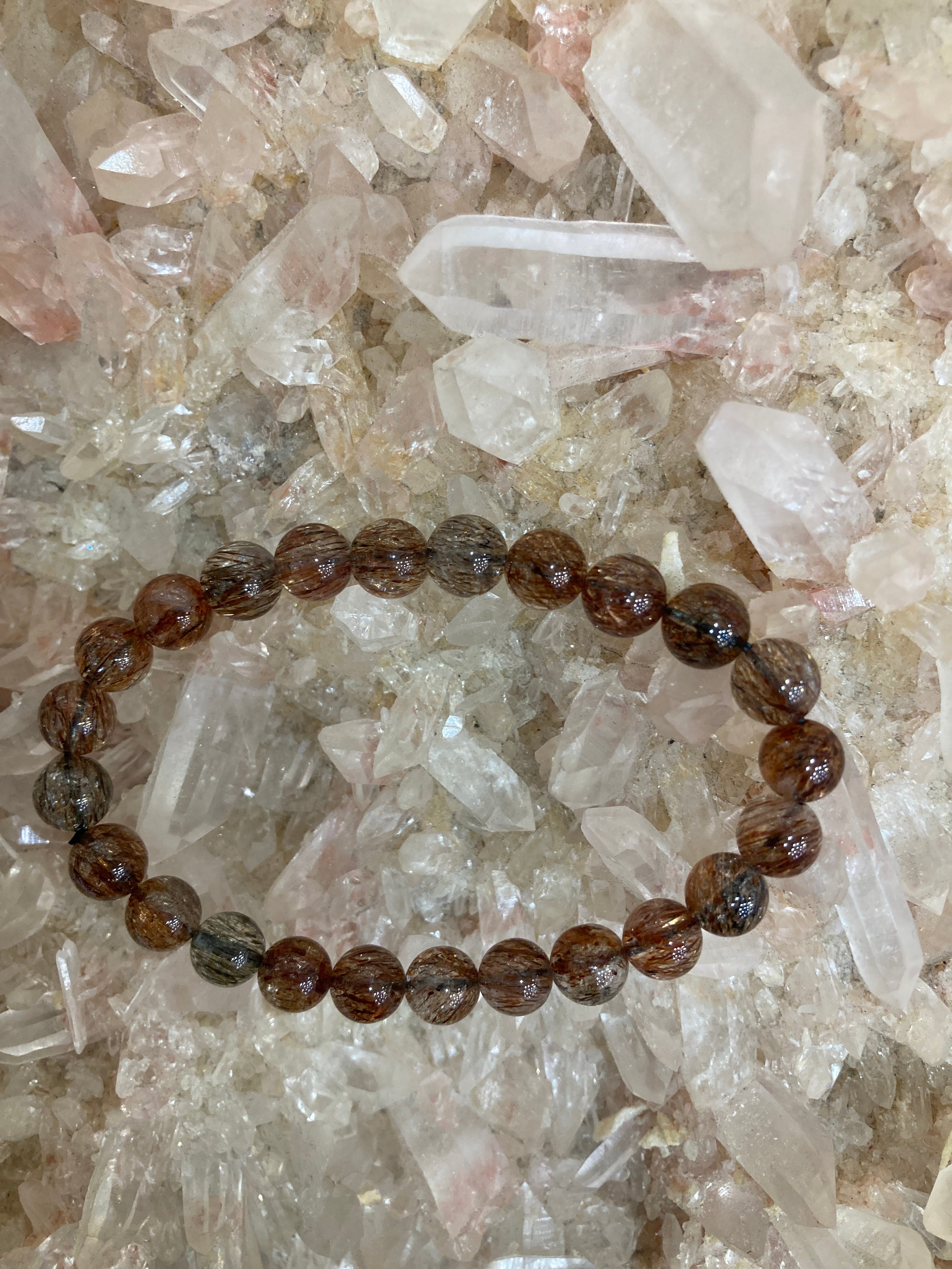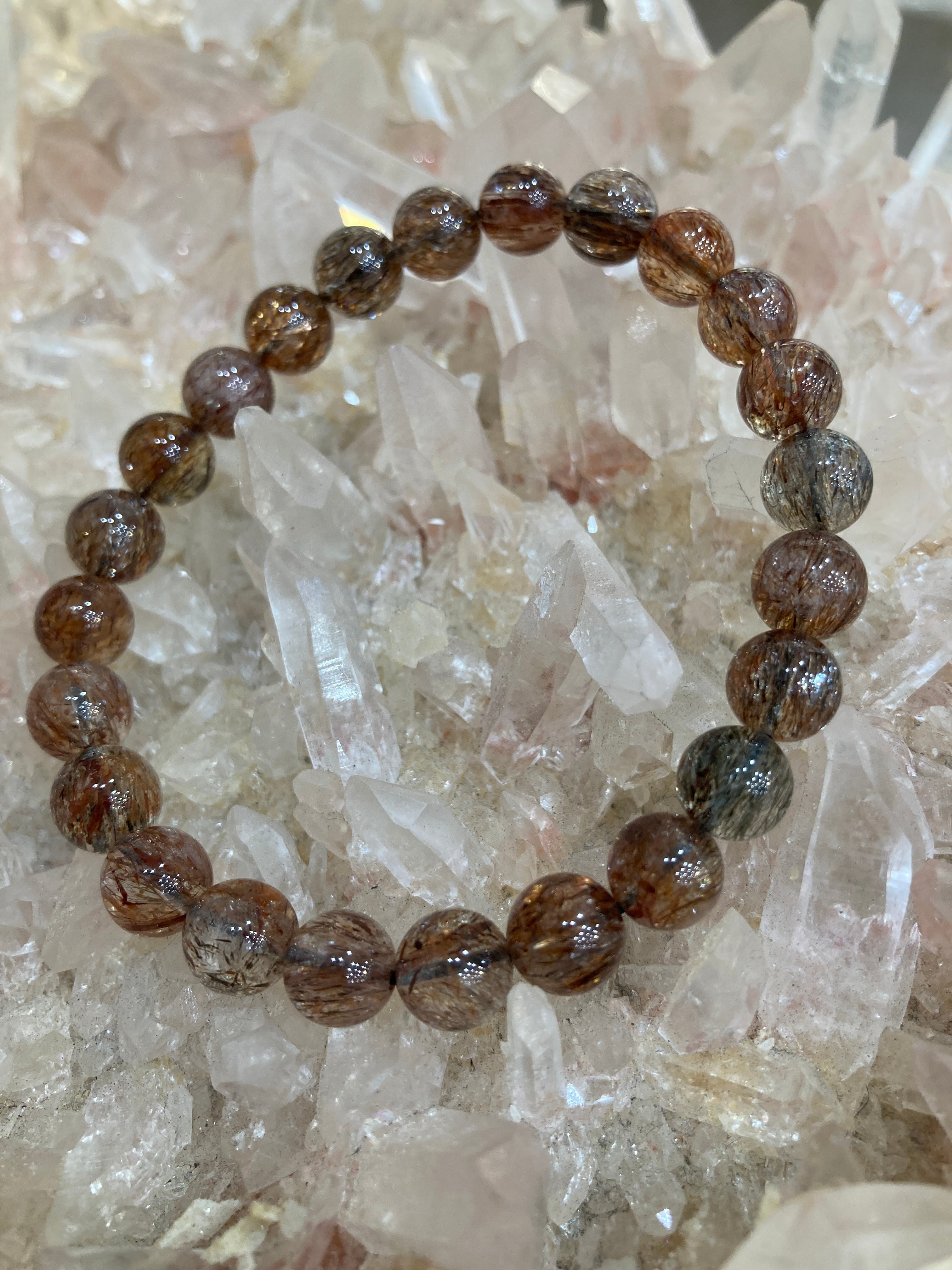 葉のように薄い板状、または針状のマイカ(雲母)がクォーツに内包されており、光に当たるとキラキラと輝く美しい煌めきが特徴です。