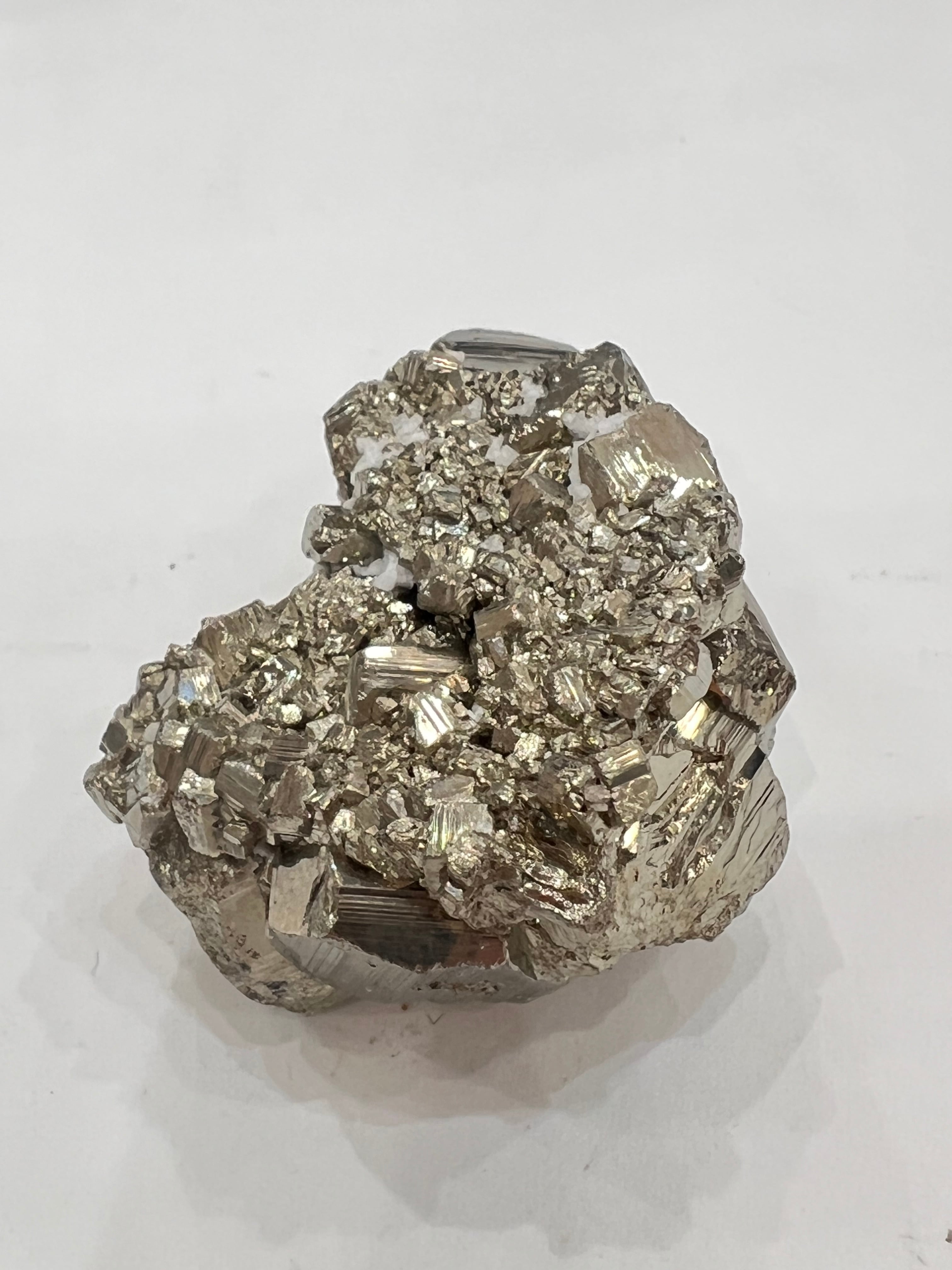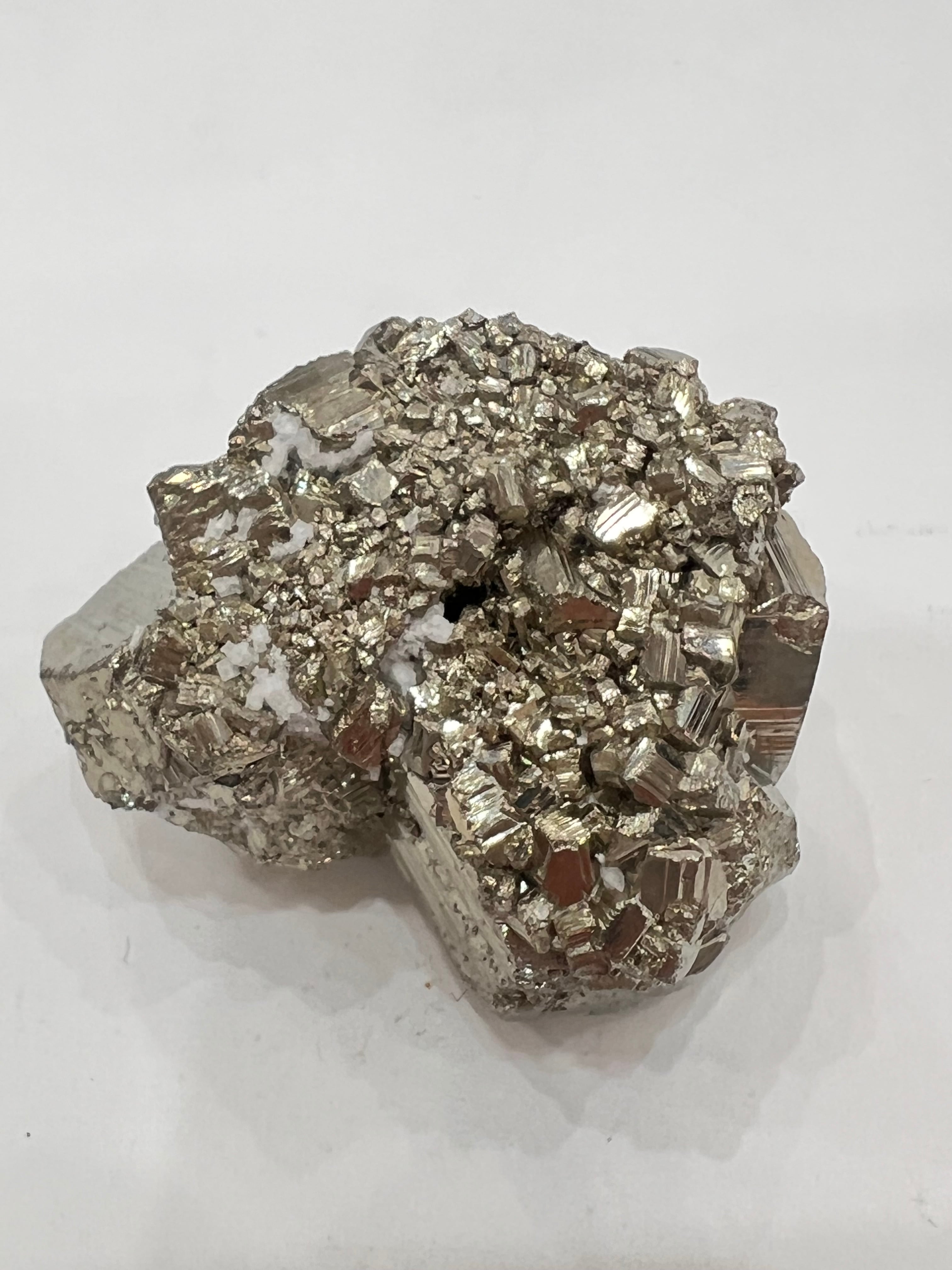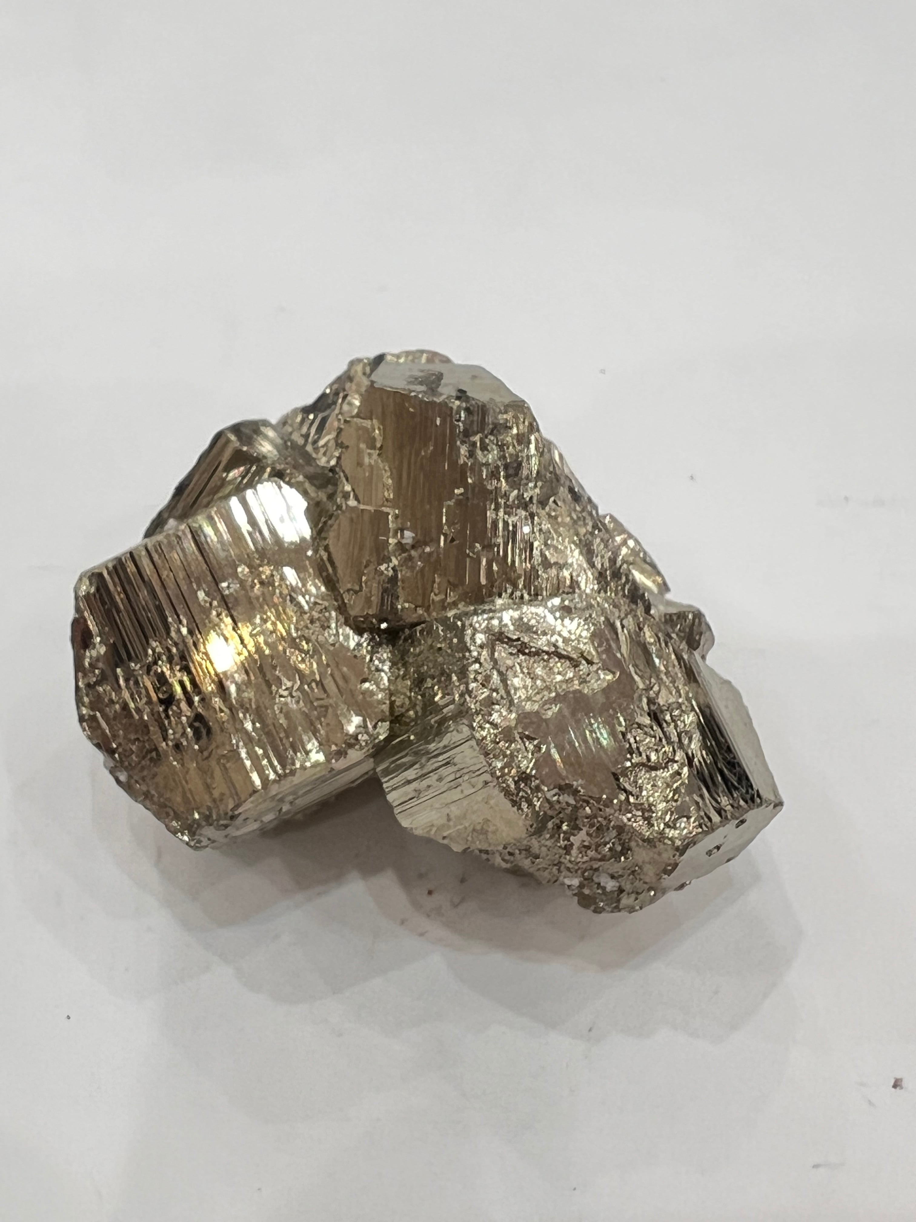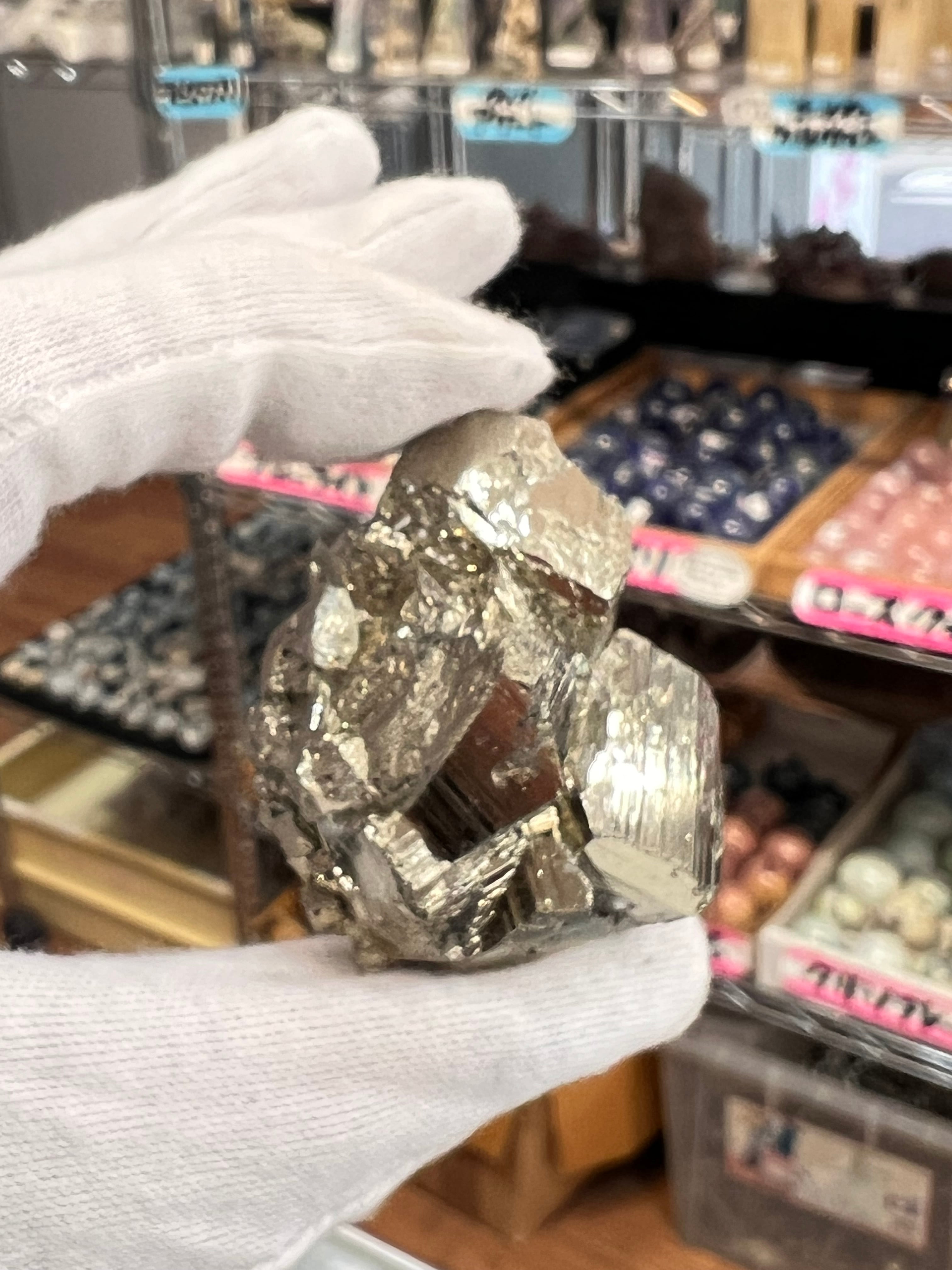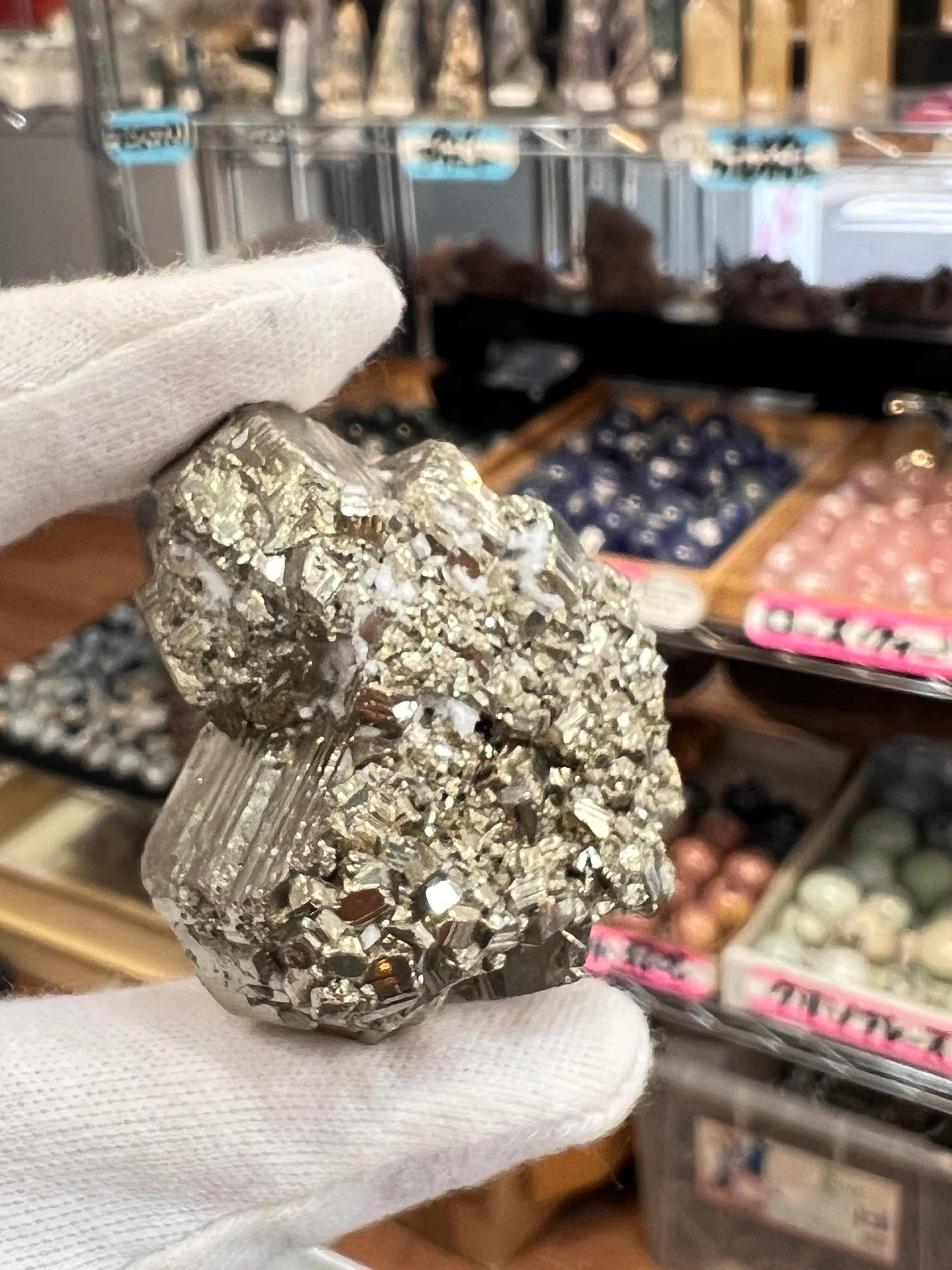硫黄と鉄の化合物。黄金色の美しい光沢および、立方体、五画十二面体、八面体、二十四面体、又はそれらが合わさった形など様々な結晶をするので標本として人気があります。