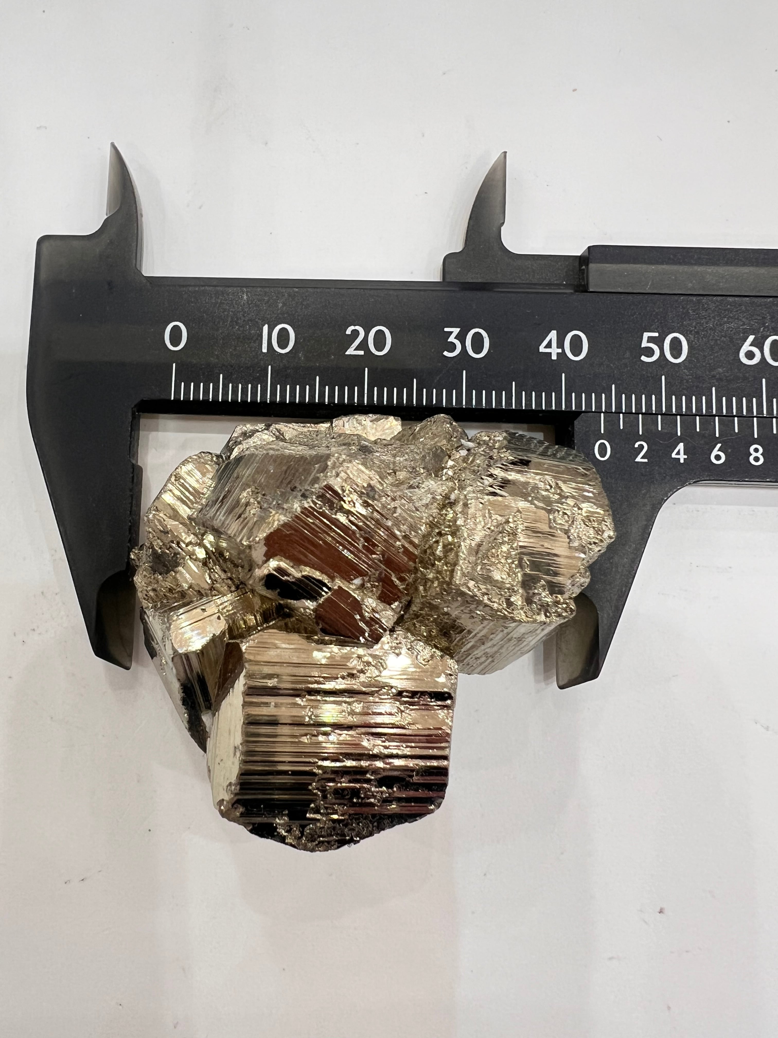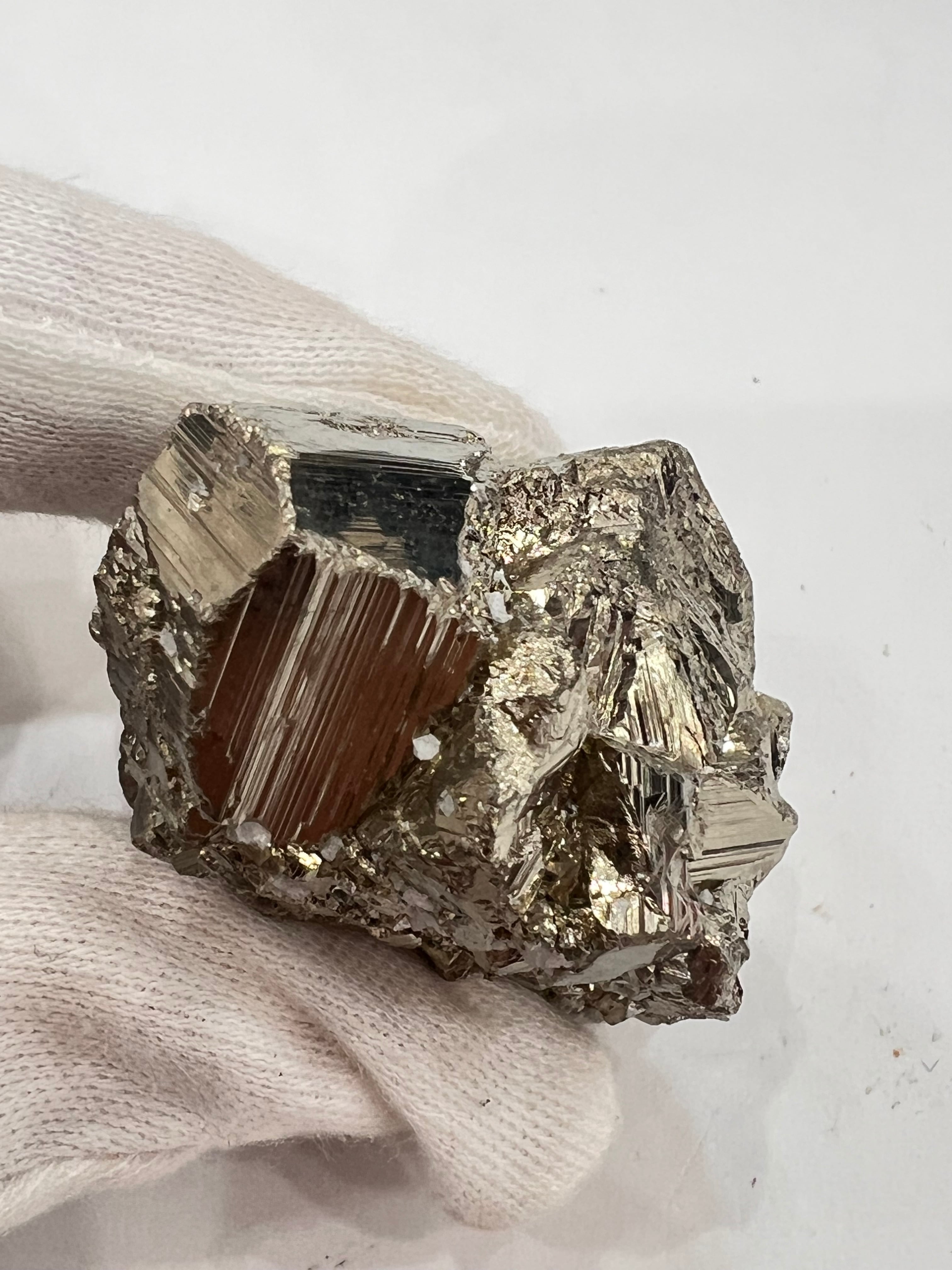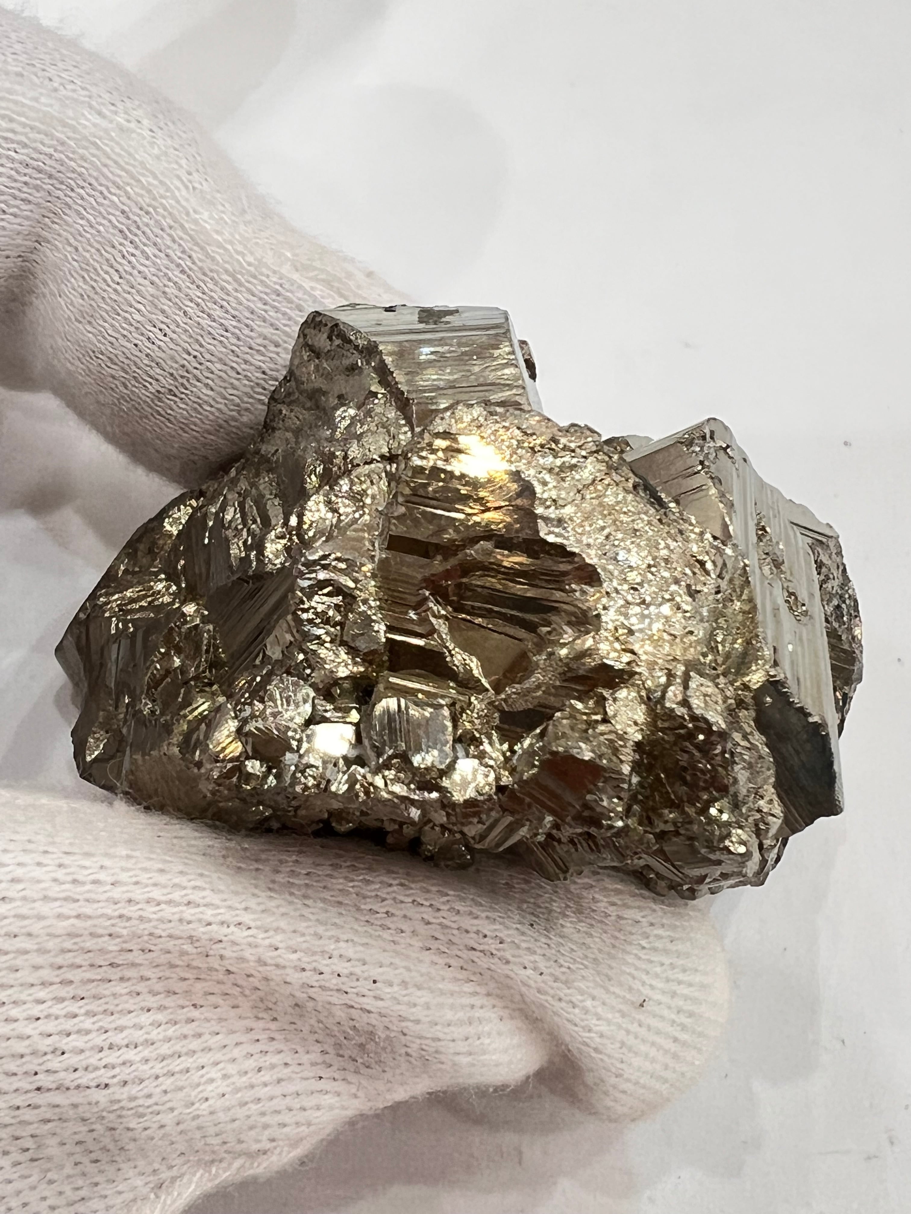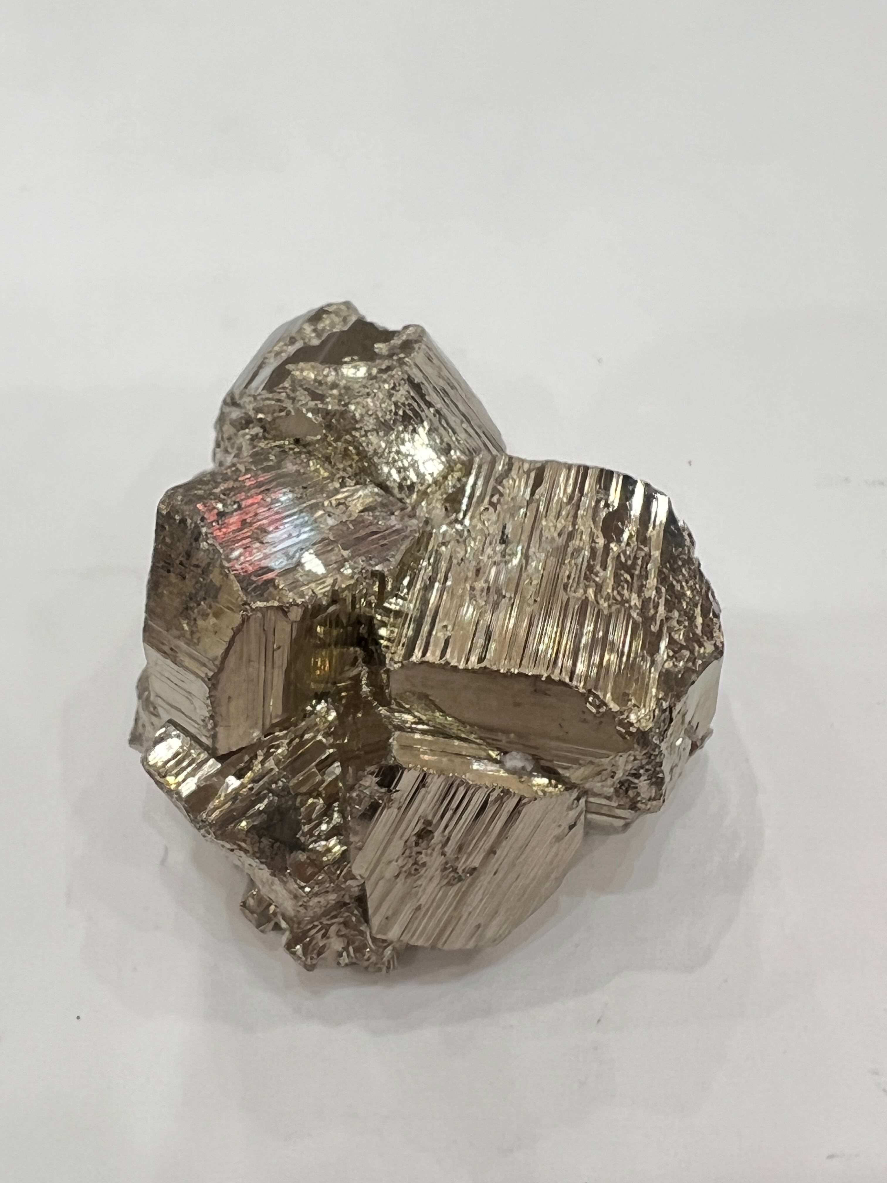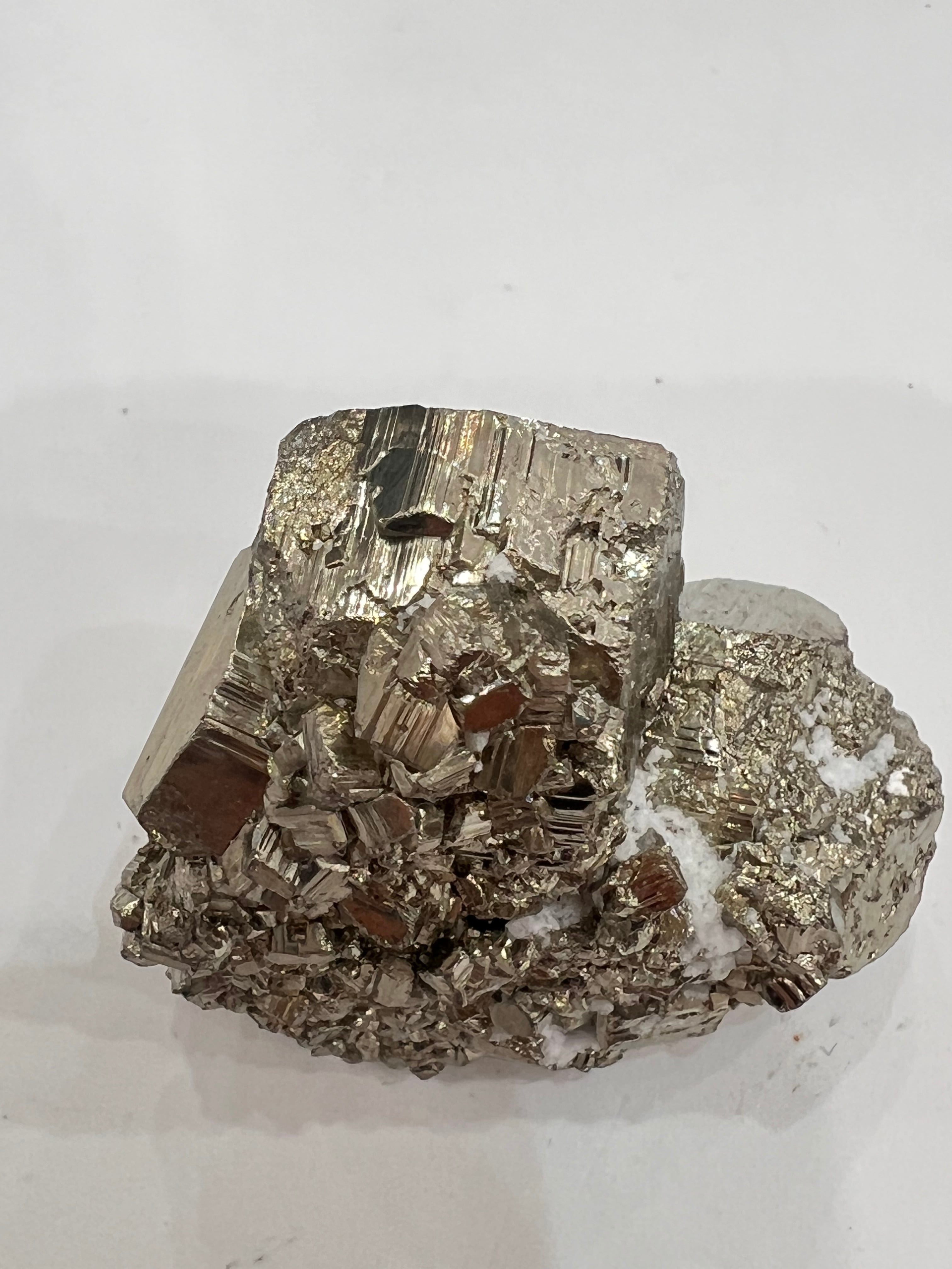 硫黄と鉄の化合物。黄金色の美しい光沢および、立方体、五画十二面体、八面体、二十四面体、又はそれらが合わさった形など様々な結晶をするので標本として人気があります。