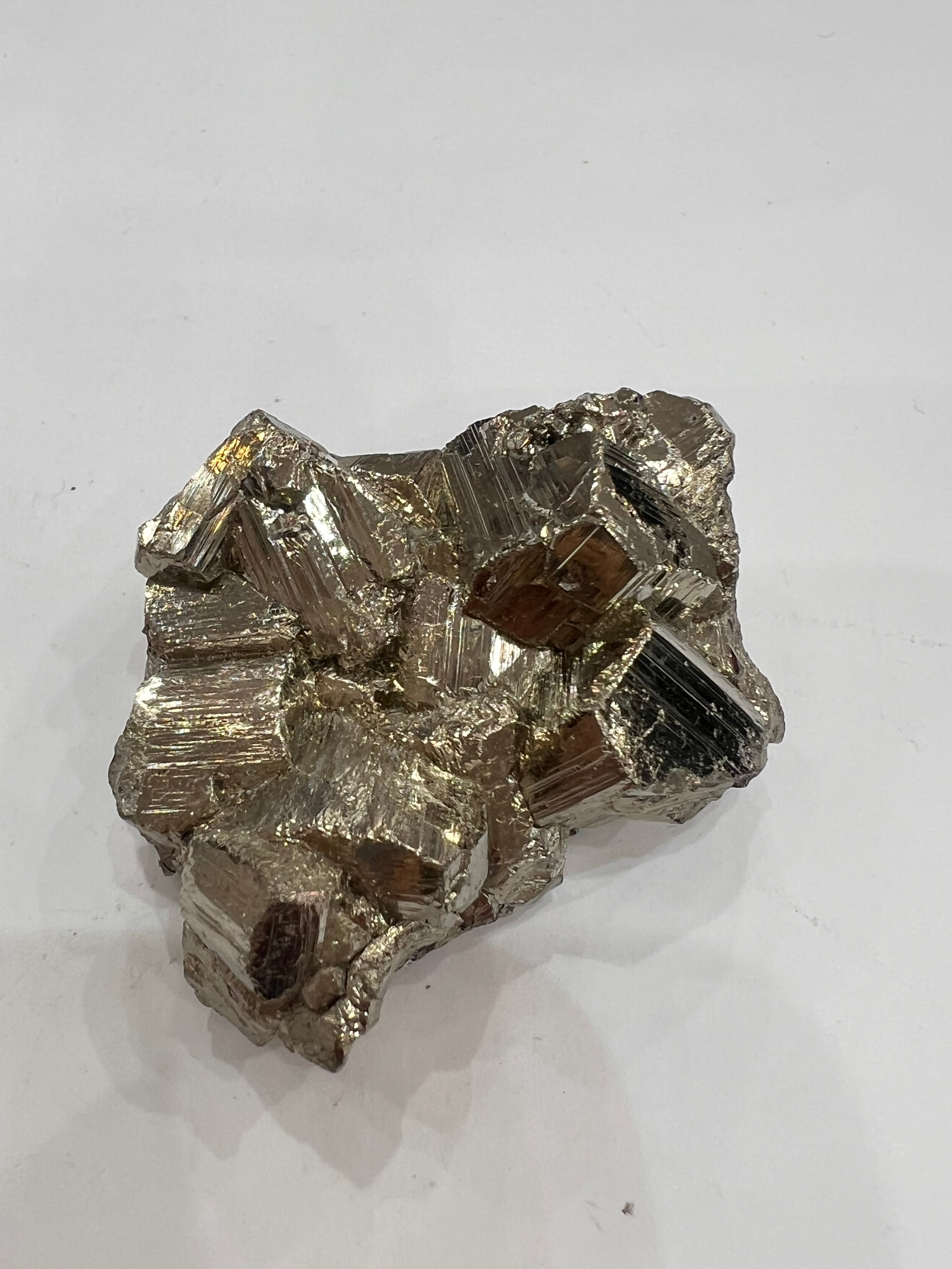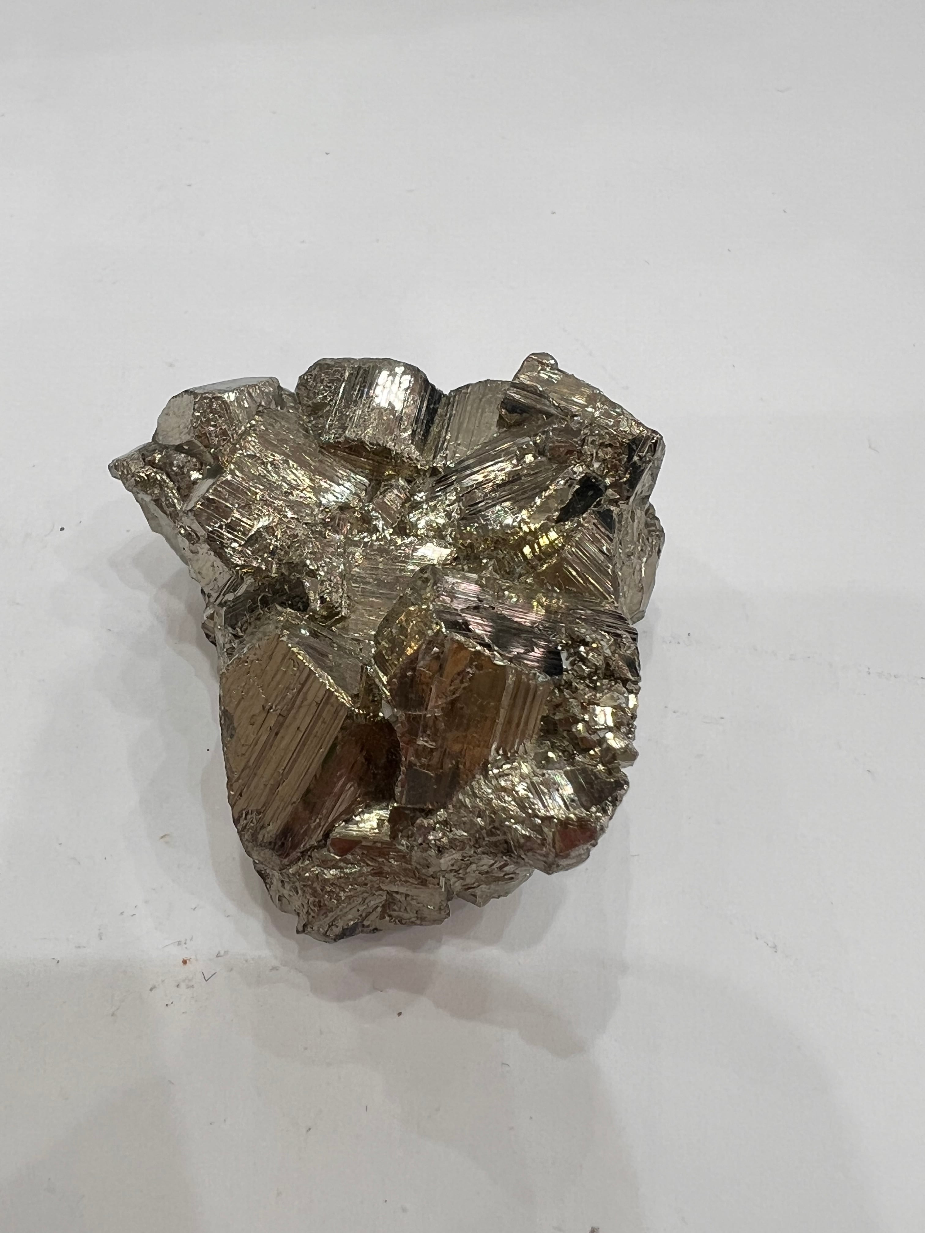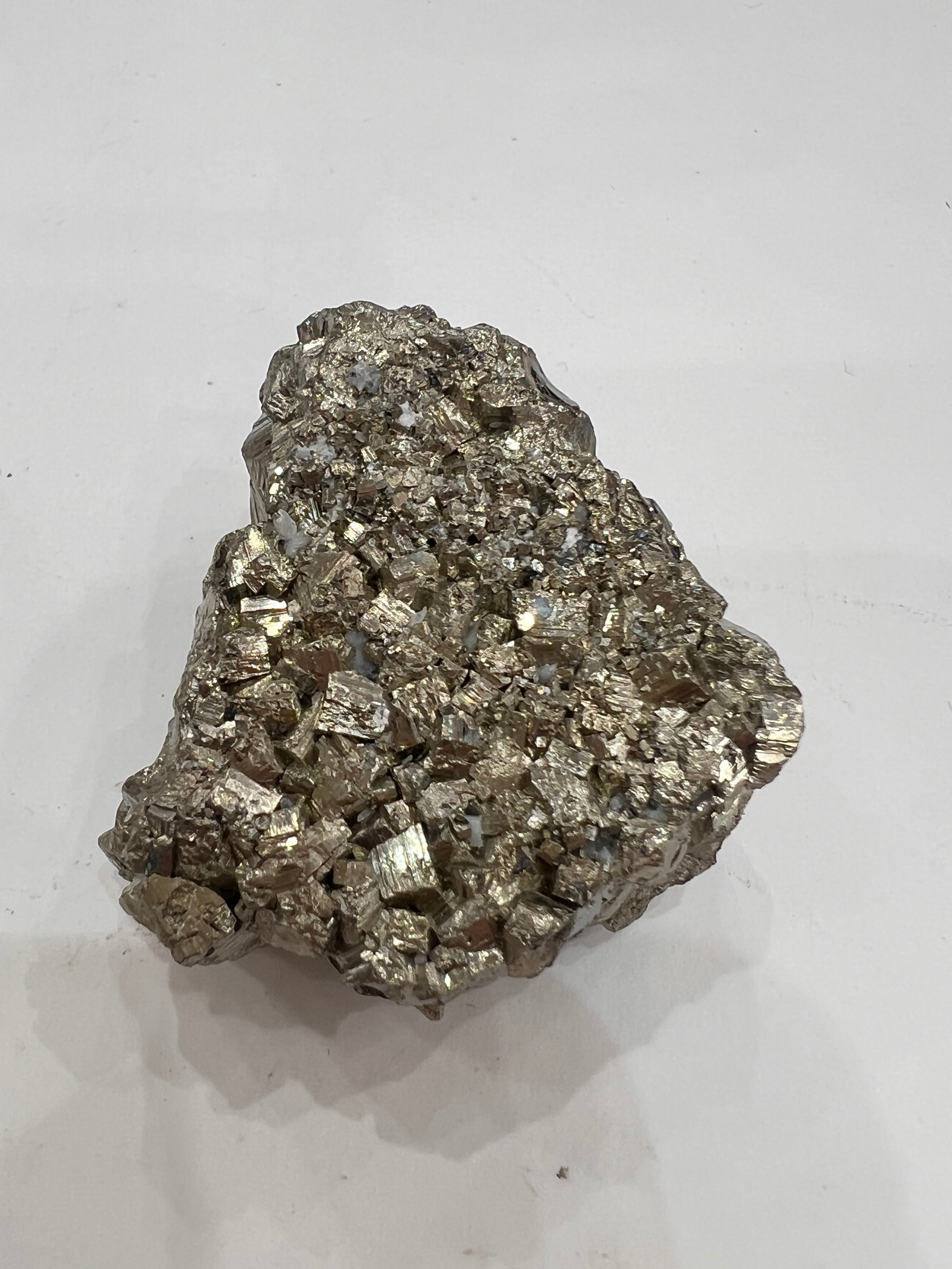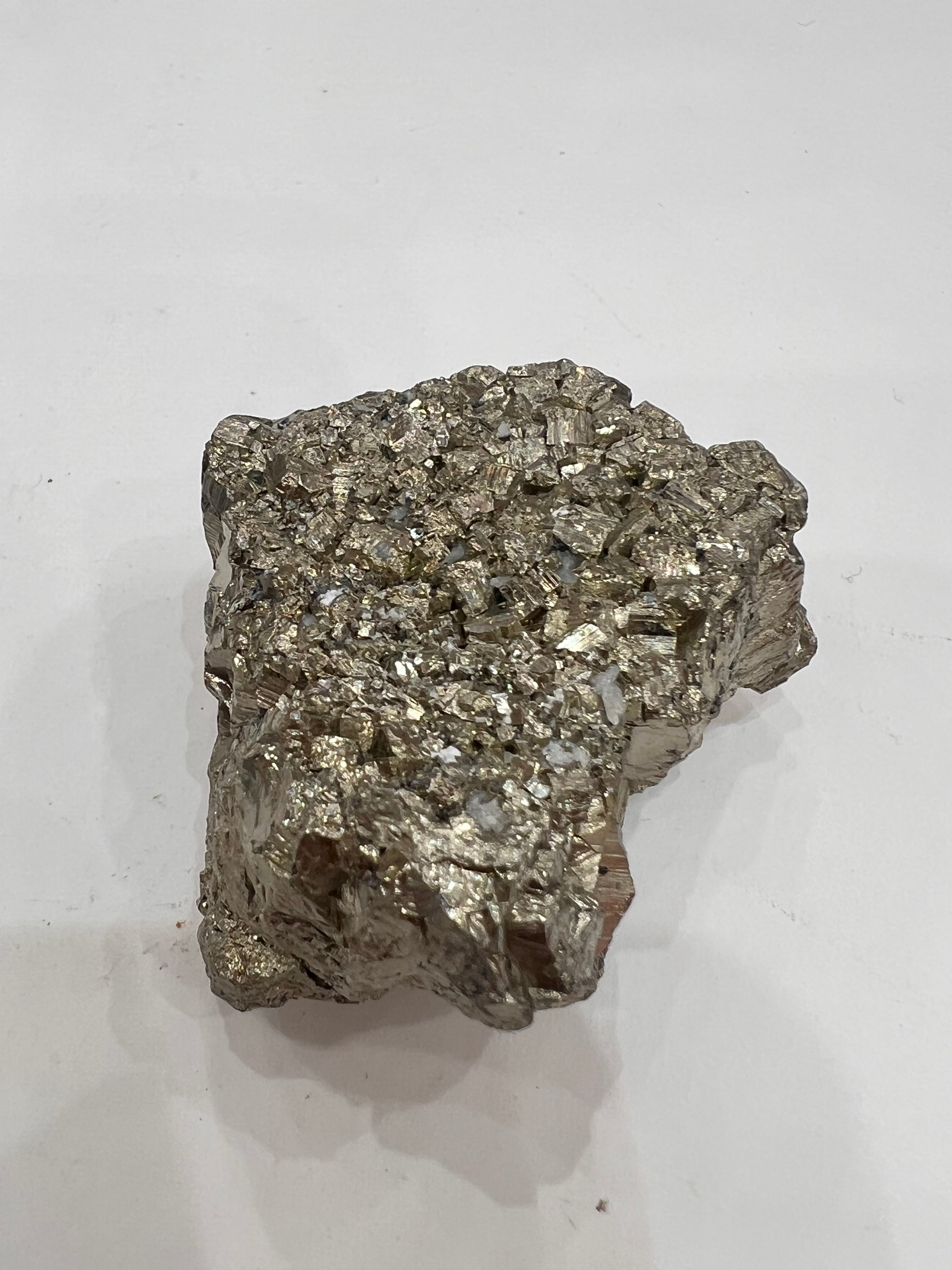 硫黄と鉄の化合物。黄金色の美しい光沢および、立方体、五画十二面体、八面体、二十四面体、又はそれらが合わさった形など様々な結晶をするので標本として人気があります。