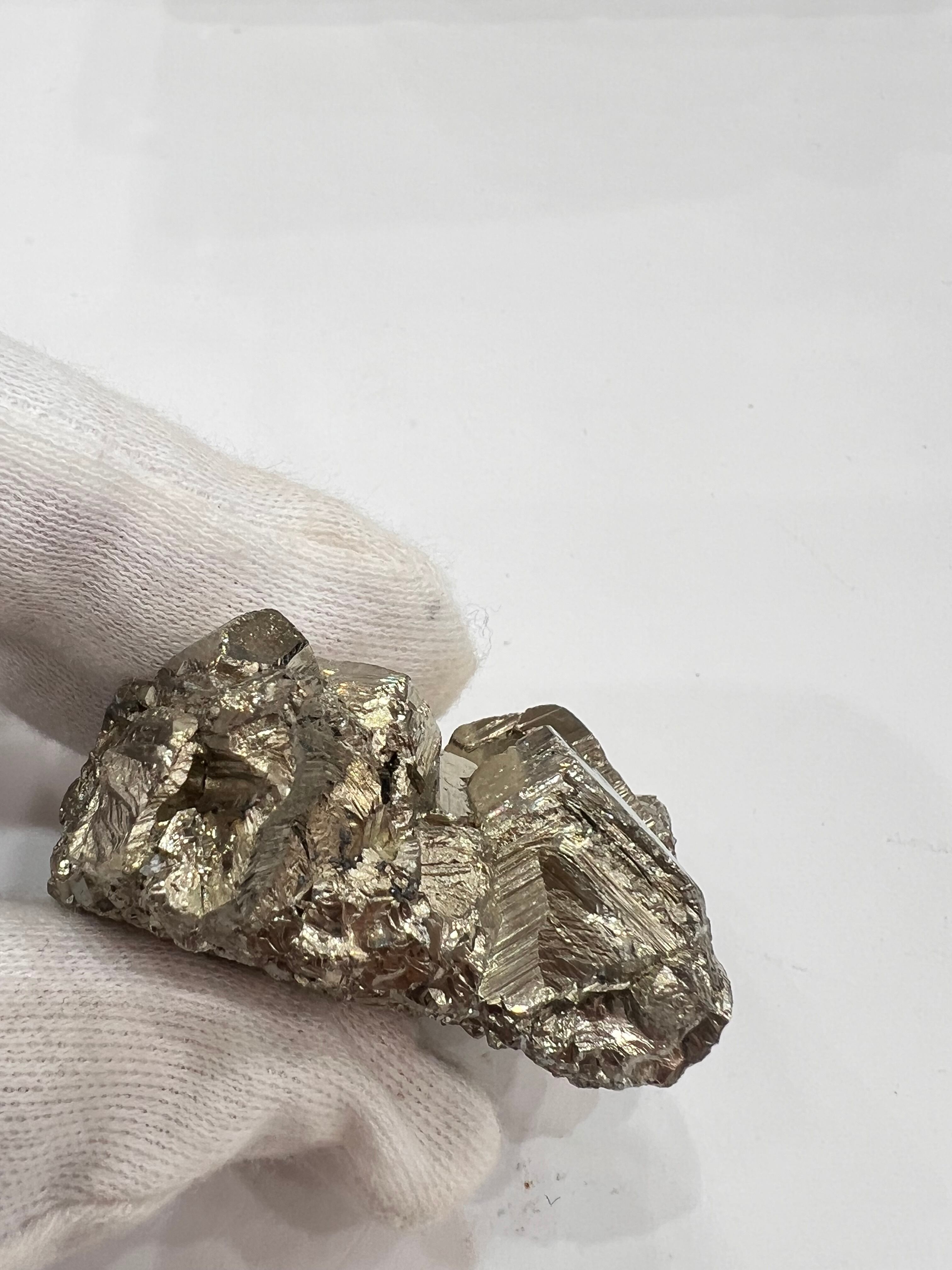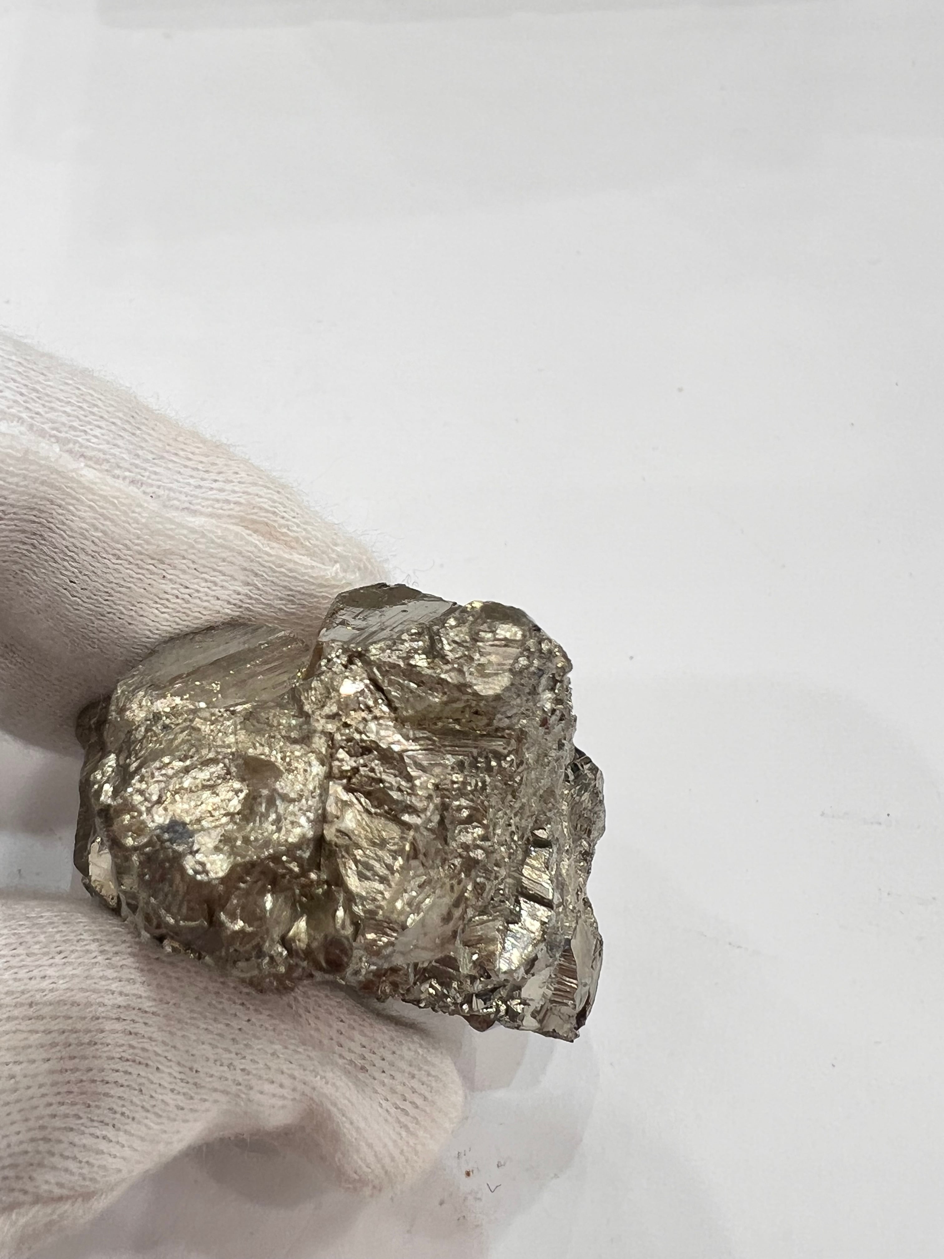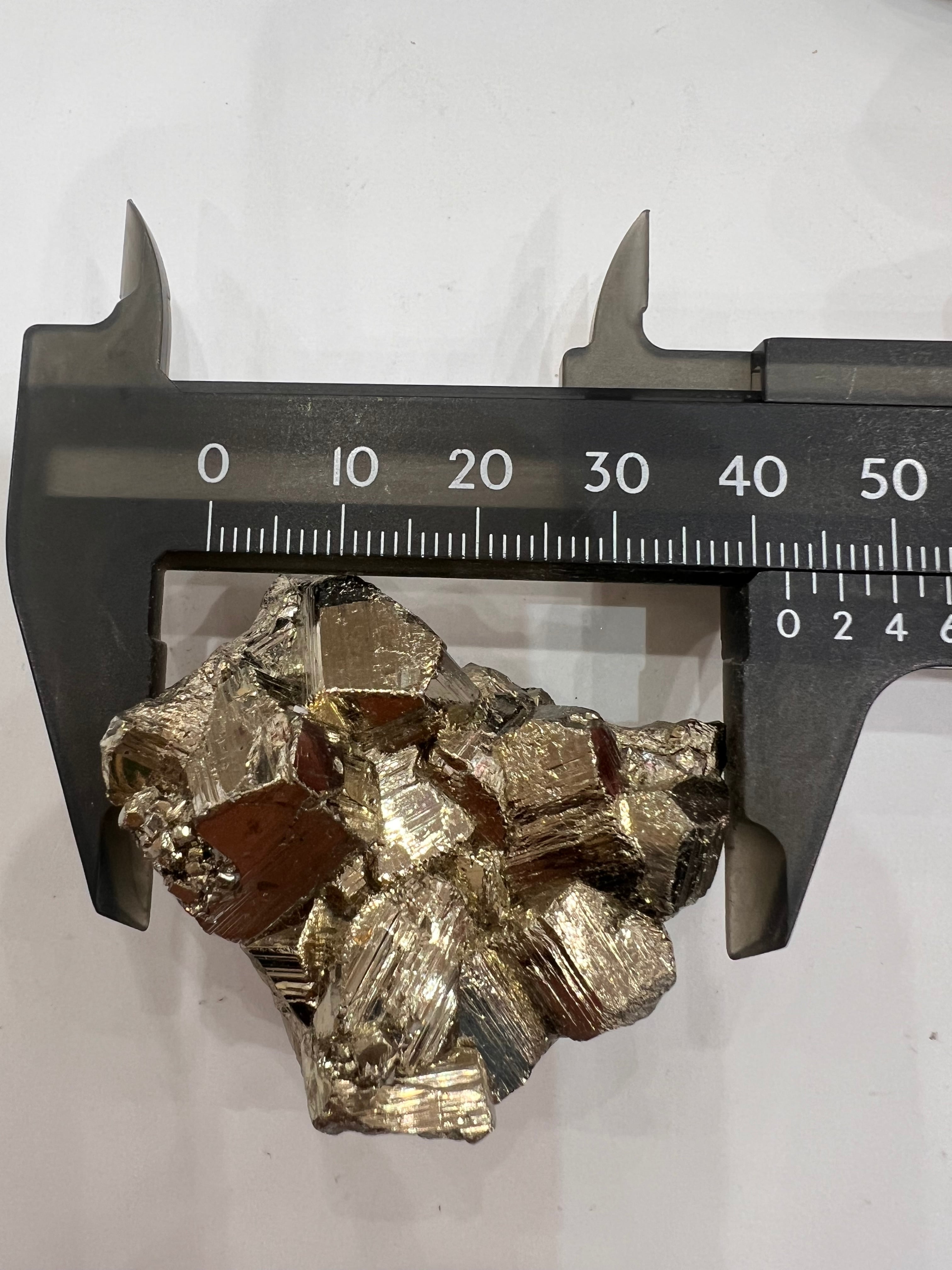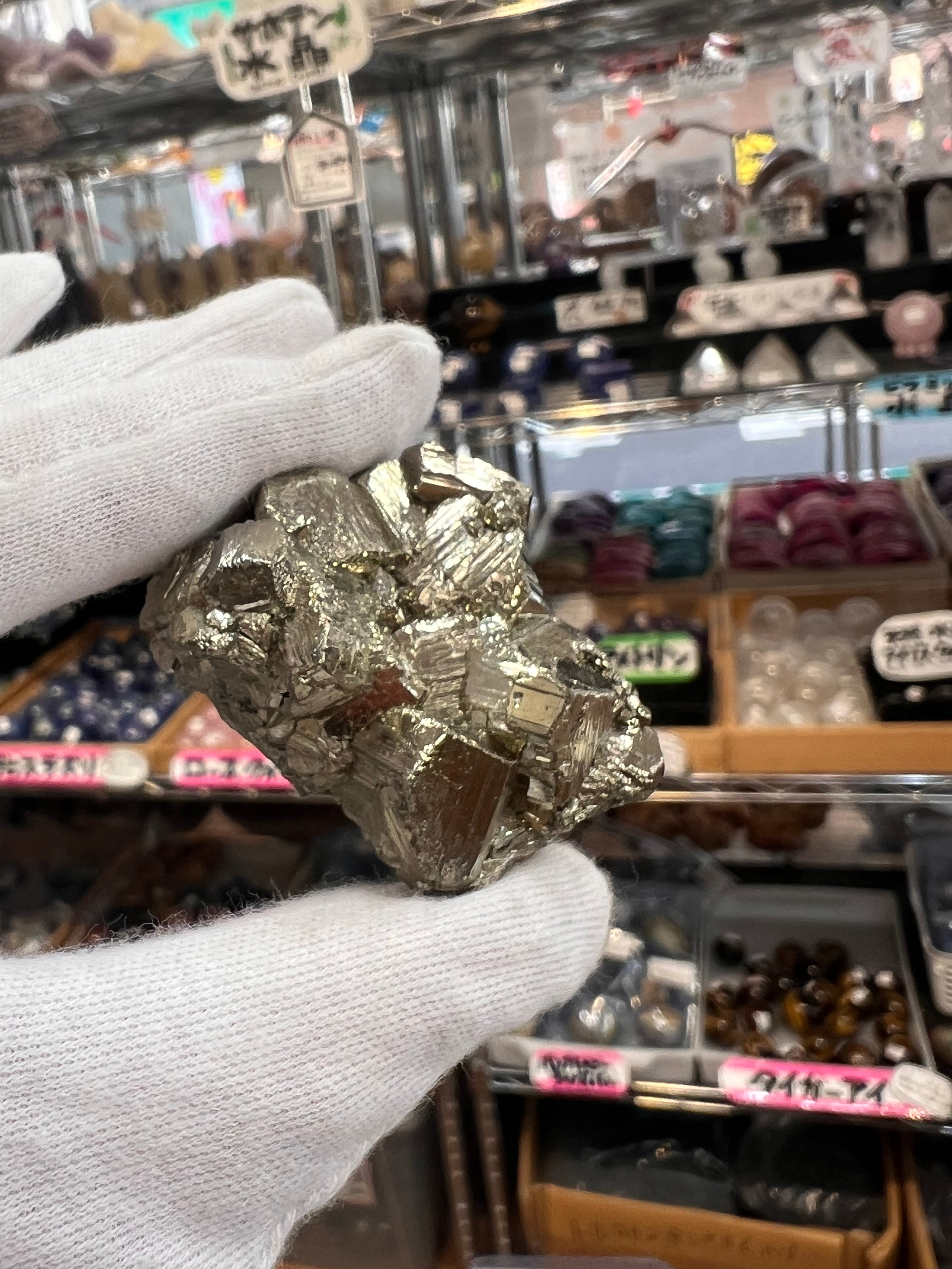 硫黄と鉄の化合物。黄金色の美しい光沢および、立方体、五画十二面体、八面体、二十四面体、又はそれらが合わさった形など様々な結晶をするので標本として人気があります。