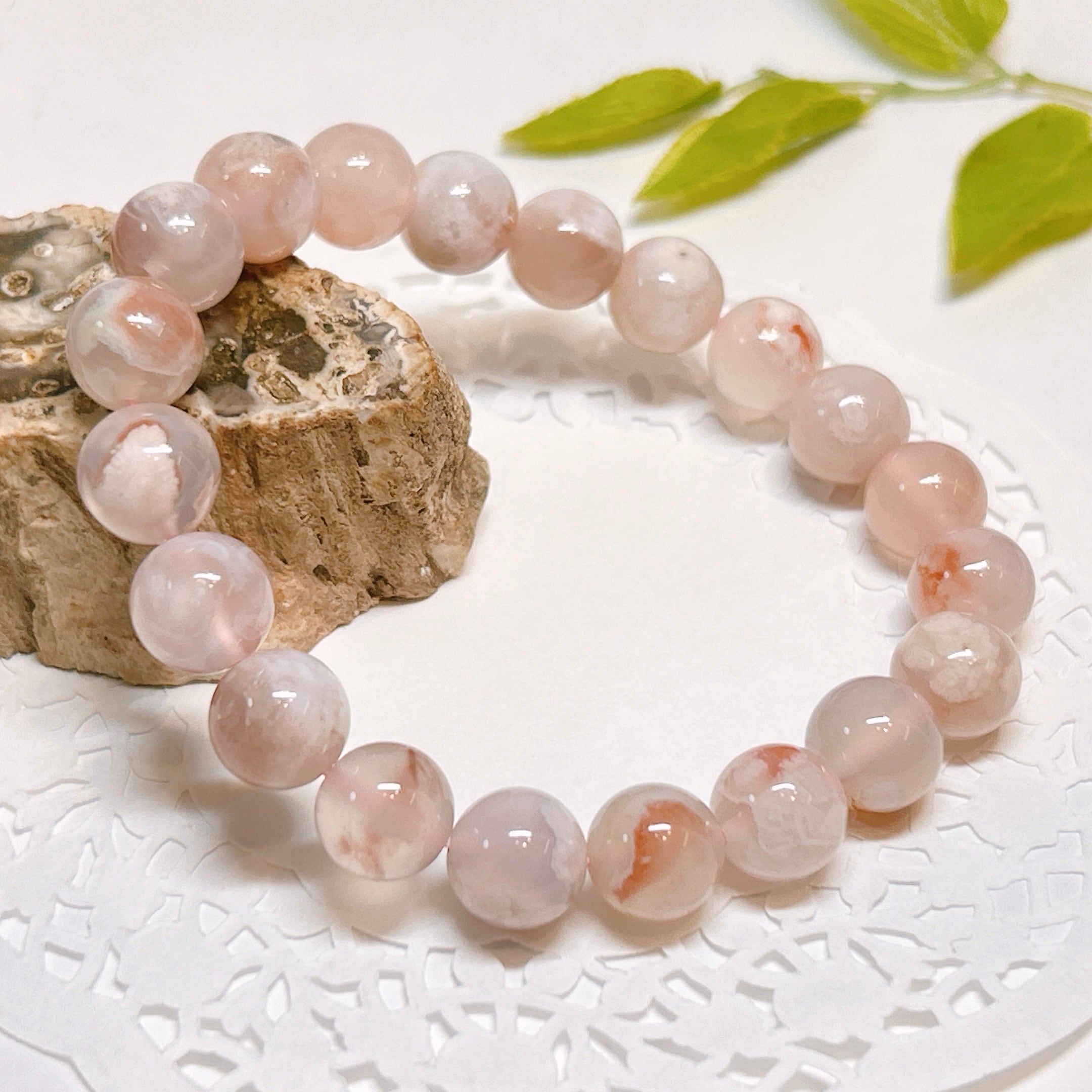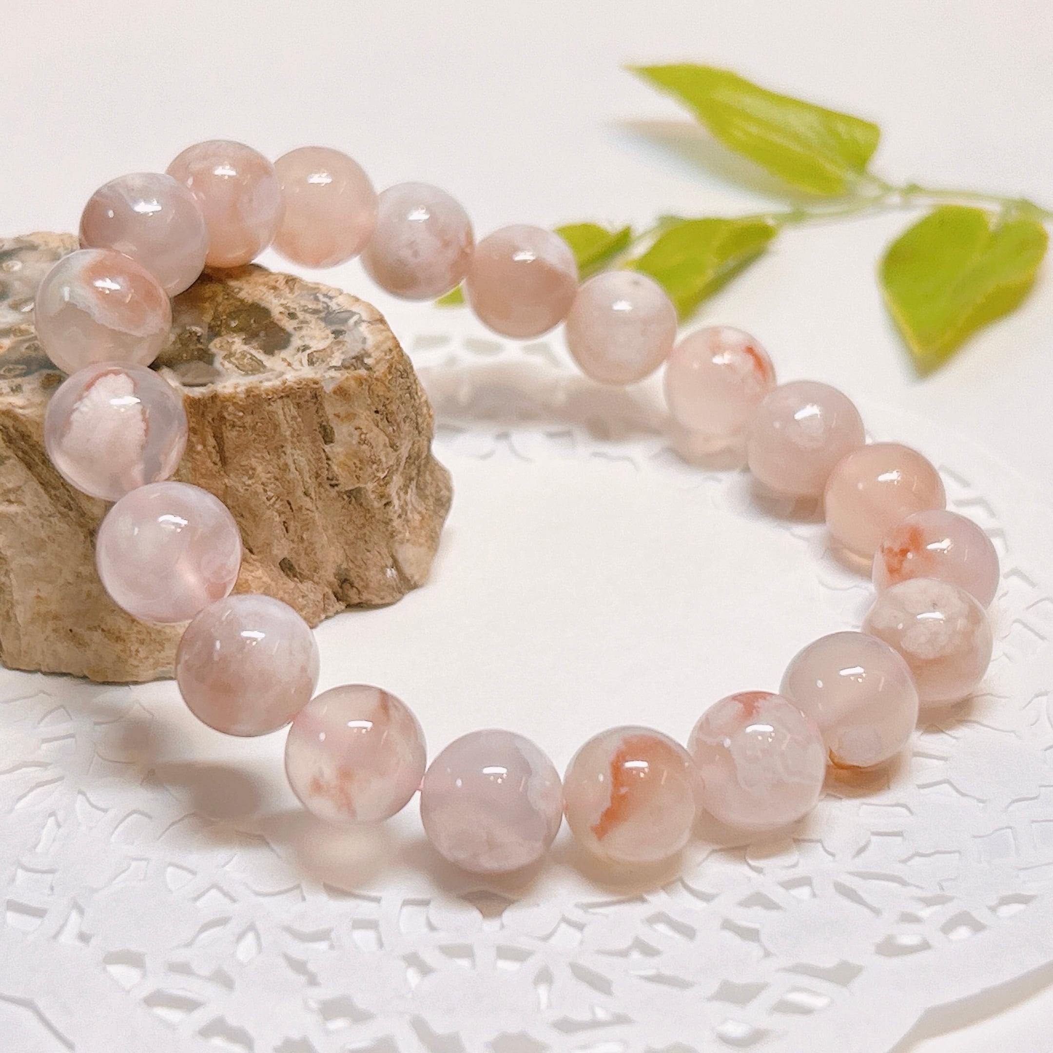 内包される白い模様が桜の様な形をしているので桜アゲートと呼ばれ、人気のブレスレット