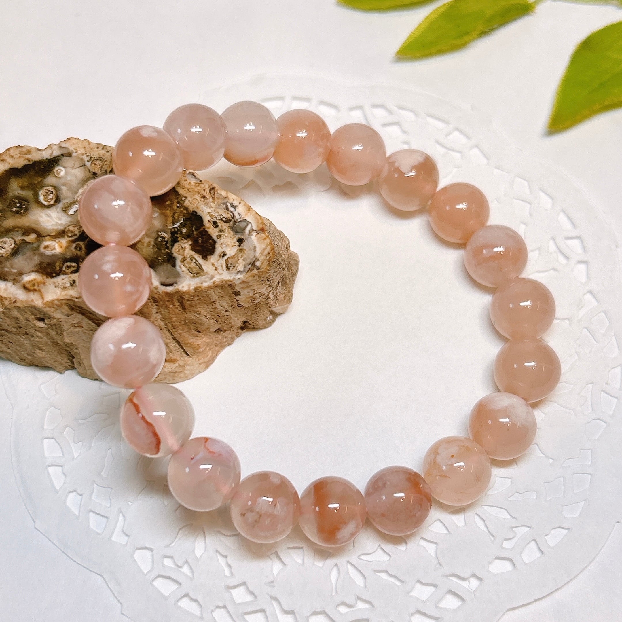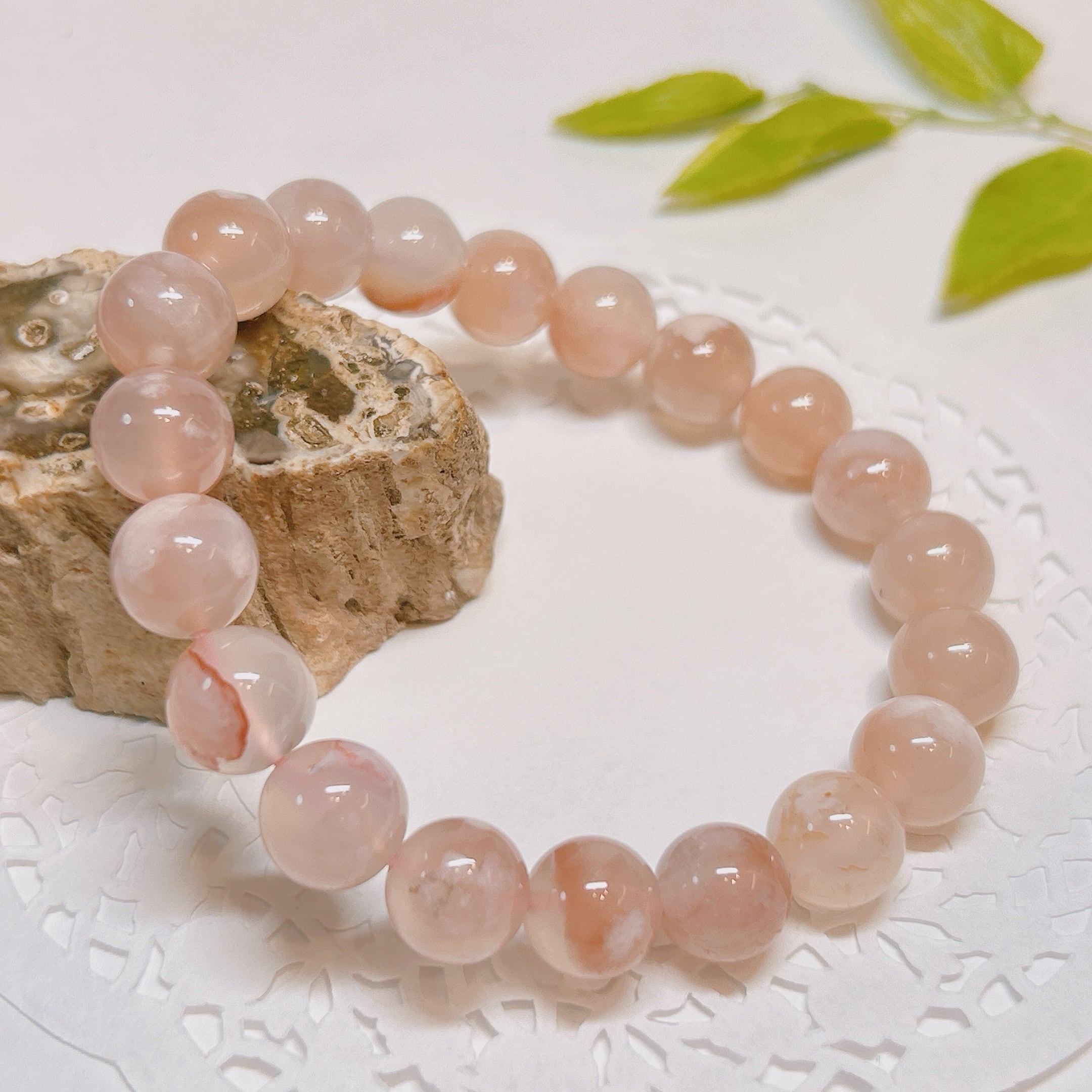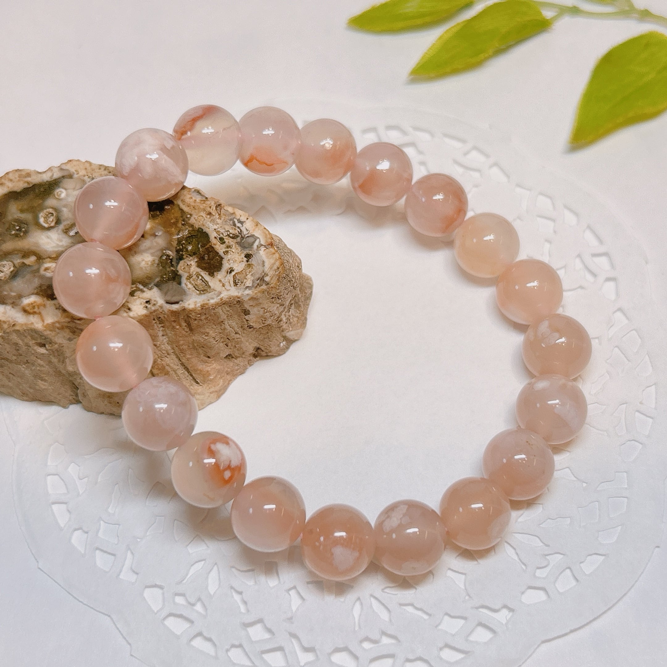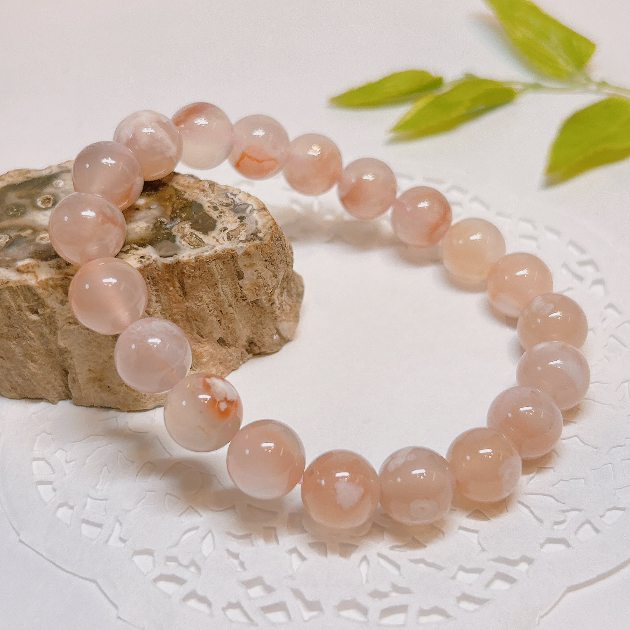 内包される白い模様が桜の様な形をしているので桜アゲートと呼ばれ、人気のブレスレット