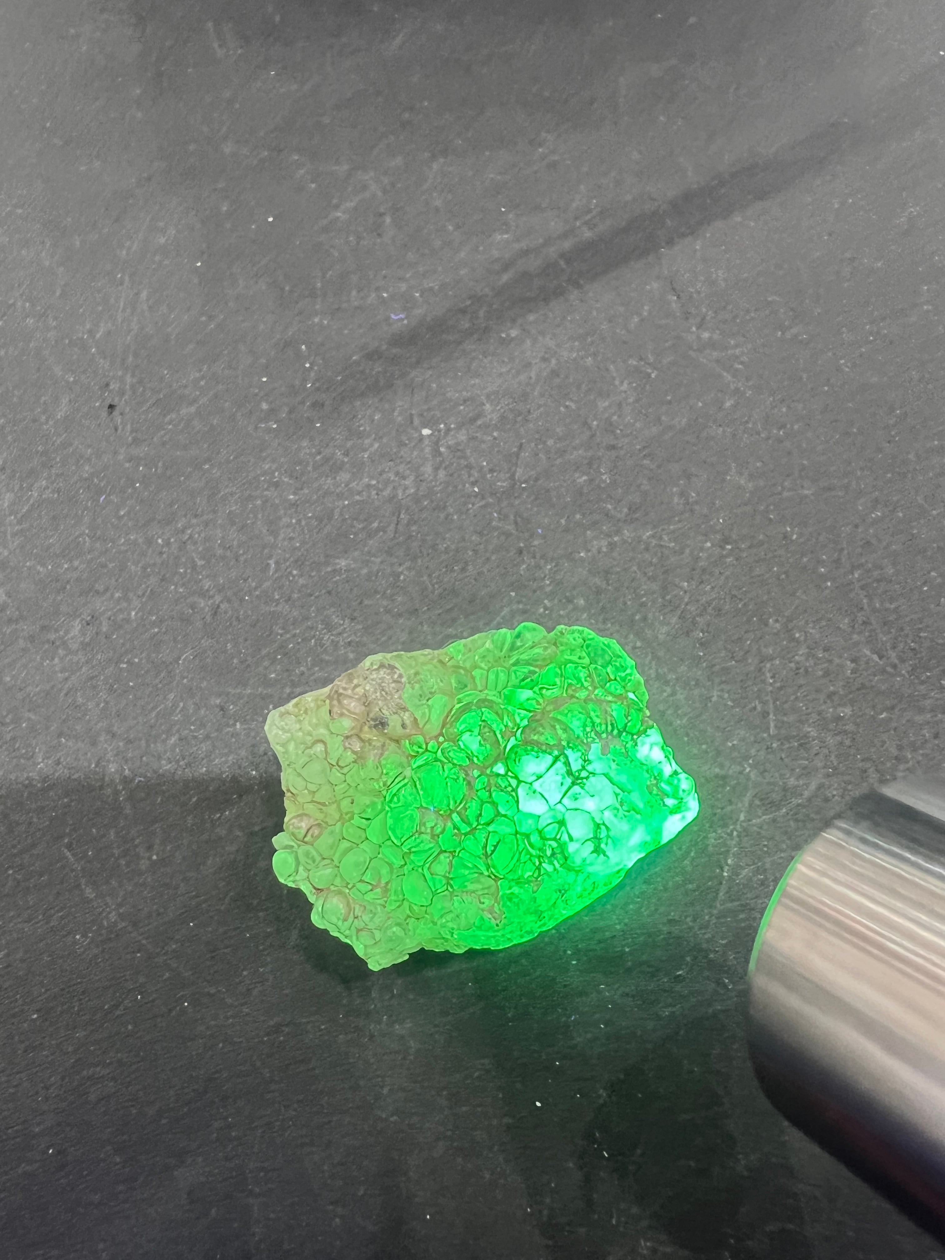 かたまってできたもので、紫外線(ブラックライト)で黄緑色の蛍光を発する。