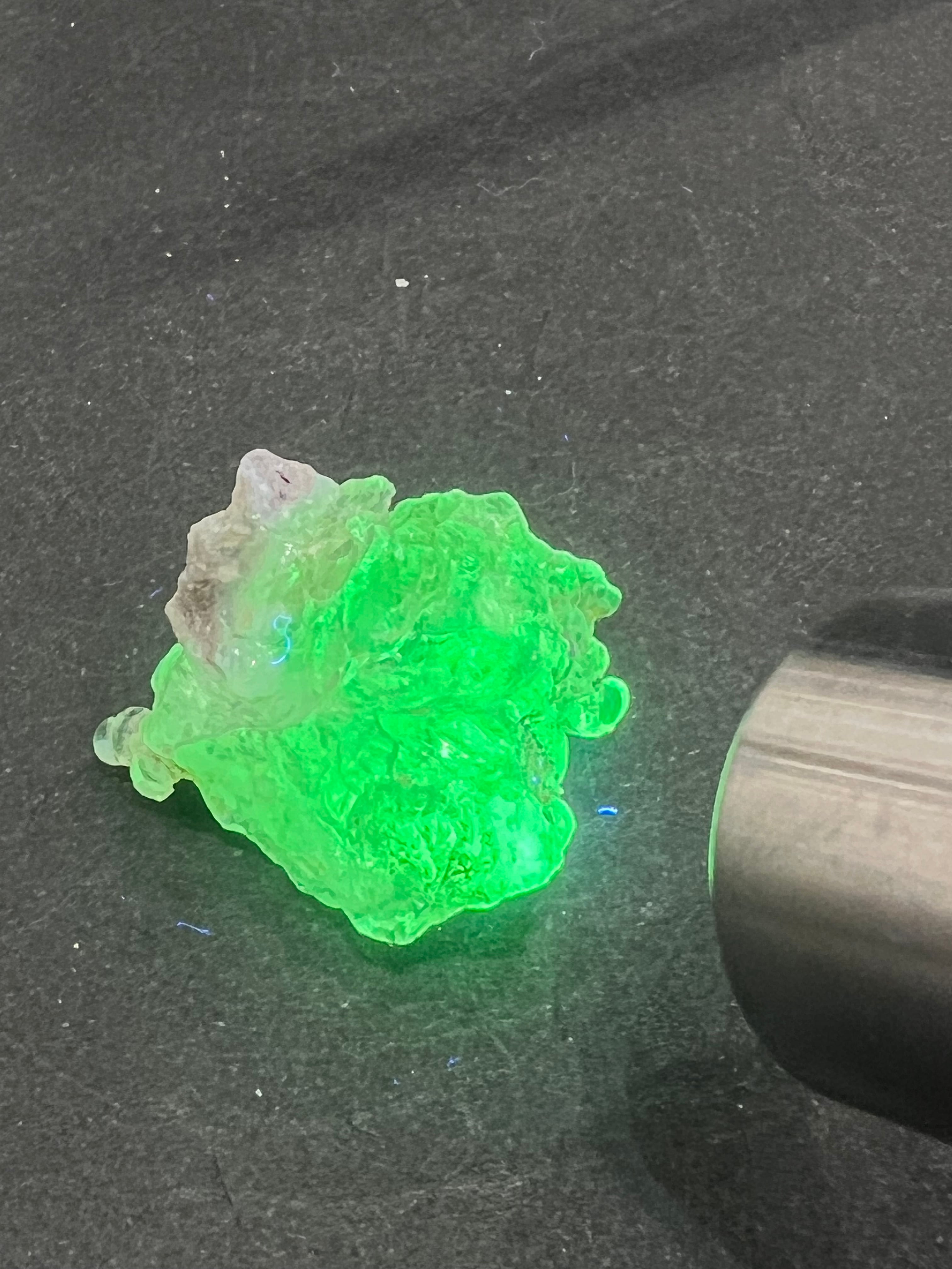 かたまってできたもので、紫外線(ブラックライト)で黄緑色の蛍光を発する。