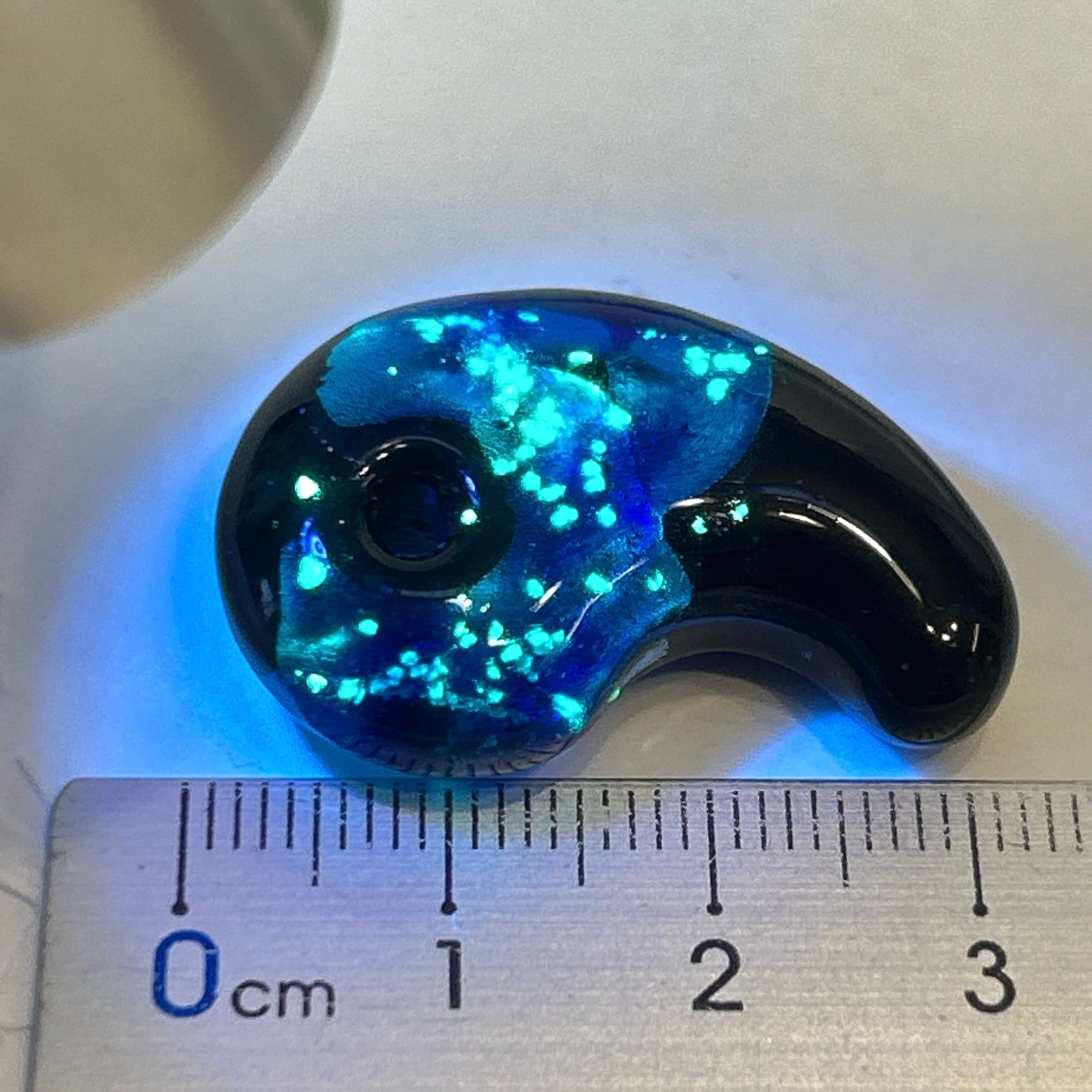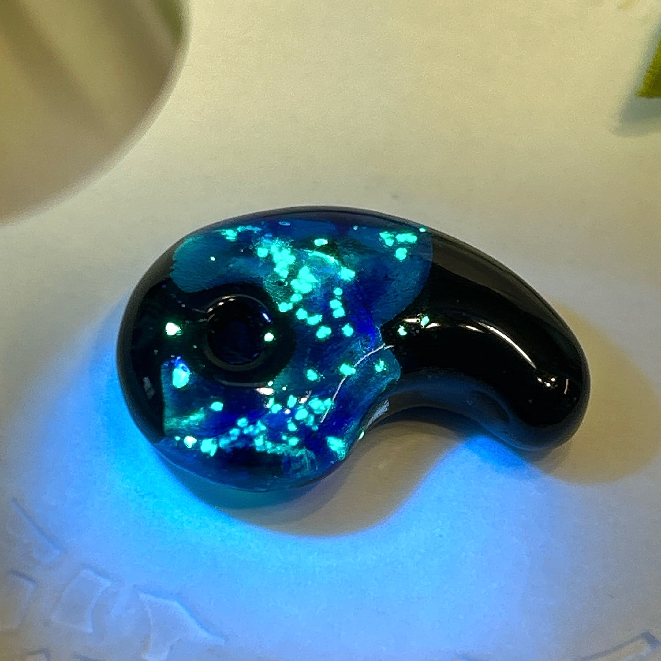 ブラックライトを当てると、緑の光が浮かび上がる不思議なホタルガラス。