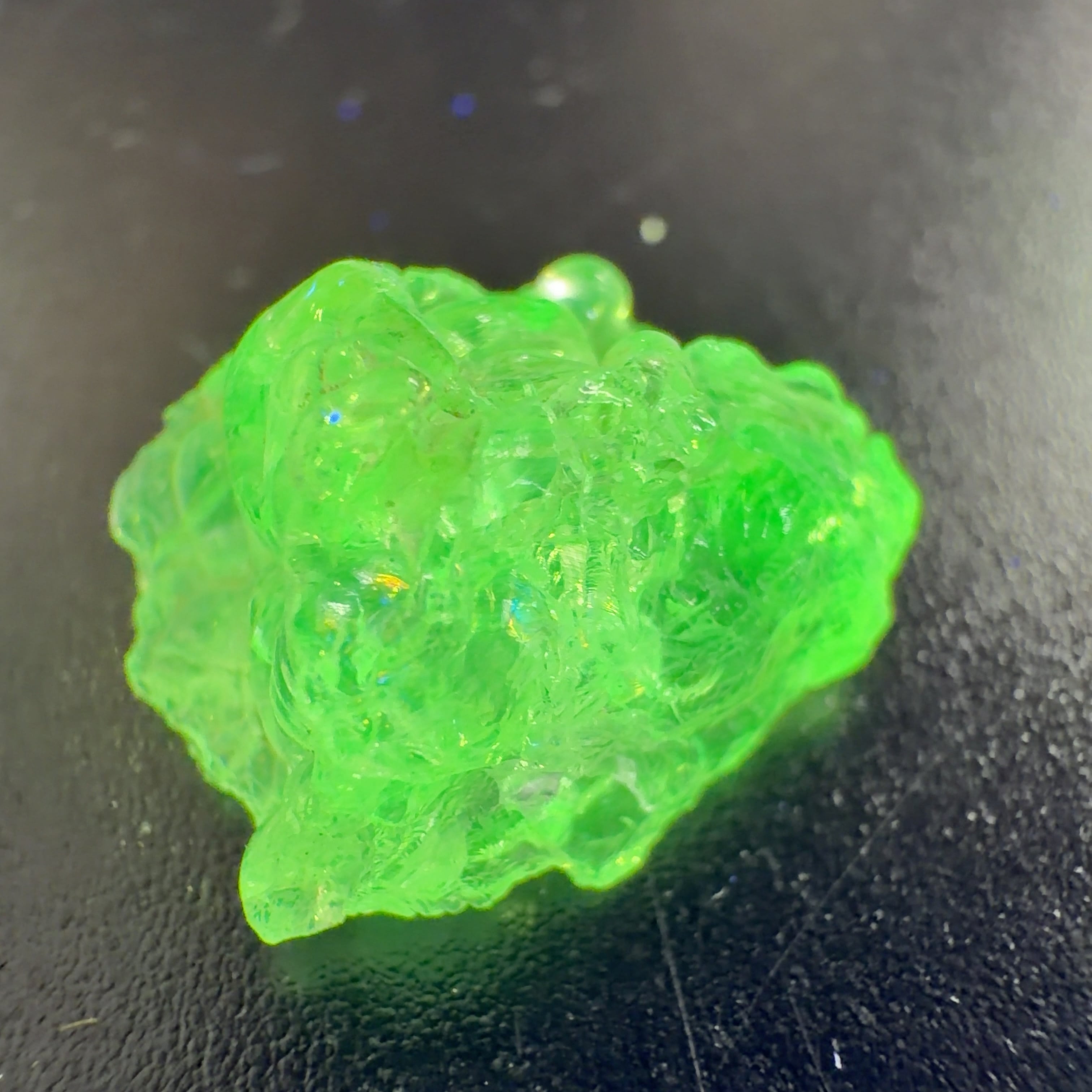 かたまってできたもので、紫外線(ブラックライト)で黄緑色の蛍光を発する。