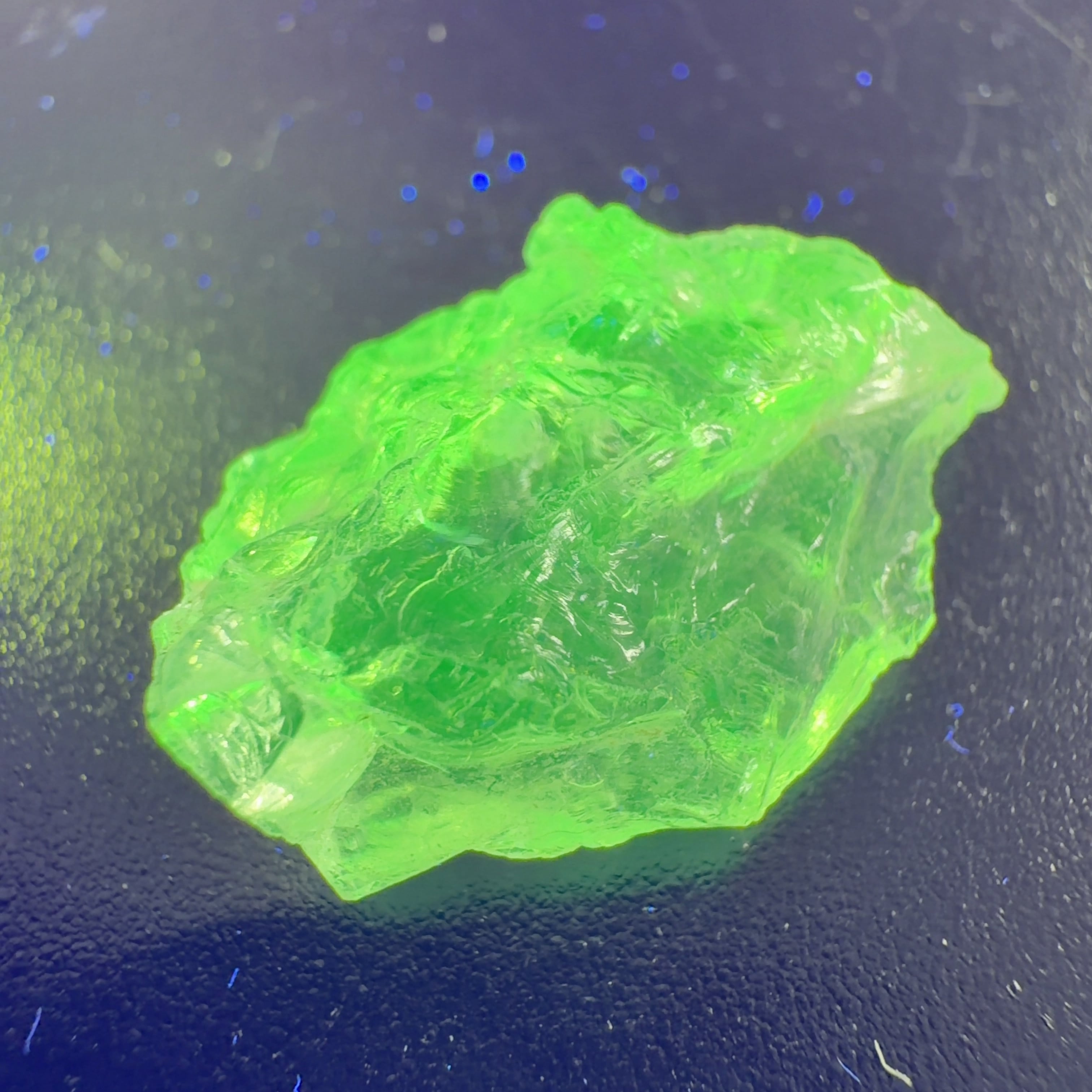 かたまってできたもので、紫外線(ブラックライト)で黄緑色の蛍光を発する。