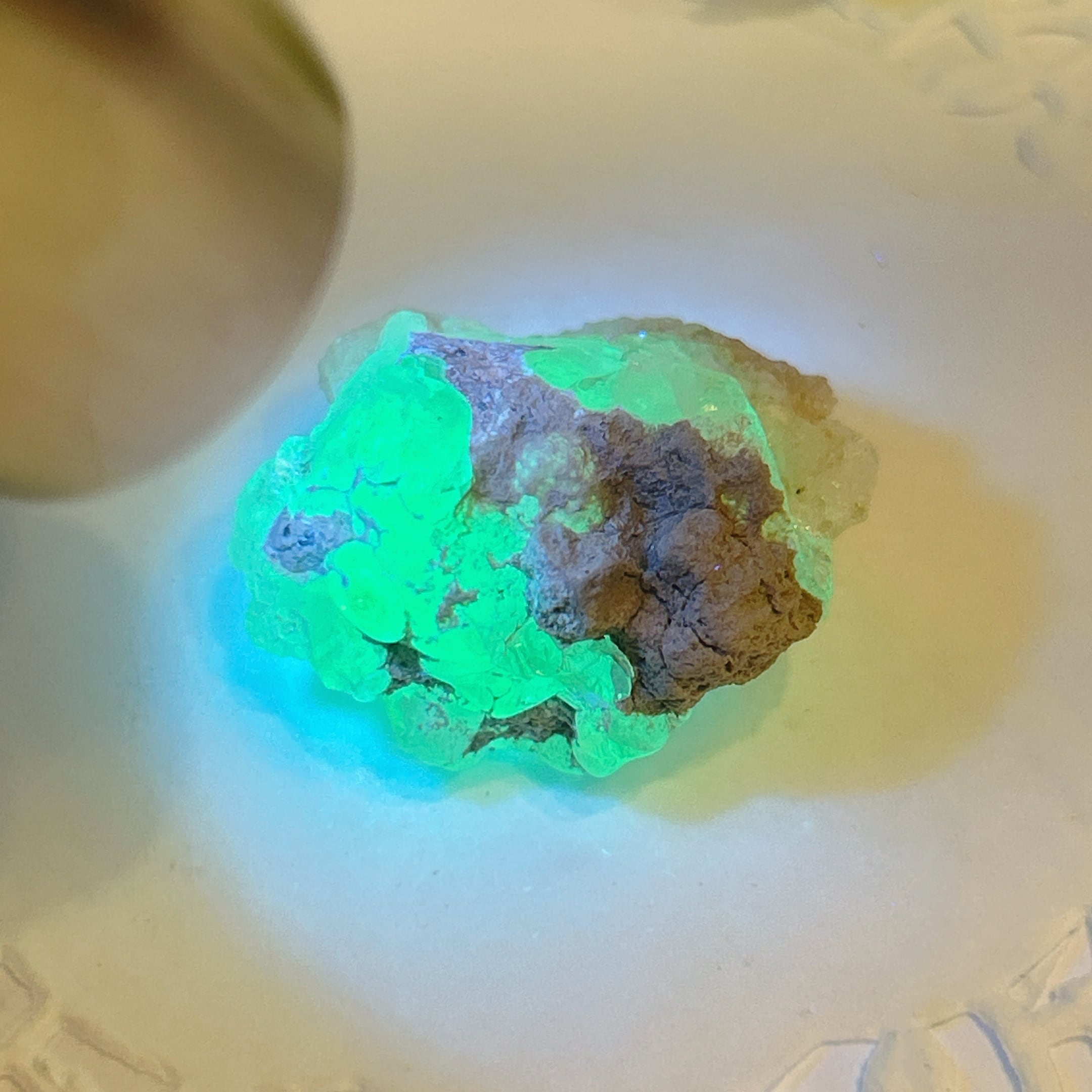 かたまってできたもので、紫外線(ブラックライト)で黄緑色の蛍光を発する。