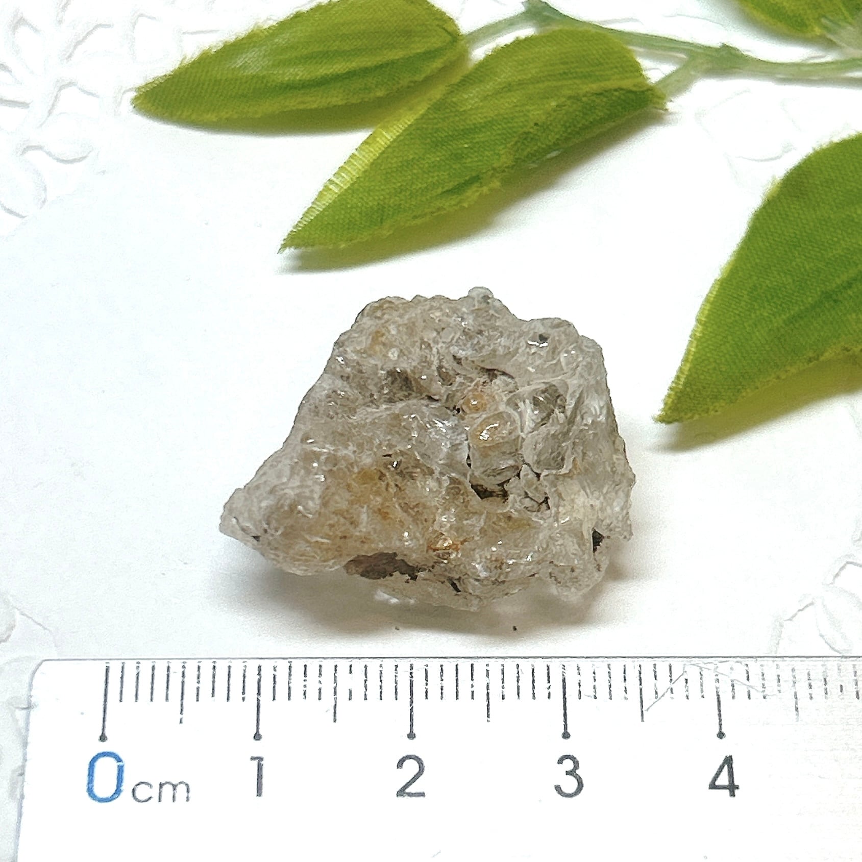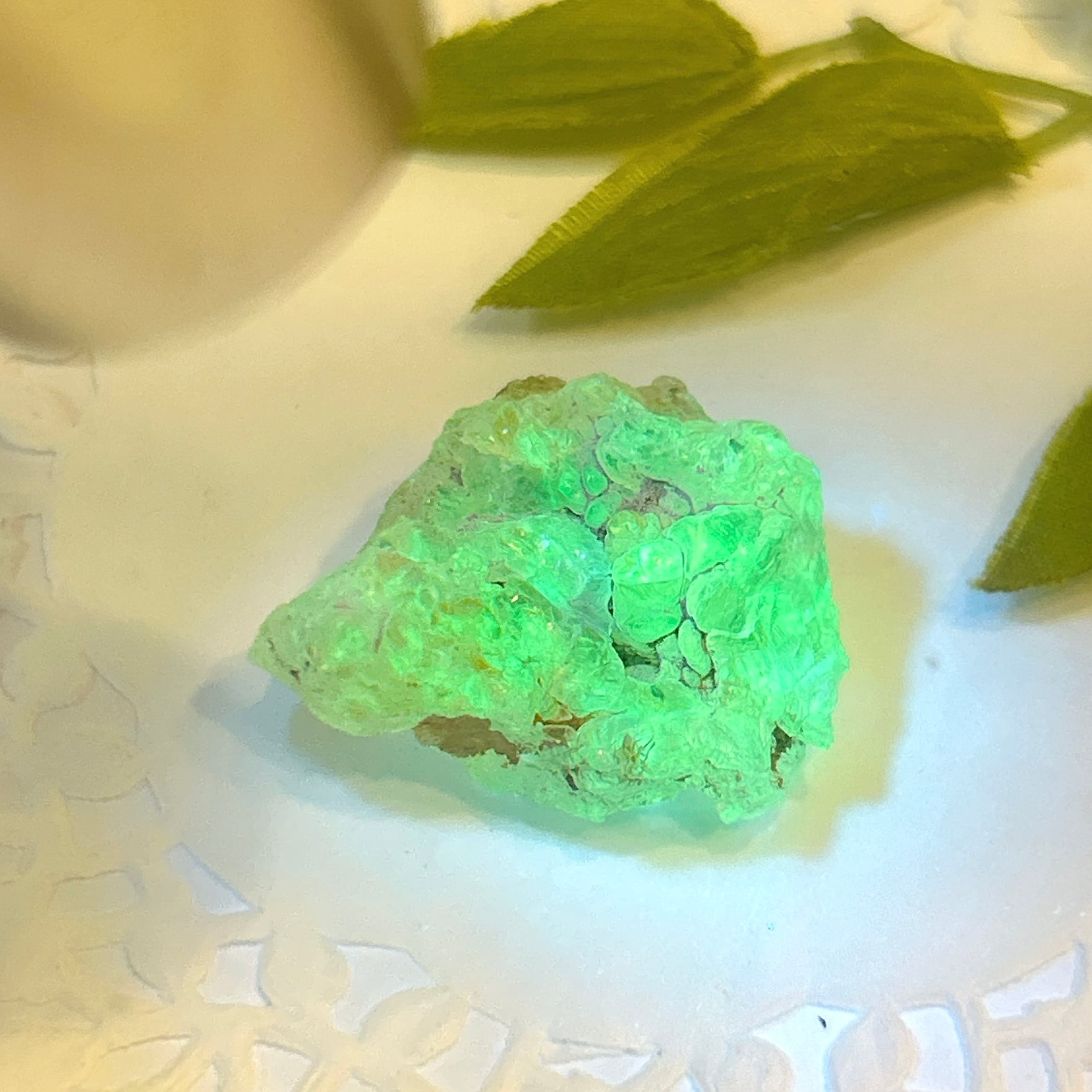 かたまってできたもので、紫外線(ブラックライト)で黄緑色の蛍光を発する。