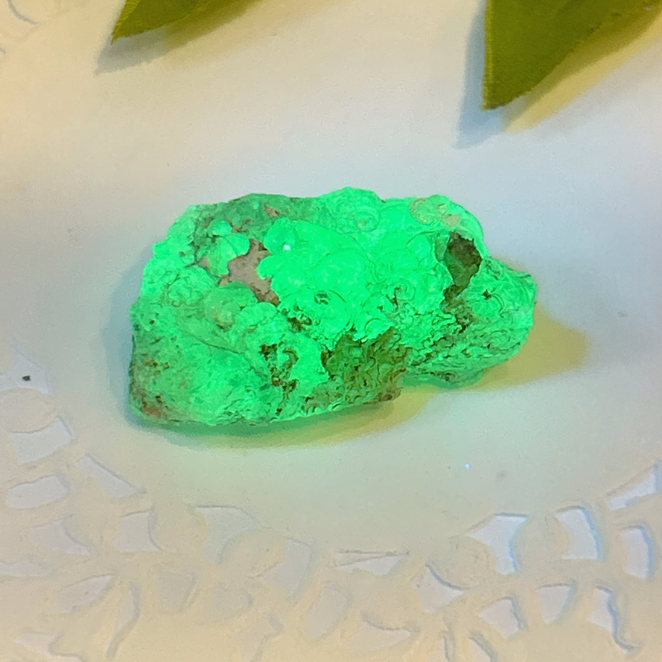 かたまってできたもので、紫外線(ブラックライト)で黄緑色の蛍光を発する。