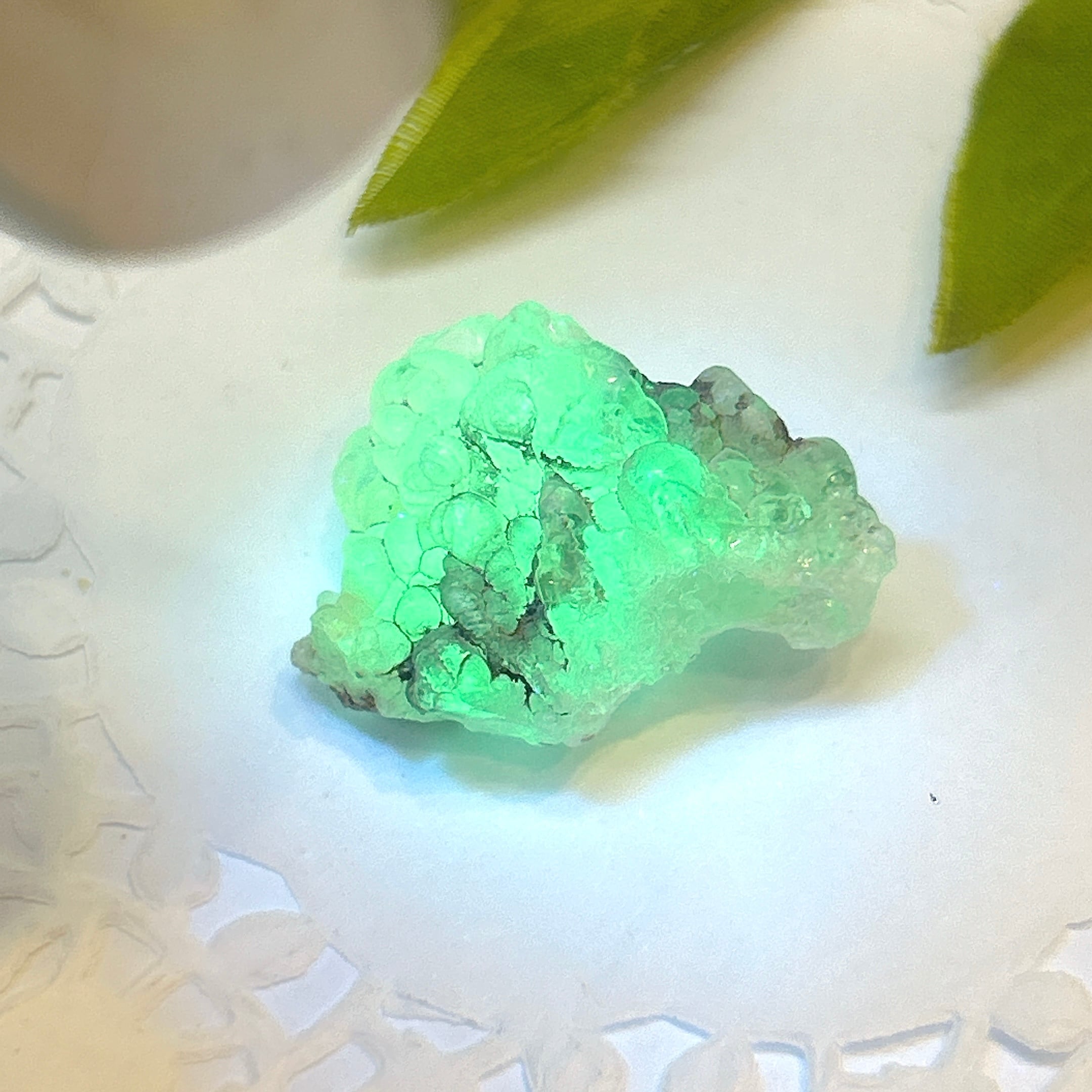 かたまってできたもので、紫外線(ブラックライト)で黄緑色の蛍光を発する。