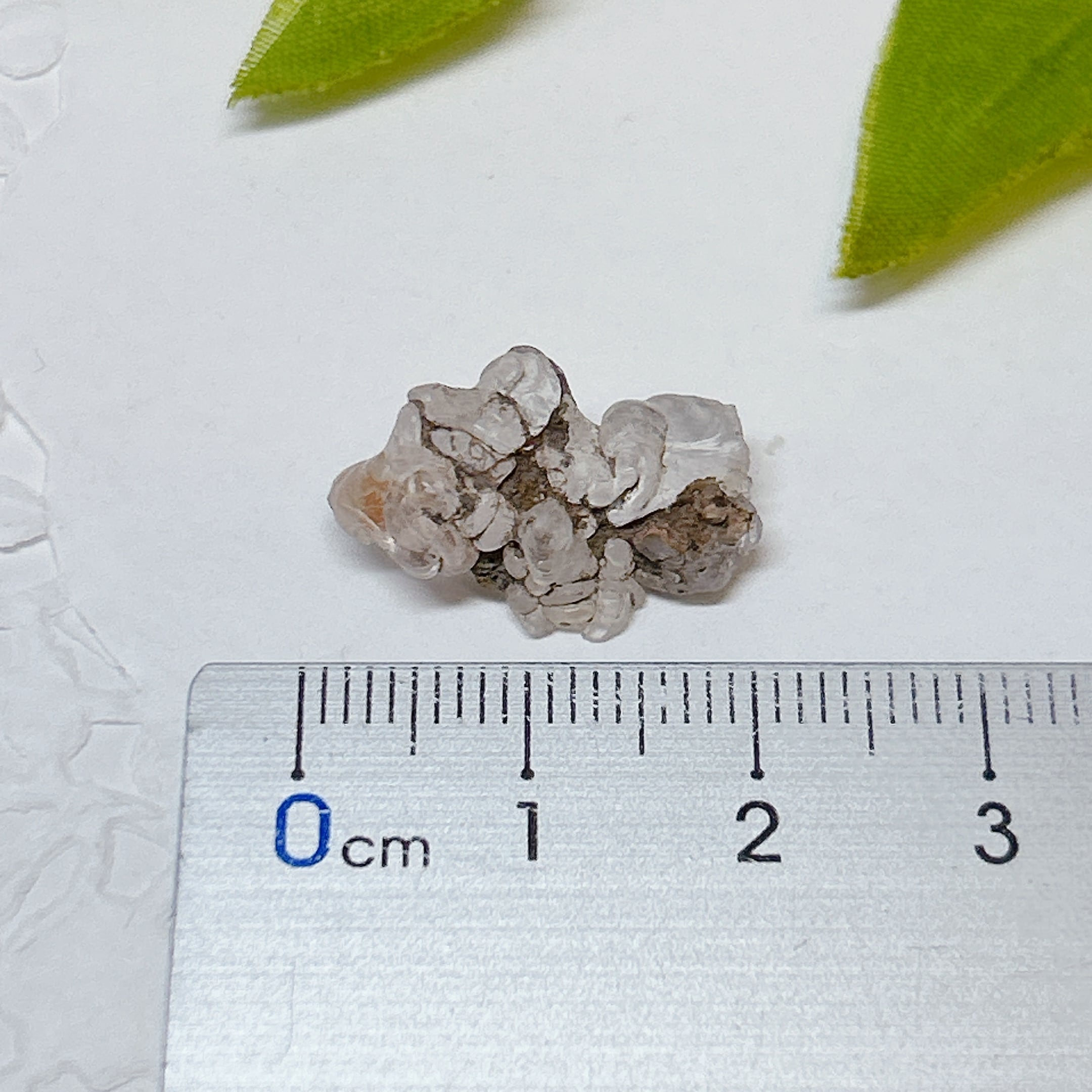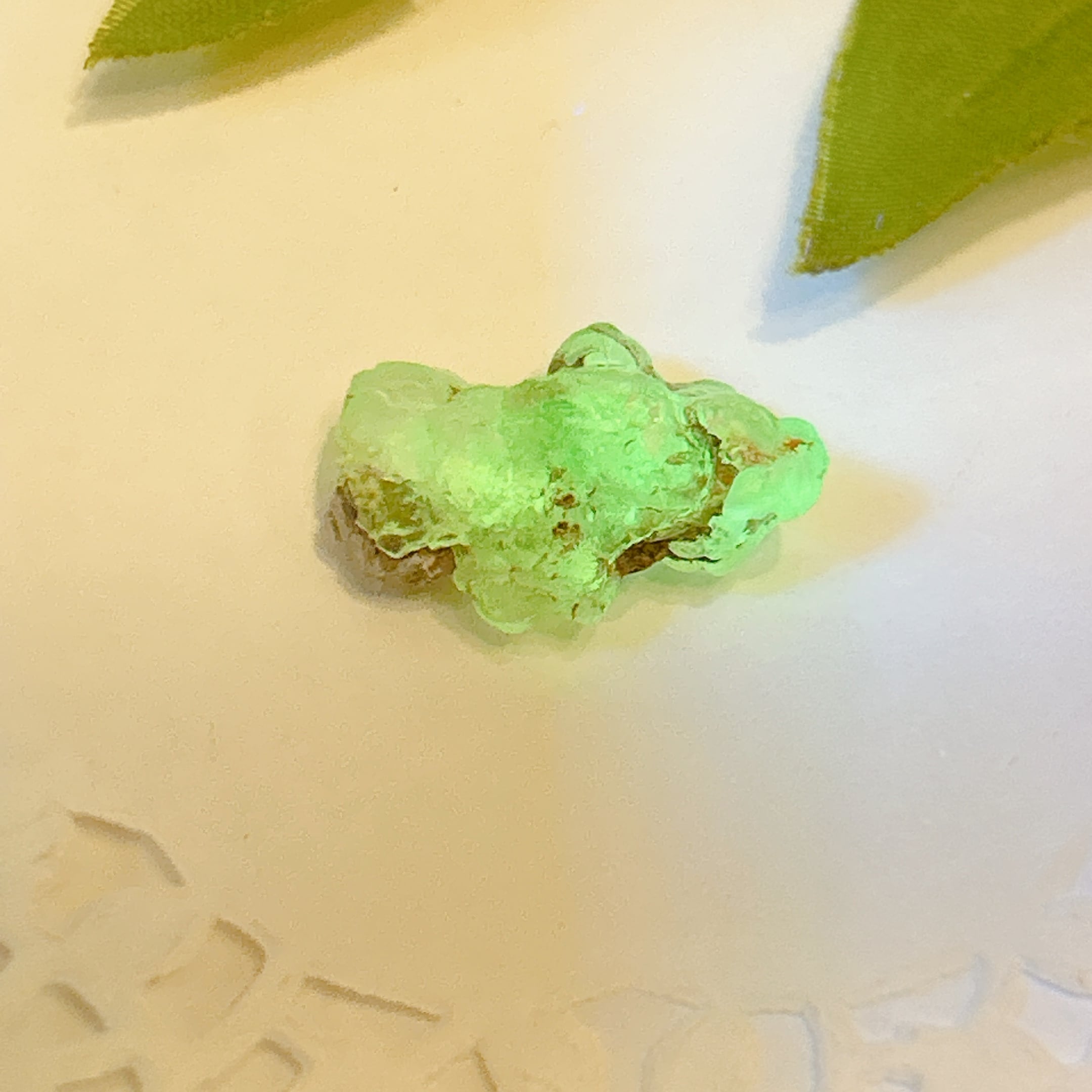 かたまってできたもので、紫外線(ブラックライト)で黄緑色の蛍光を発する。