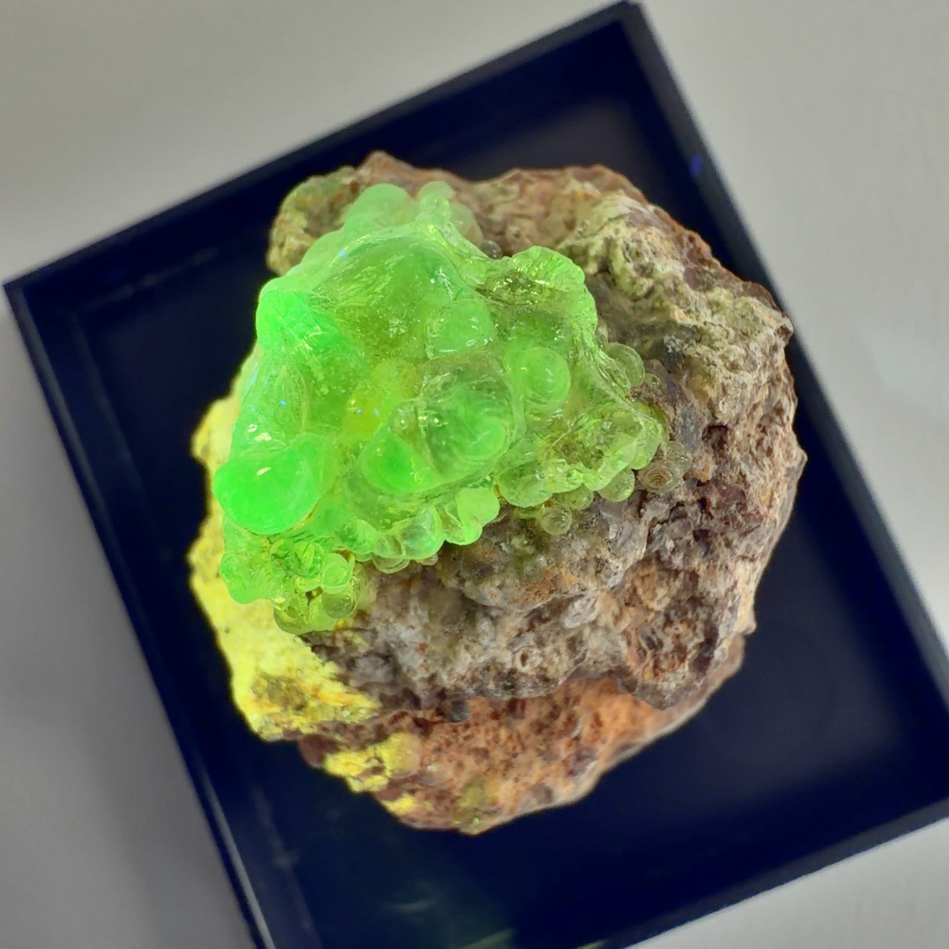 かたまってできたもので、紫外線(ブラックライト)で黄緑色の蛍光を発する。