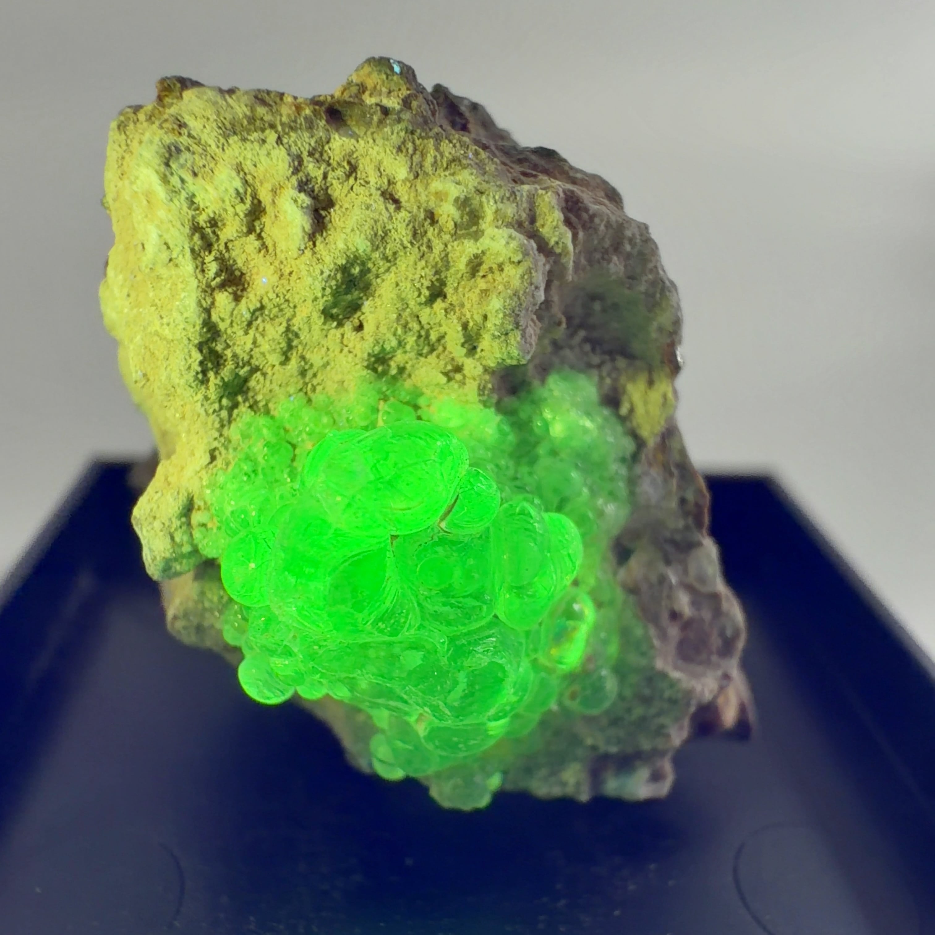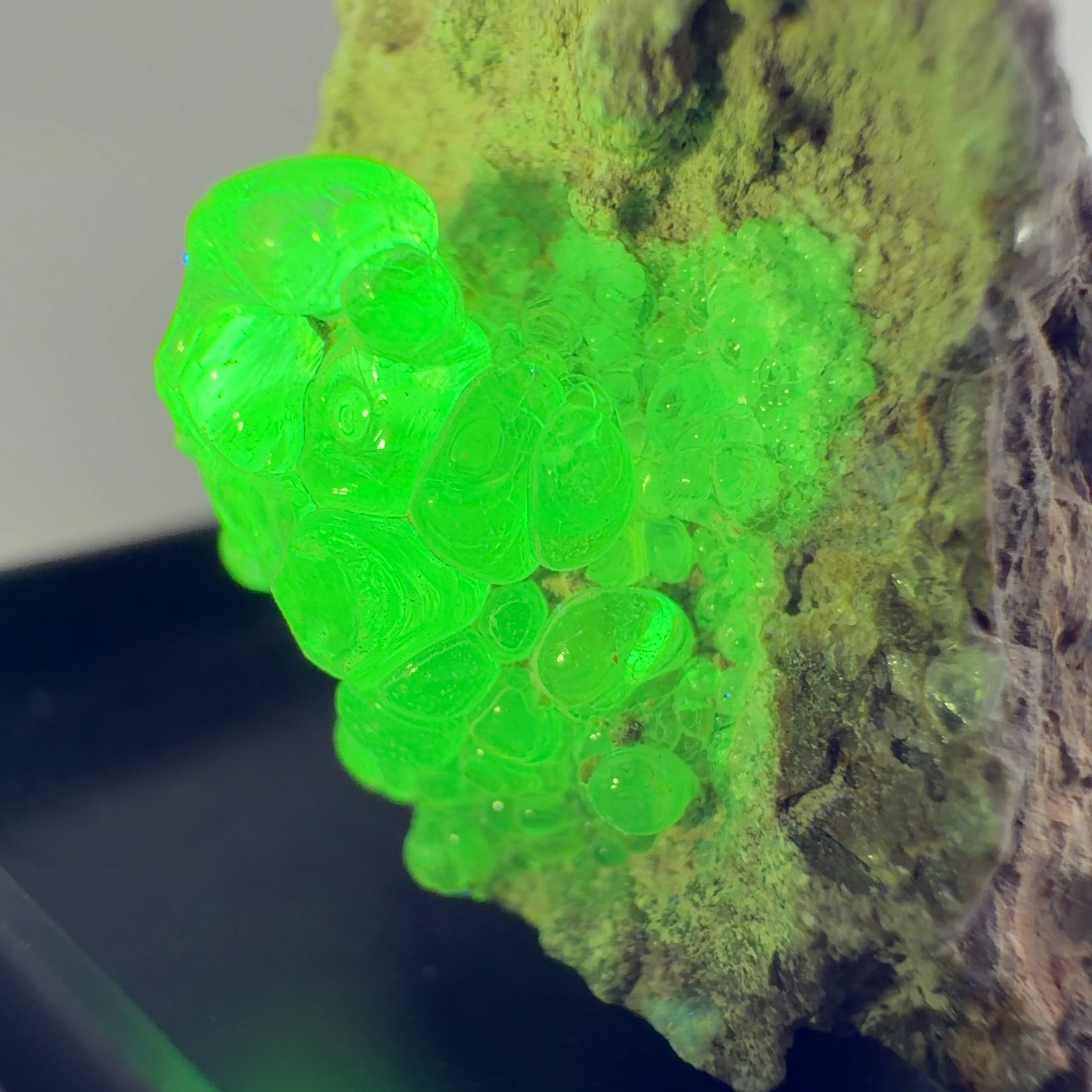 かたまってできたもので、紫外線(ブラックライト)で黄緑色の蛍光を発する。