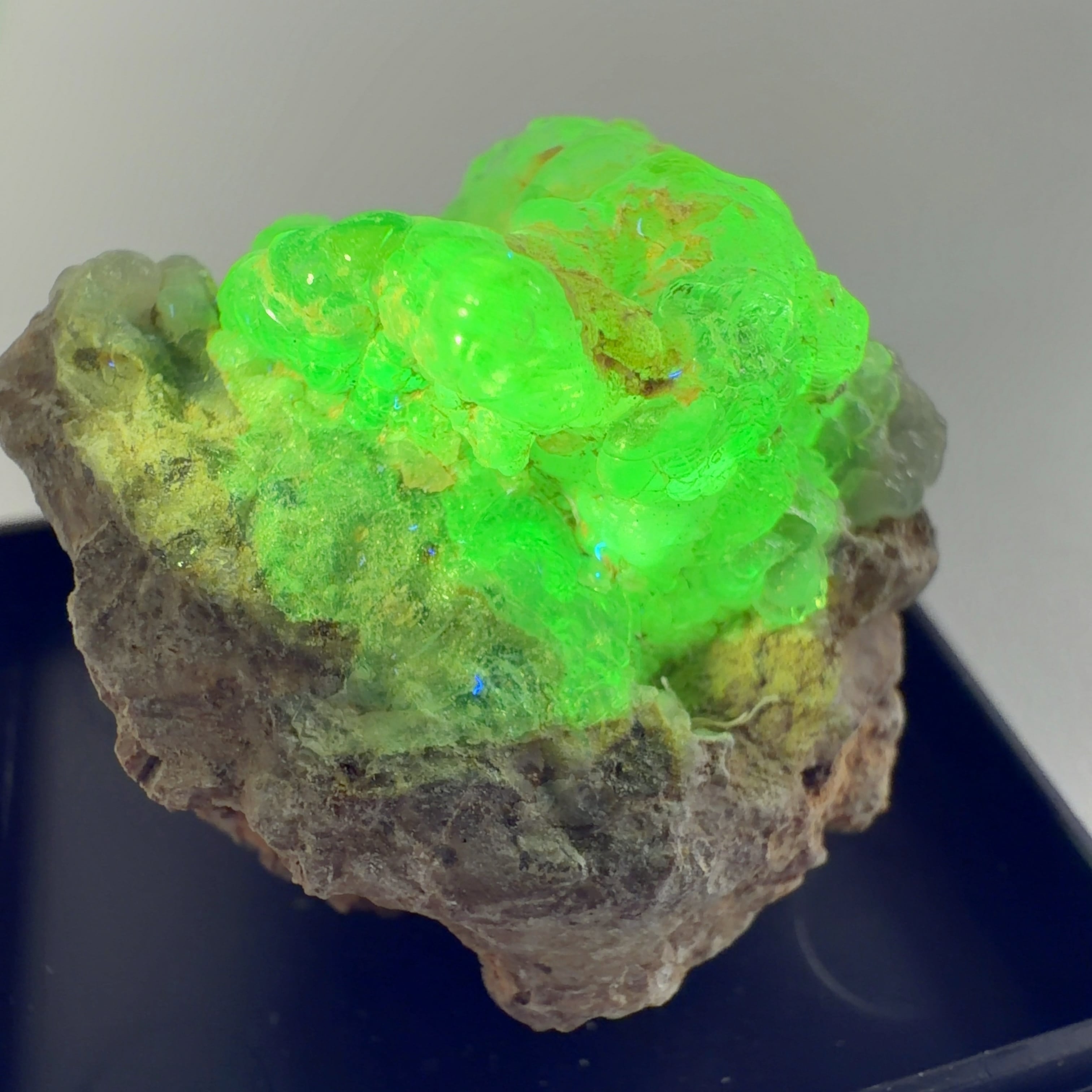 かたまってできたもので、紫外線(ブラックライト)で黄緑色の蛍光を発する。