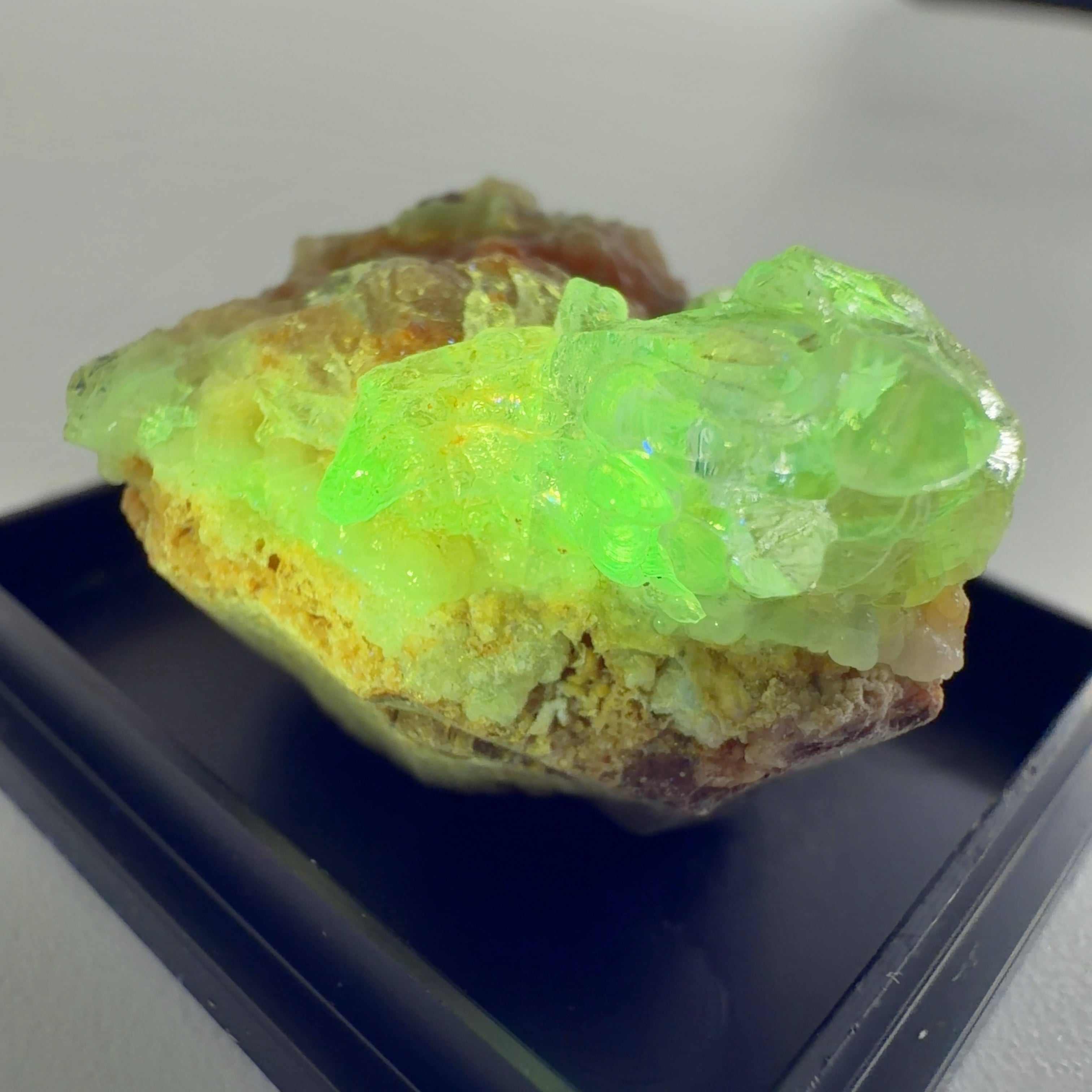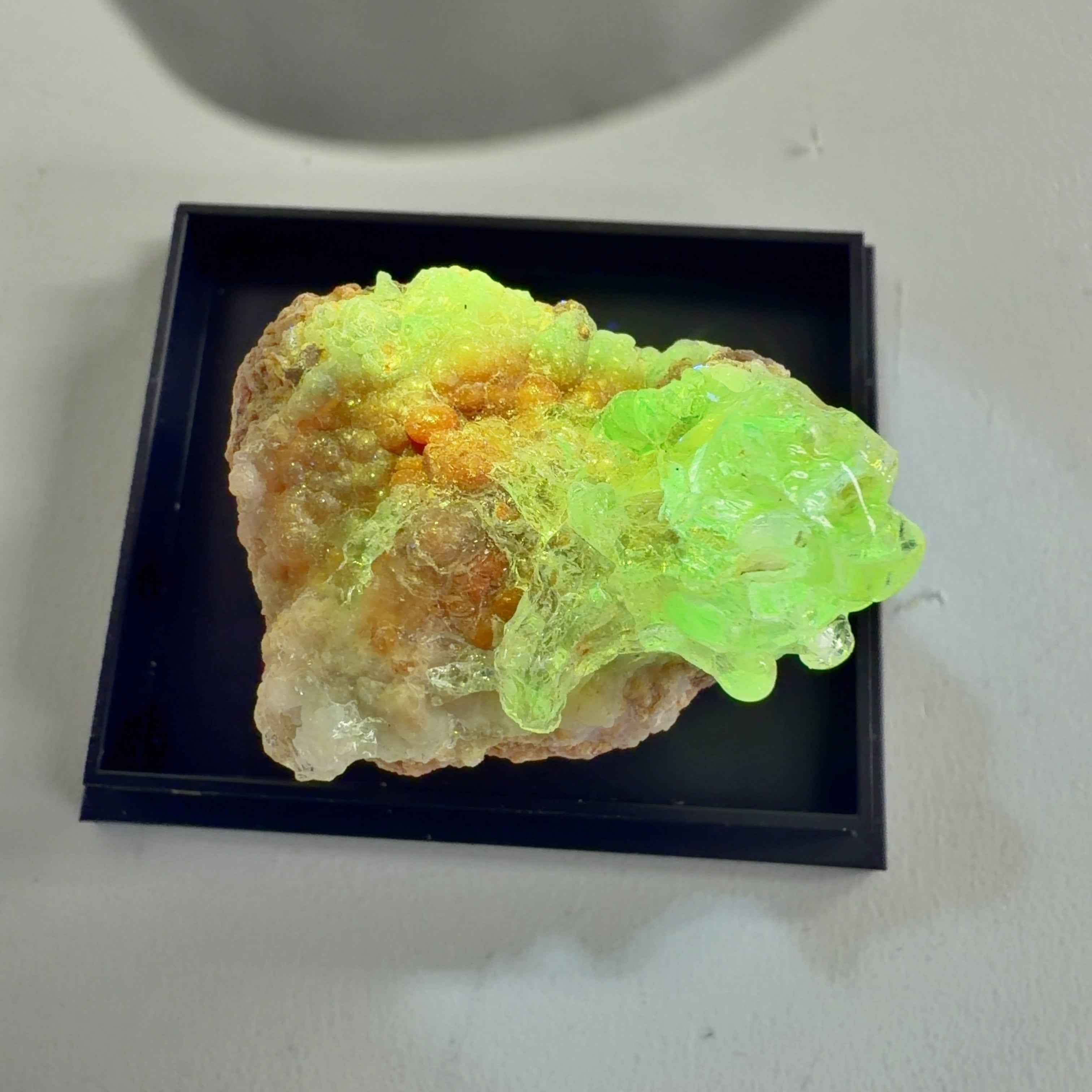 かたまってできたもので、紫外線(ブラックライト)で黄緑色の蛍光を発する。