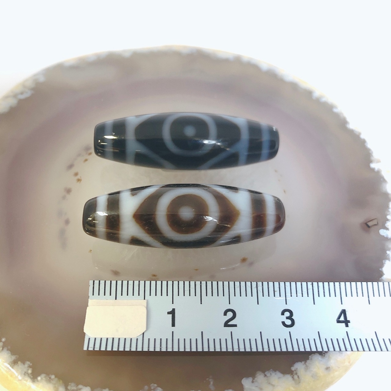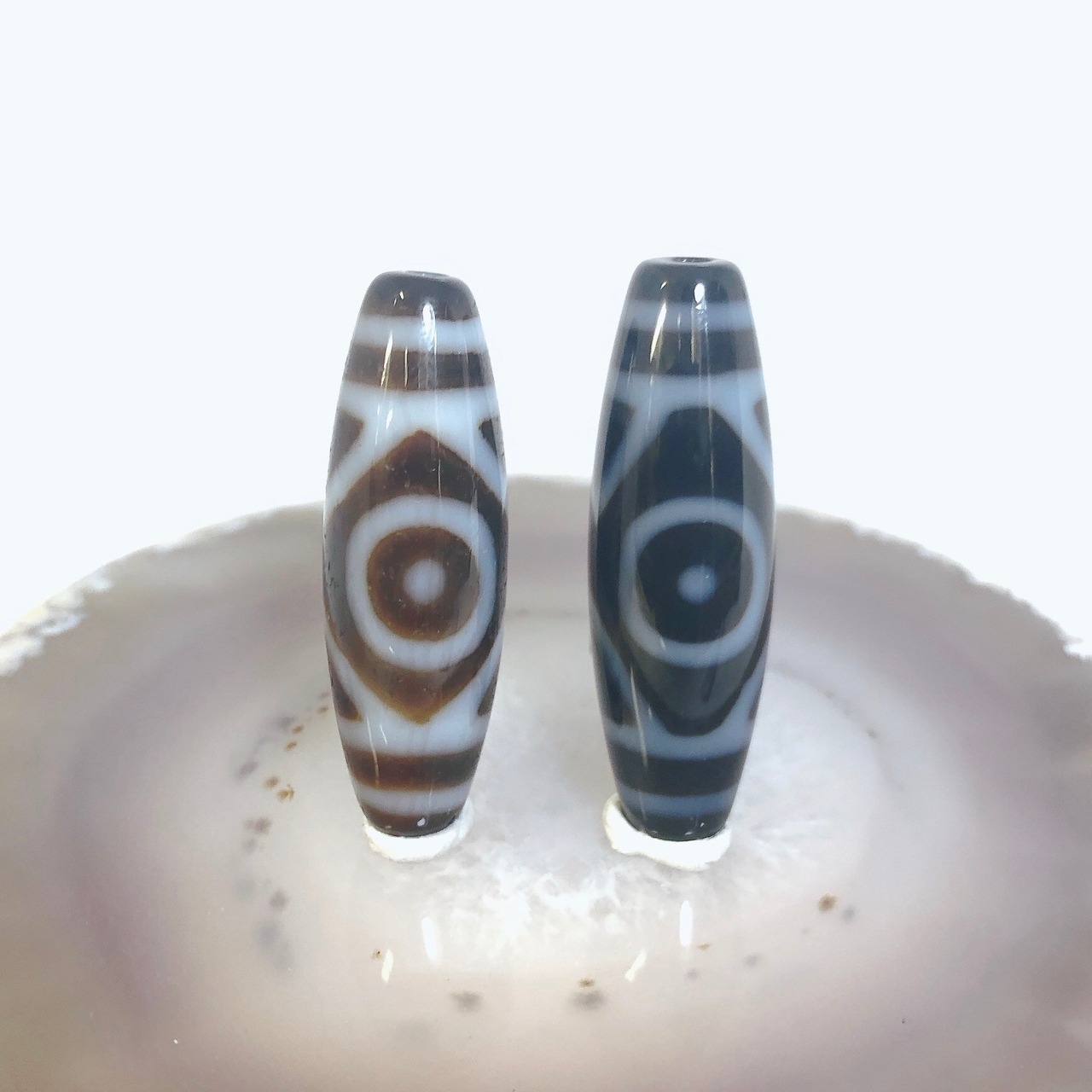 瑪瑙などを円筒に加工し、染料を浸透させて目の模様に焼き付けたもの。