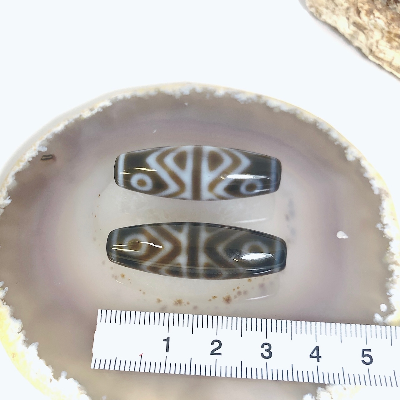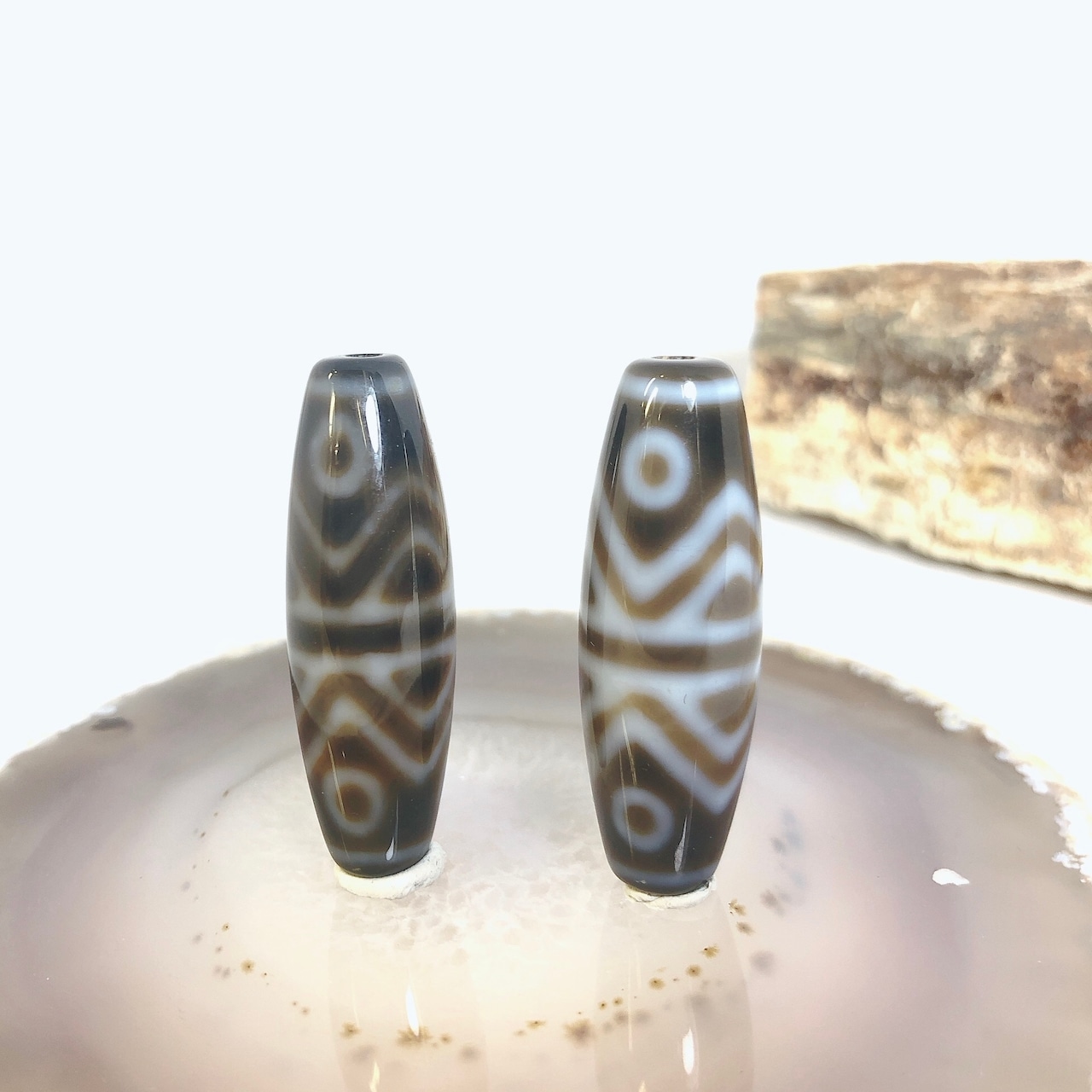 瑪瑙などを円筒に加工し、染料を浸透させて目の模様に焼き付けたもの。
