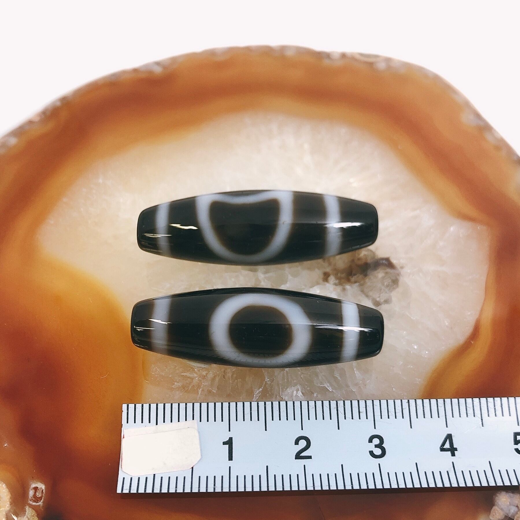 瑪瑙などを円筒に加工し、染料を浸透させて目の模様に焼き付けたもの。