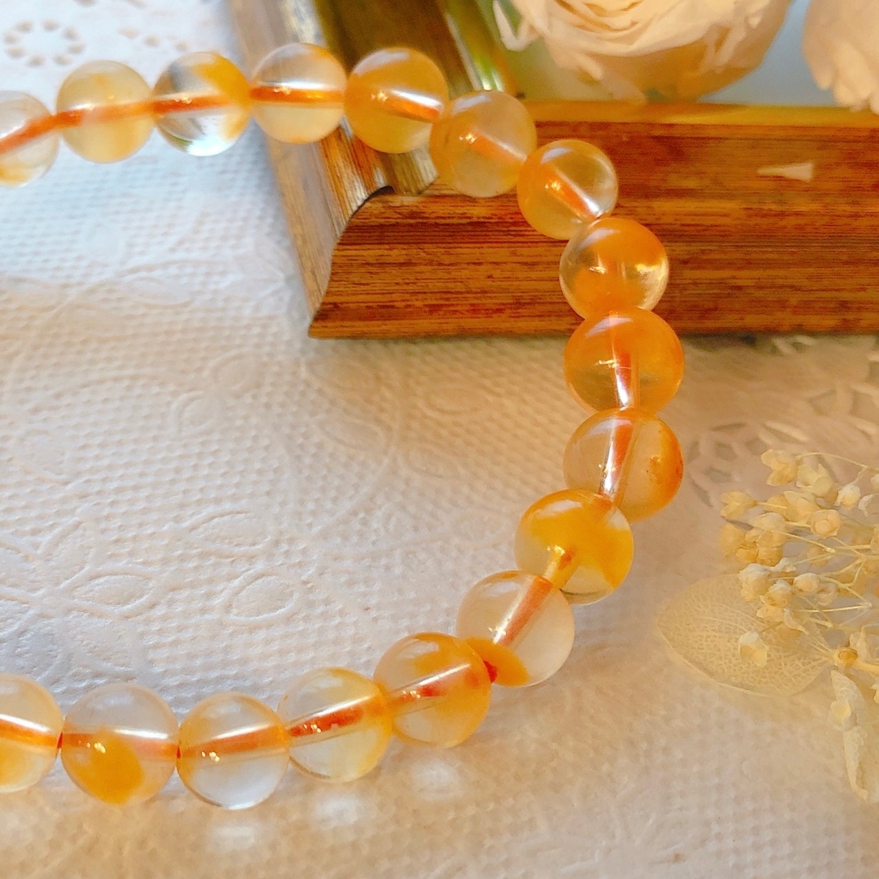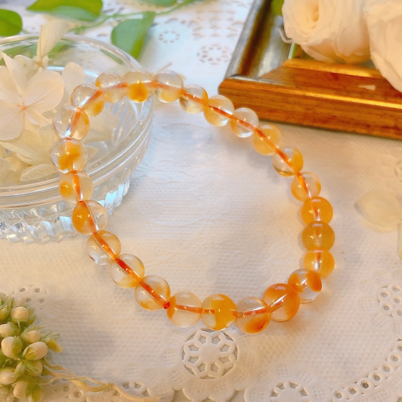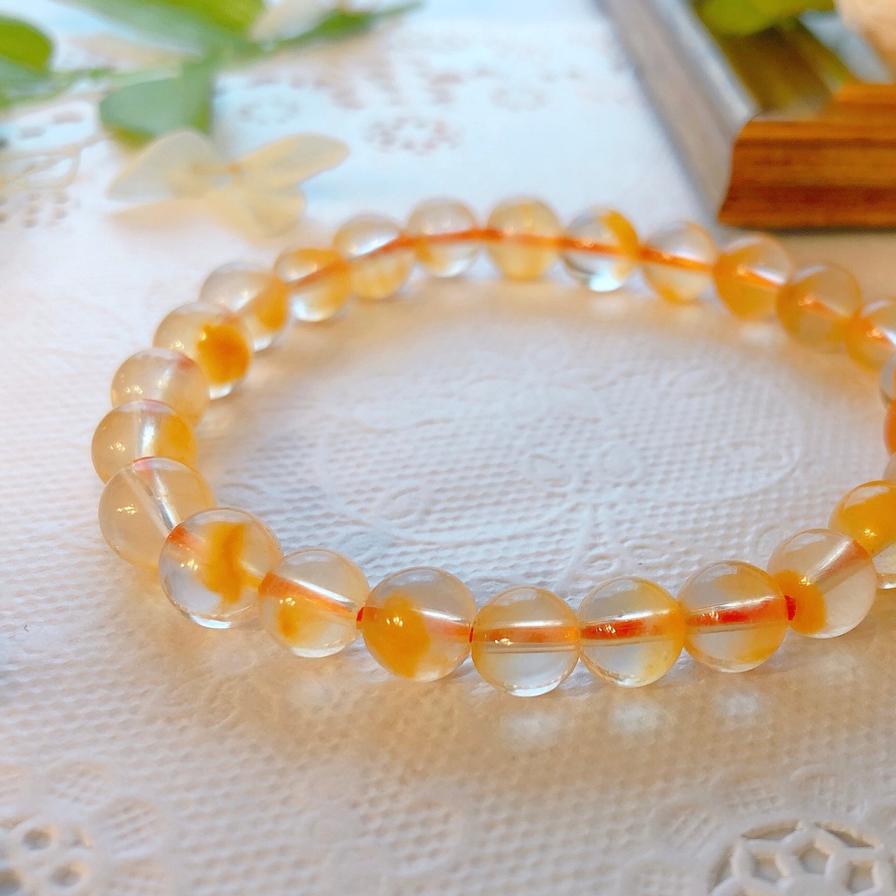 昔はホワイトラビットヘアールチルとして、白色の角閃石入り水晶だけがブレスレットとして出回ってましたが、最近ではこのようにイエローやオレンジなどのカラーバリエーションも豊富になってきました。