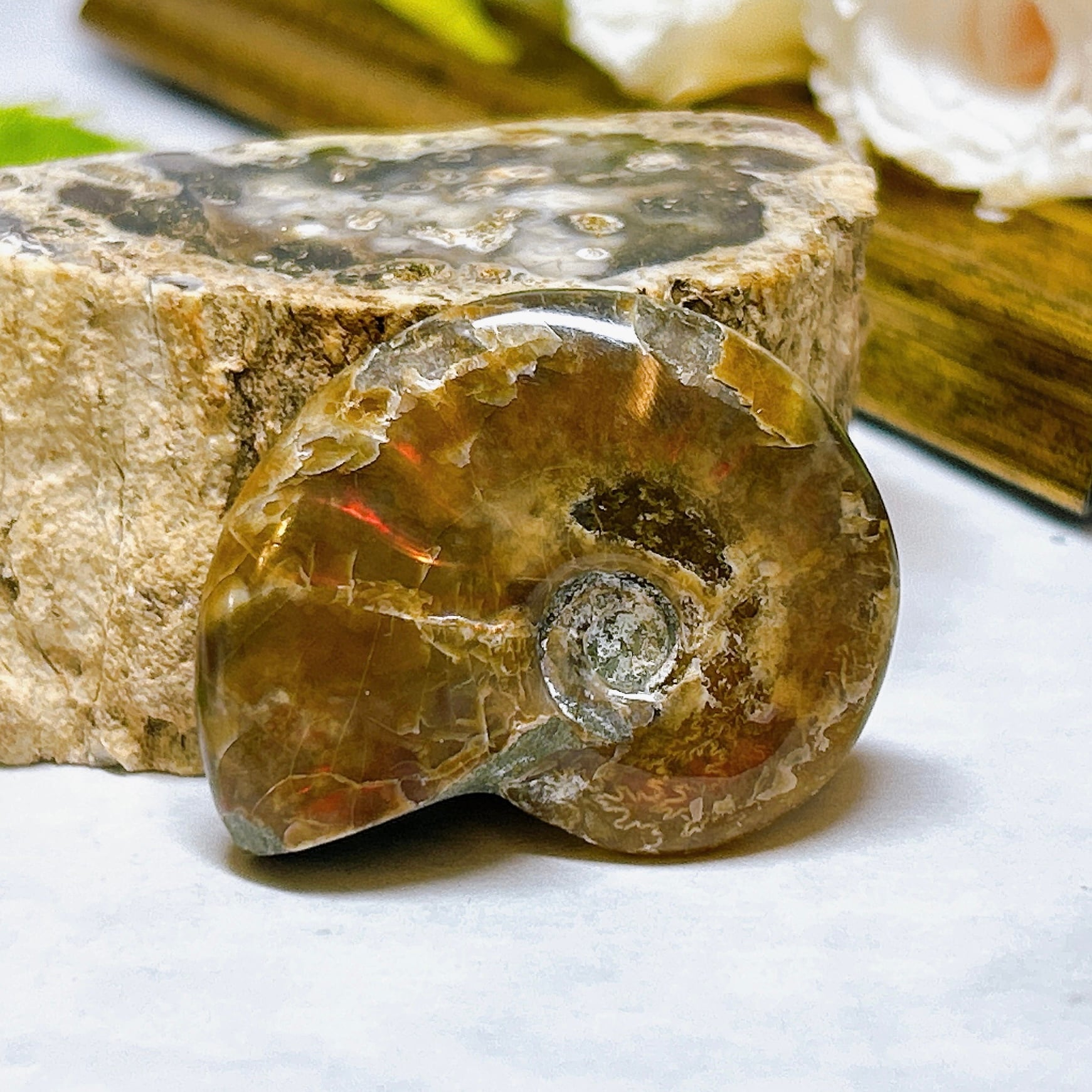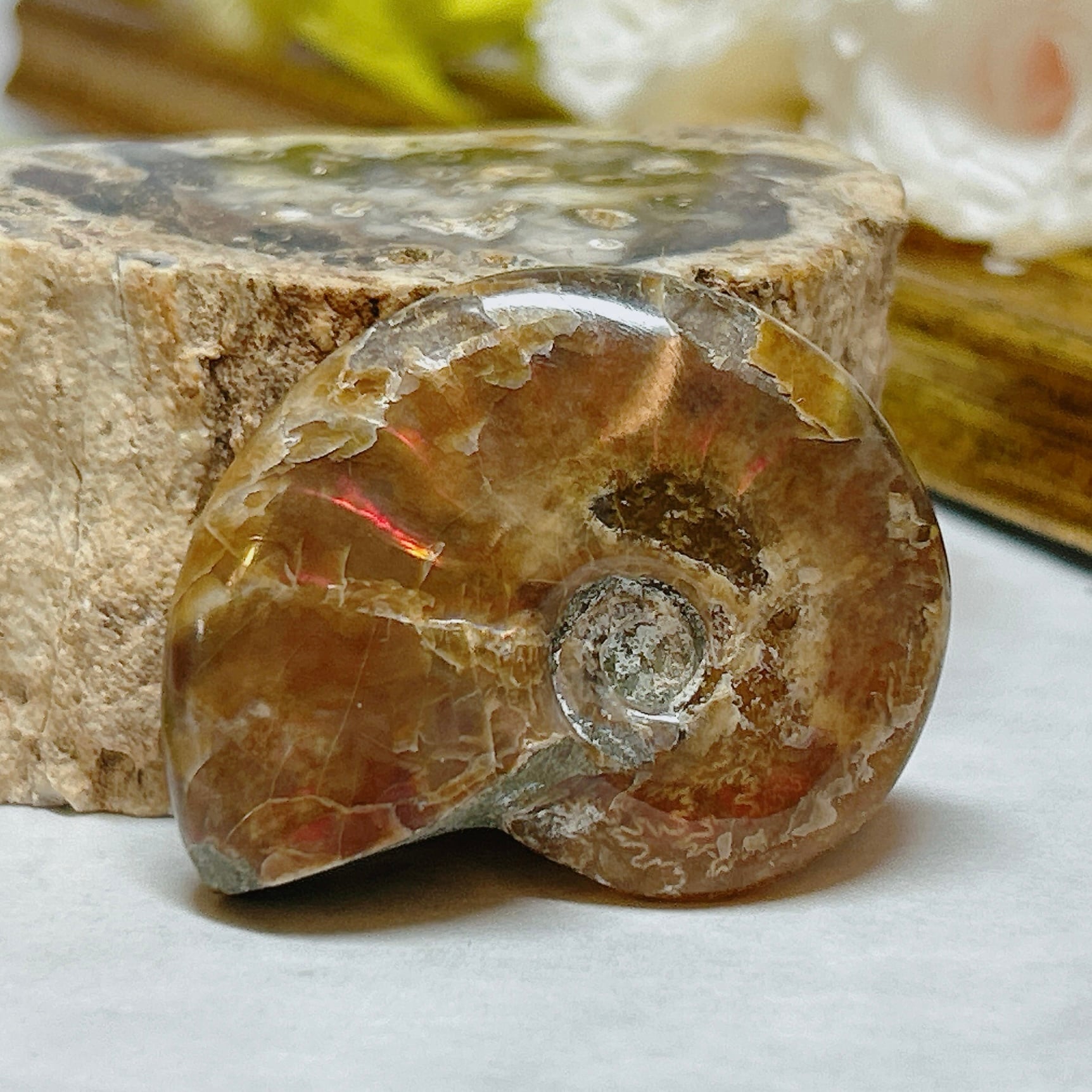 表面の真珠層が赤く輝く美しいアンモナイト。