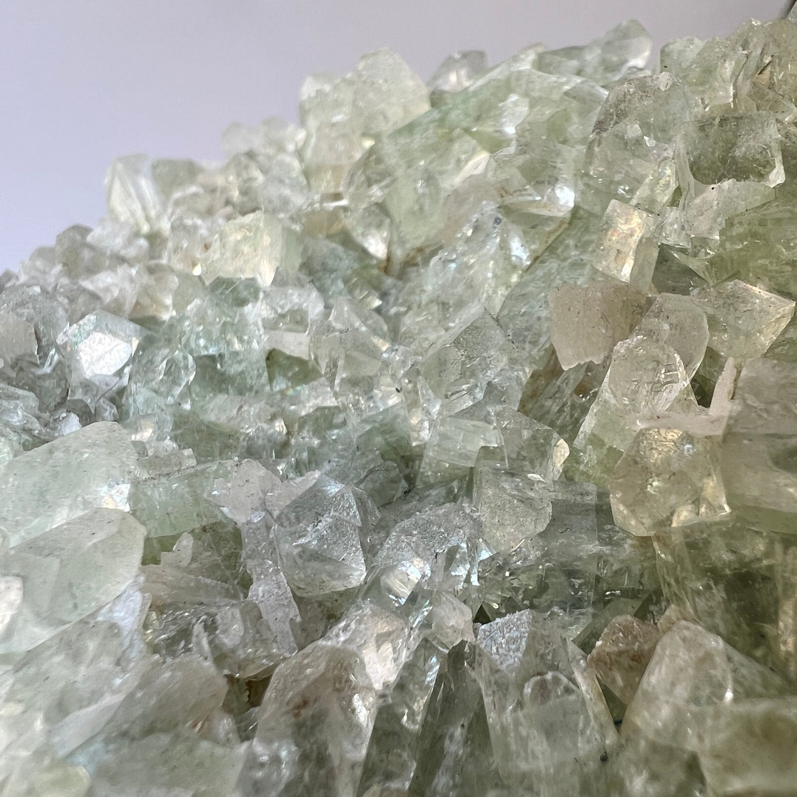 全体的に淡いグリーンですが、一つ一つの結晶は透明感が高く、光をキラリキラリと反射します。