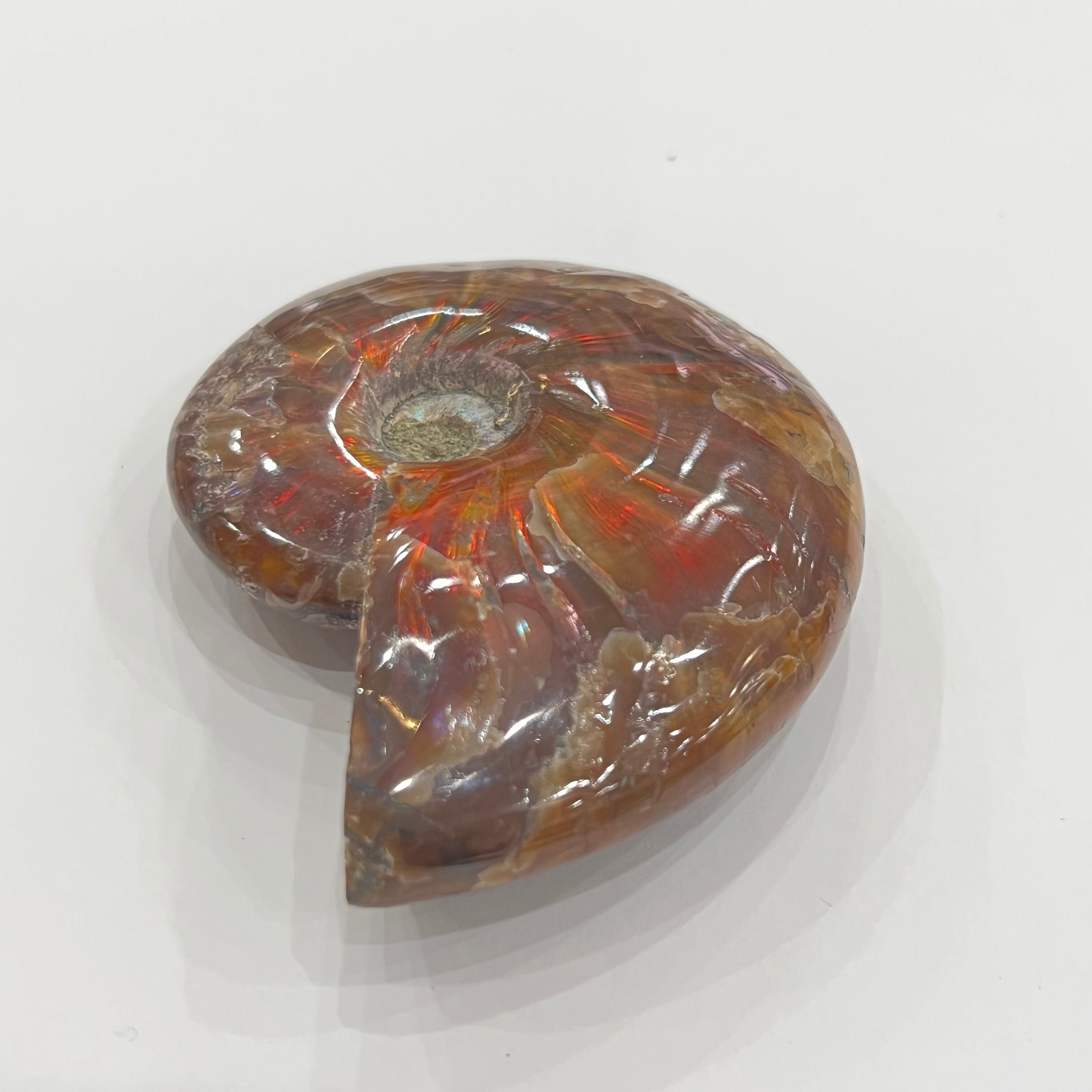 表面の真珠層が赤く輝く美しいアンモナイト。